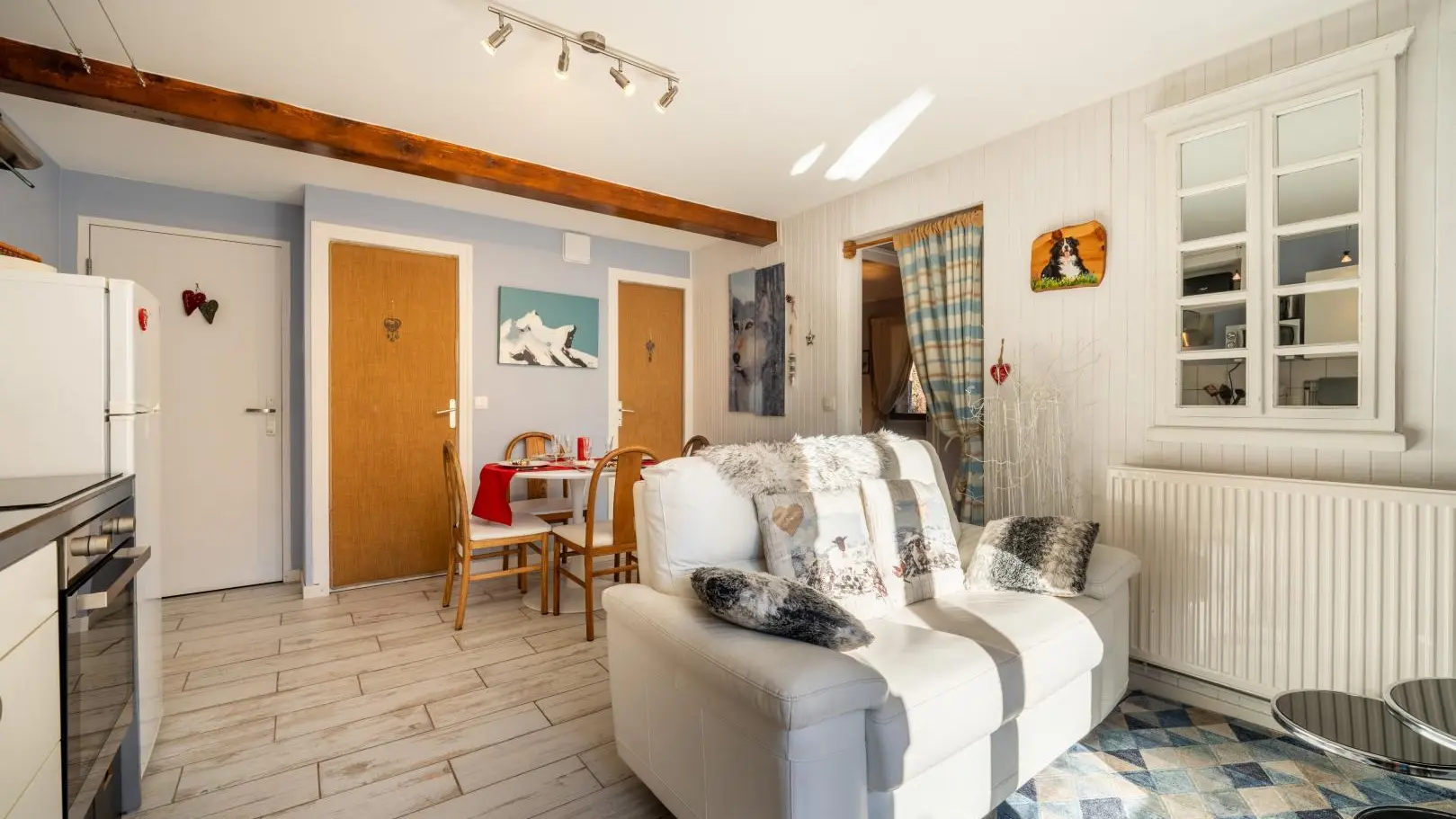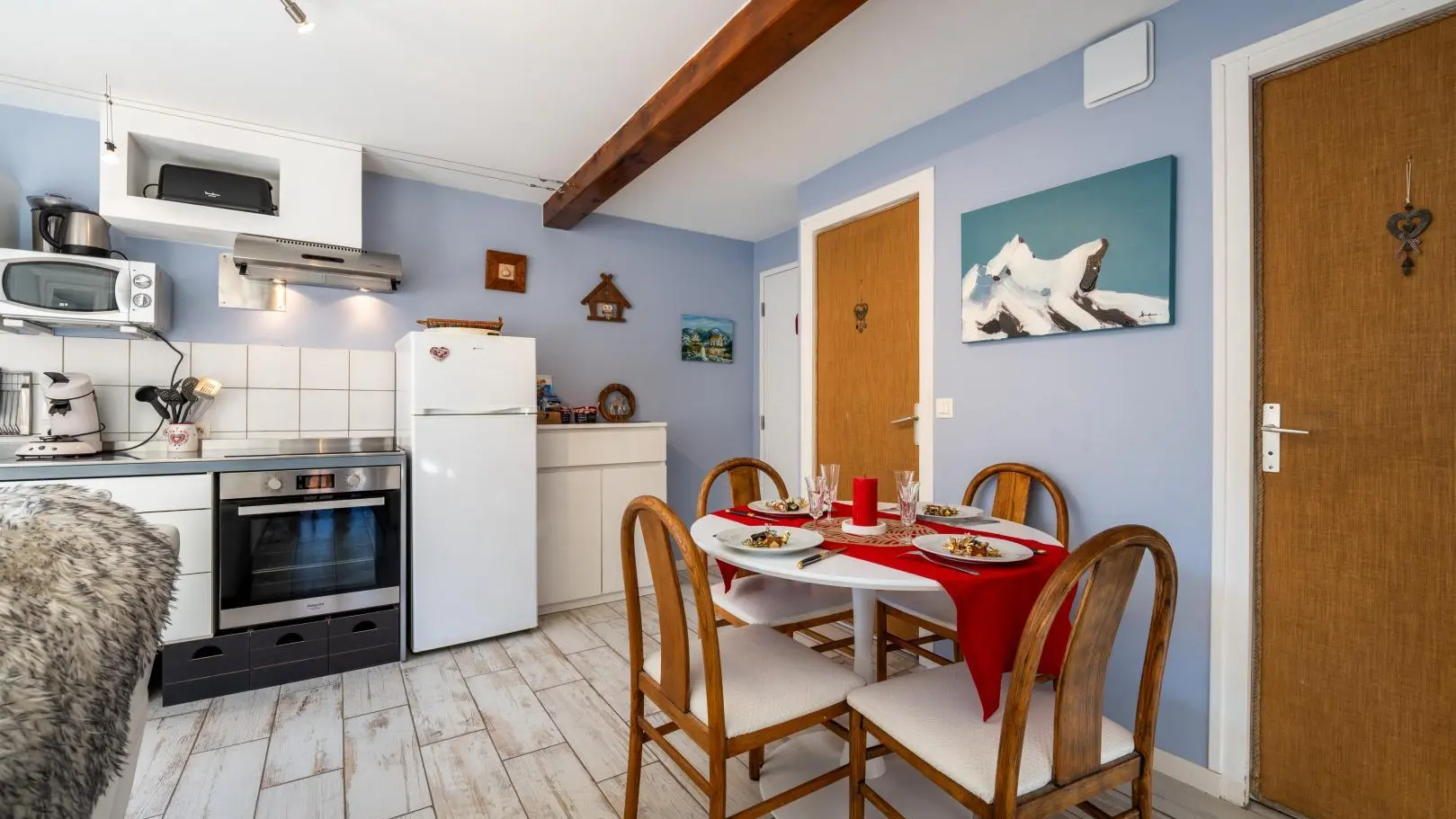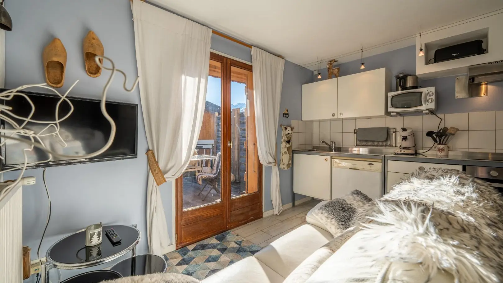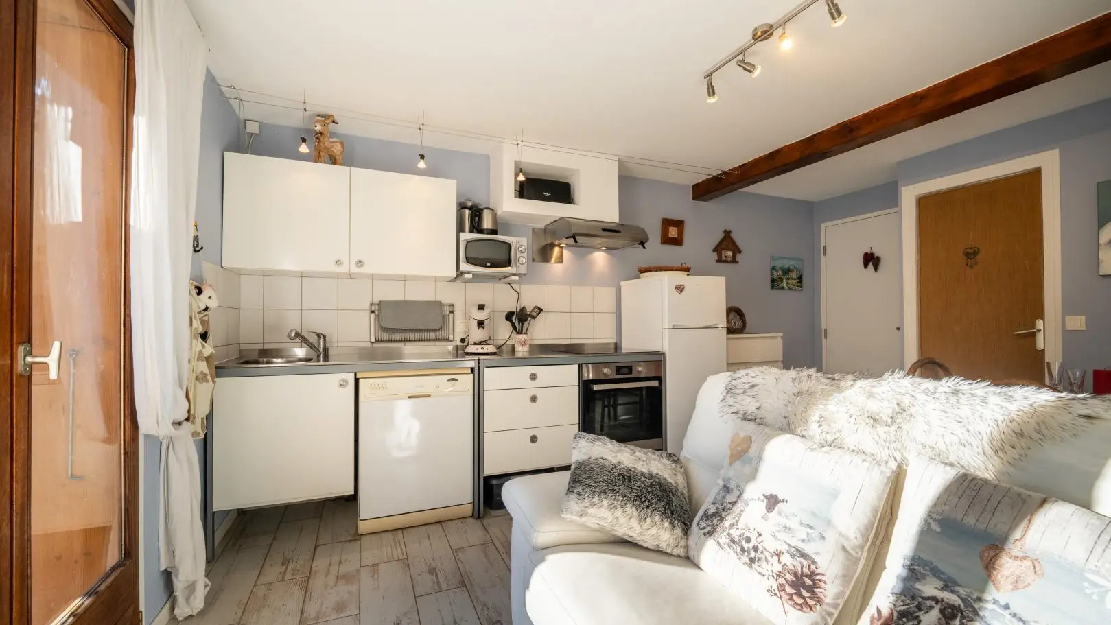 Gîte de 40m² aménagé au rez-de-chaussée d'une ancienne ferme typique de la région restaurée comprenant également 1 autre gite (référence 280046 - gites regroupables) et une autre location. Entrée indépendante par l'arrière du chalet. Petit hall d'entrée, coin cuisine ouverte sur séjour avec accès au balcon (vue montagnes), salle d'eau et WC indépendant.