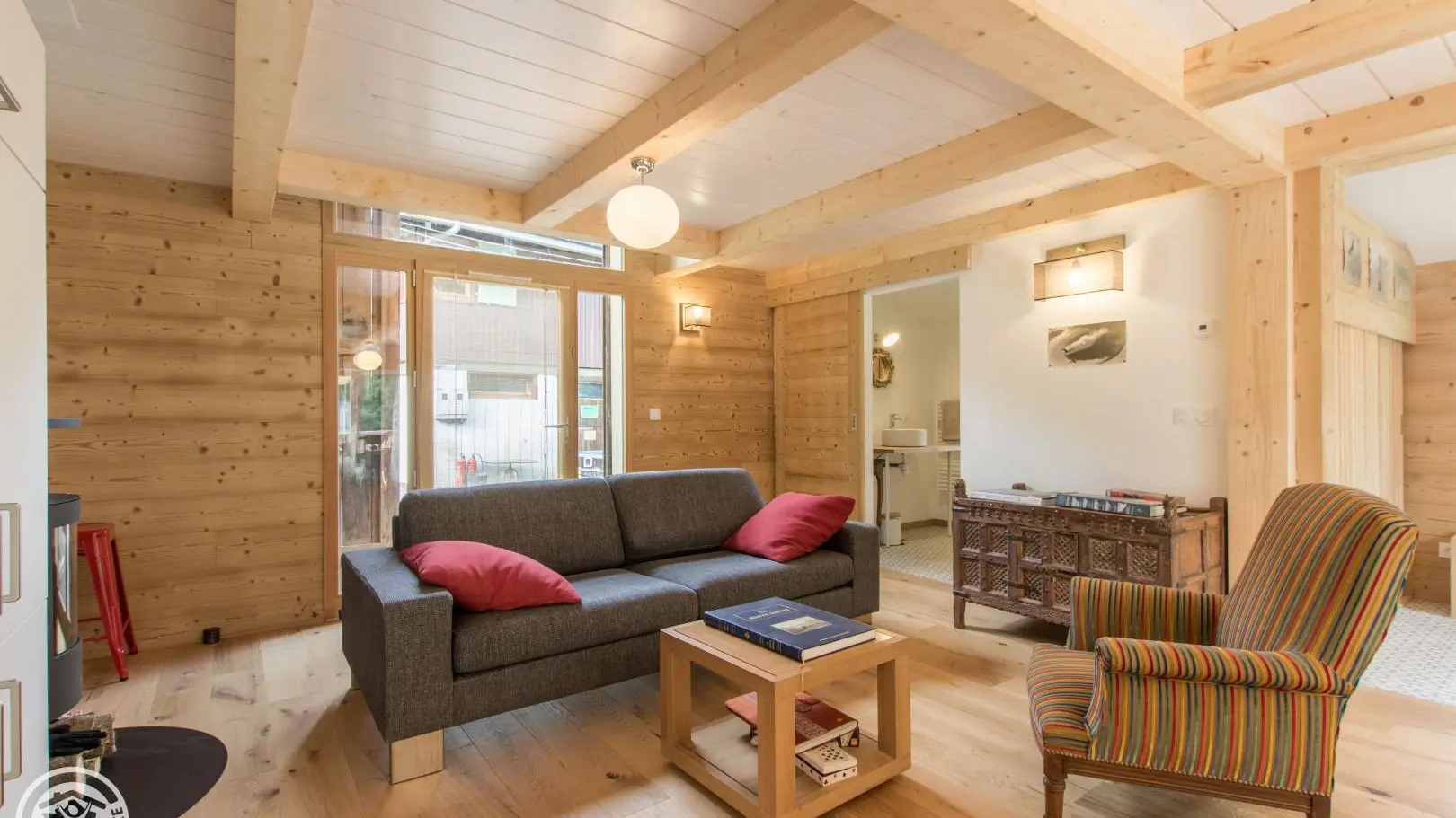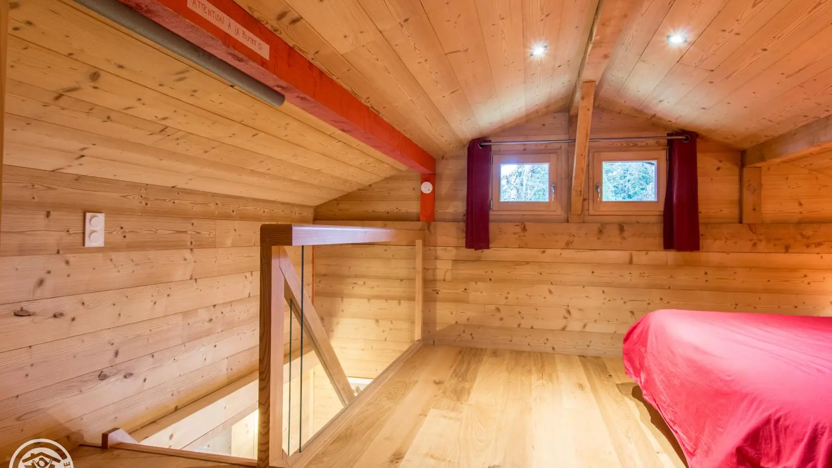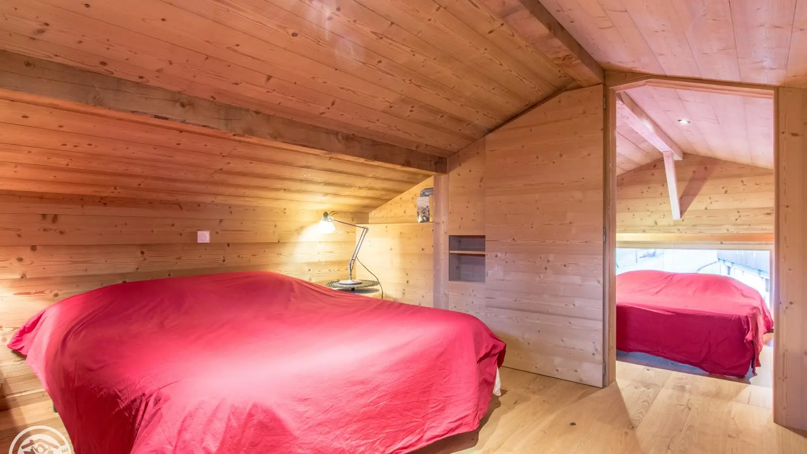 Hall d'entrée, cuisine intégrée ouverte sur le séjour (canapé, télévision, poêle à bois avec bois inclus), baie vitrée donnant sur la terrasse-balcon. Salle d'eau (douche) / wc. En duplex, 2 espaces nuit : 1er espace nuit en mezzanine avec 1 lit 160x190cm séparable en 2 lits 80x190cm. 2ème espace nuit avec 1 lit 140x190cm (présence d'un puits de lumière/ouverture donnant sur le séjour).
