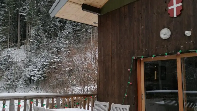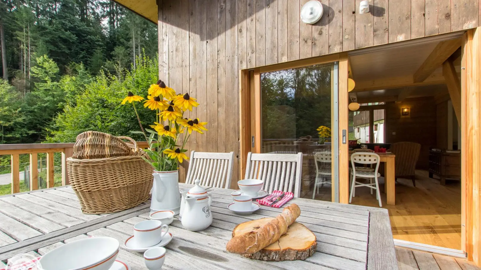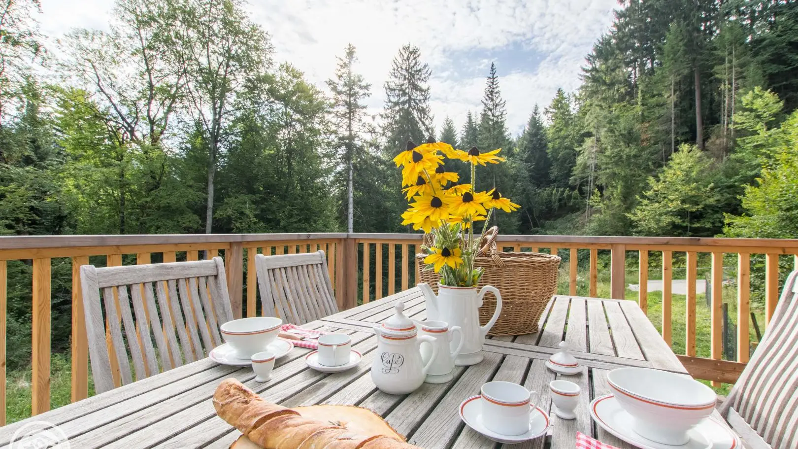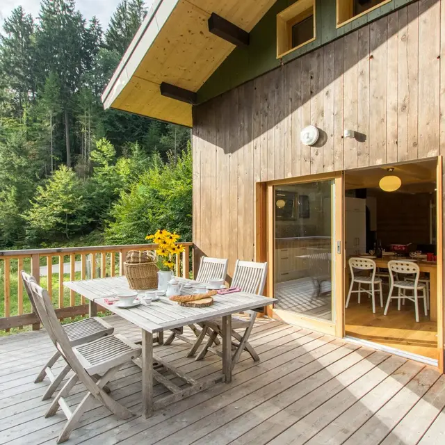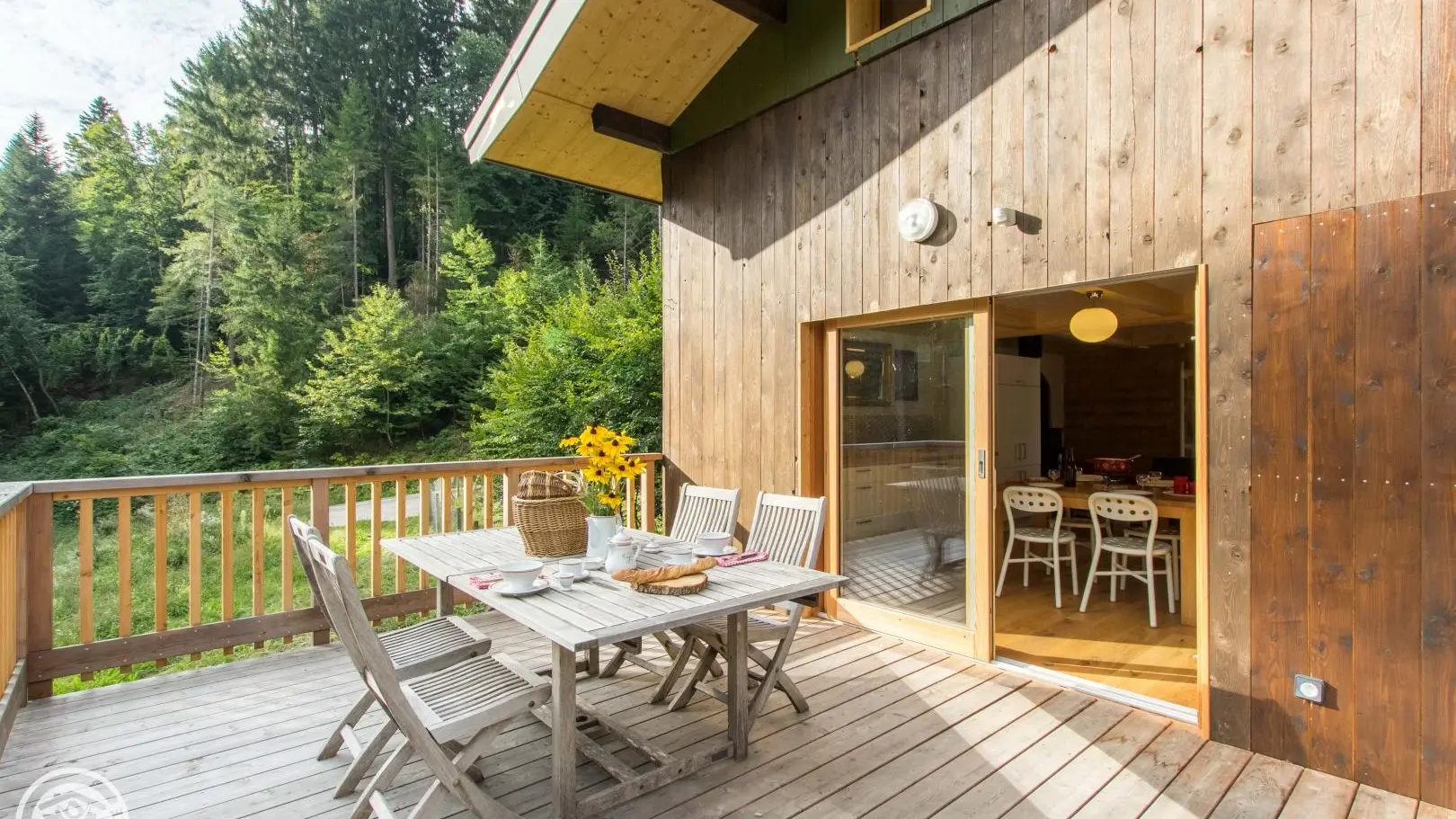 Grande terrasse-balcon avec salon de jardin, transats, barbecue. Vue sur la forêt. Terrain.