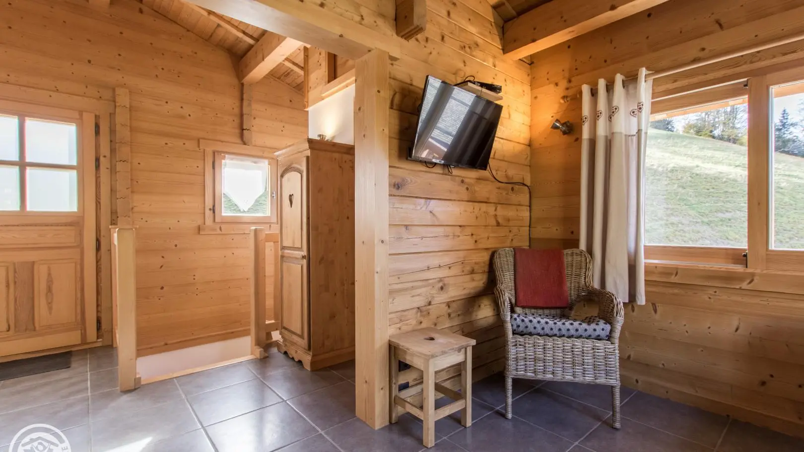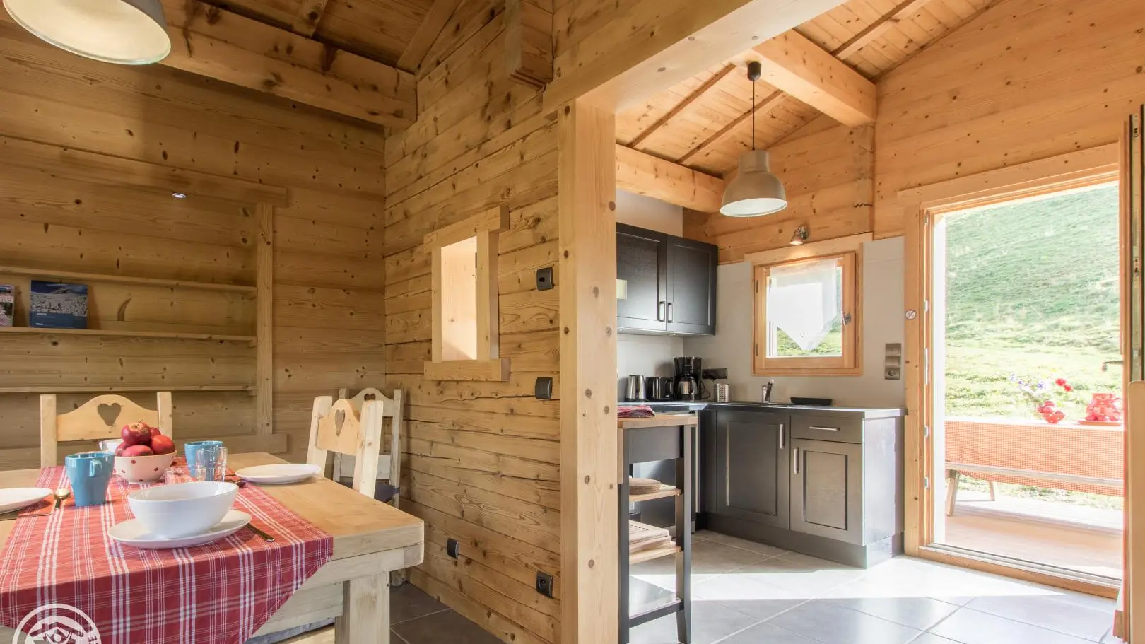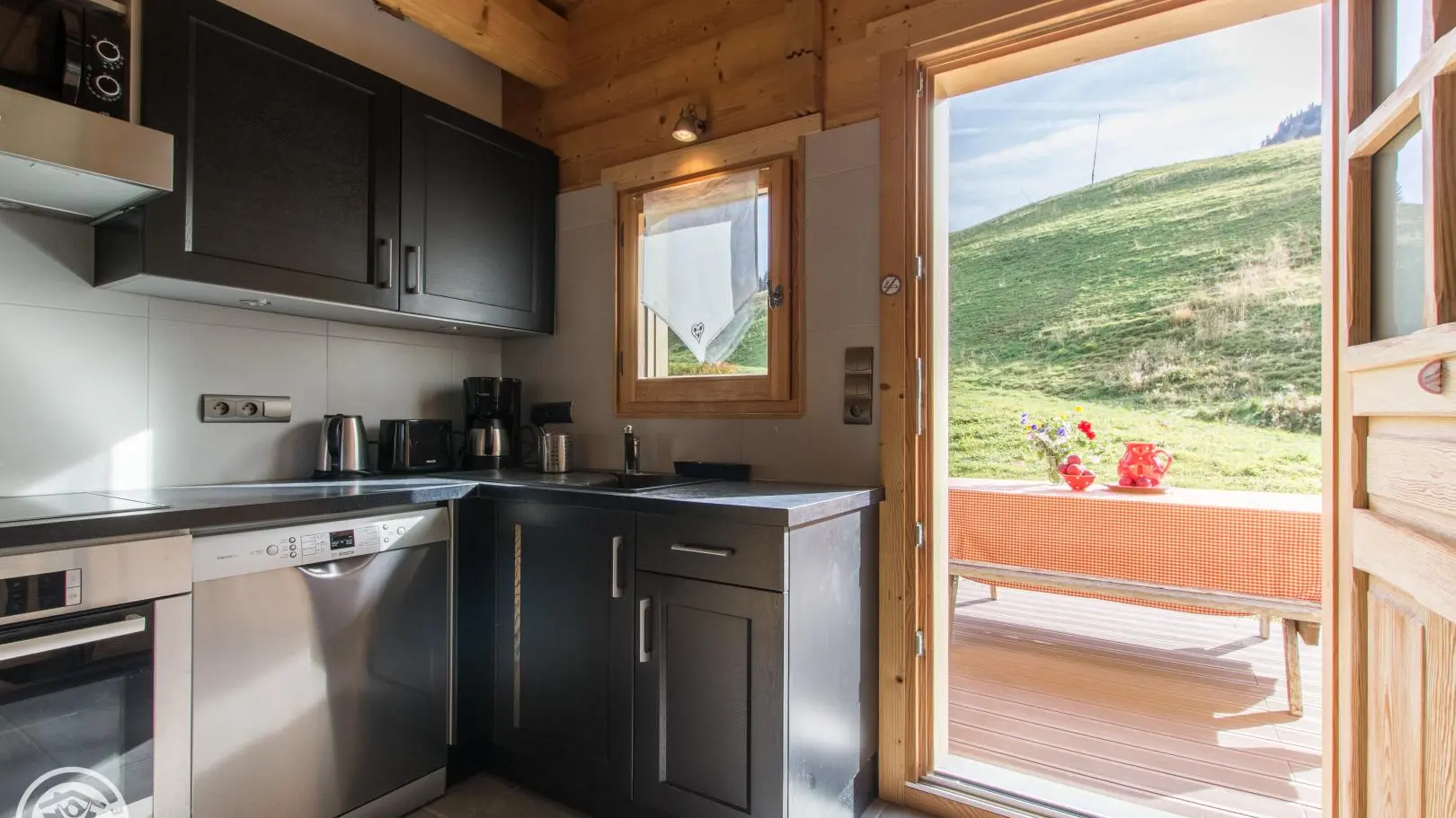 Entrée par rez-de-chaussée ou par 1er étage (escalier extérieur). 1er étage du chalet : cuisine intégrée ouverte sur séjour, accès au balcon et à la belle terrasse. wc indépendant.