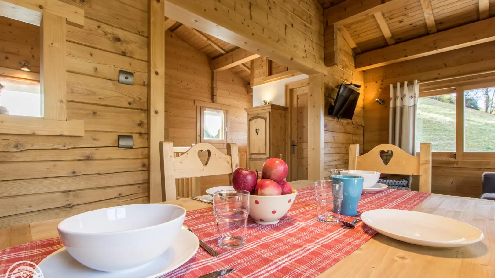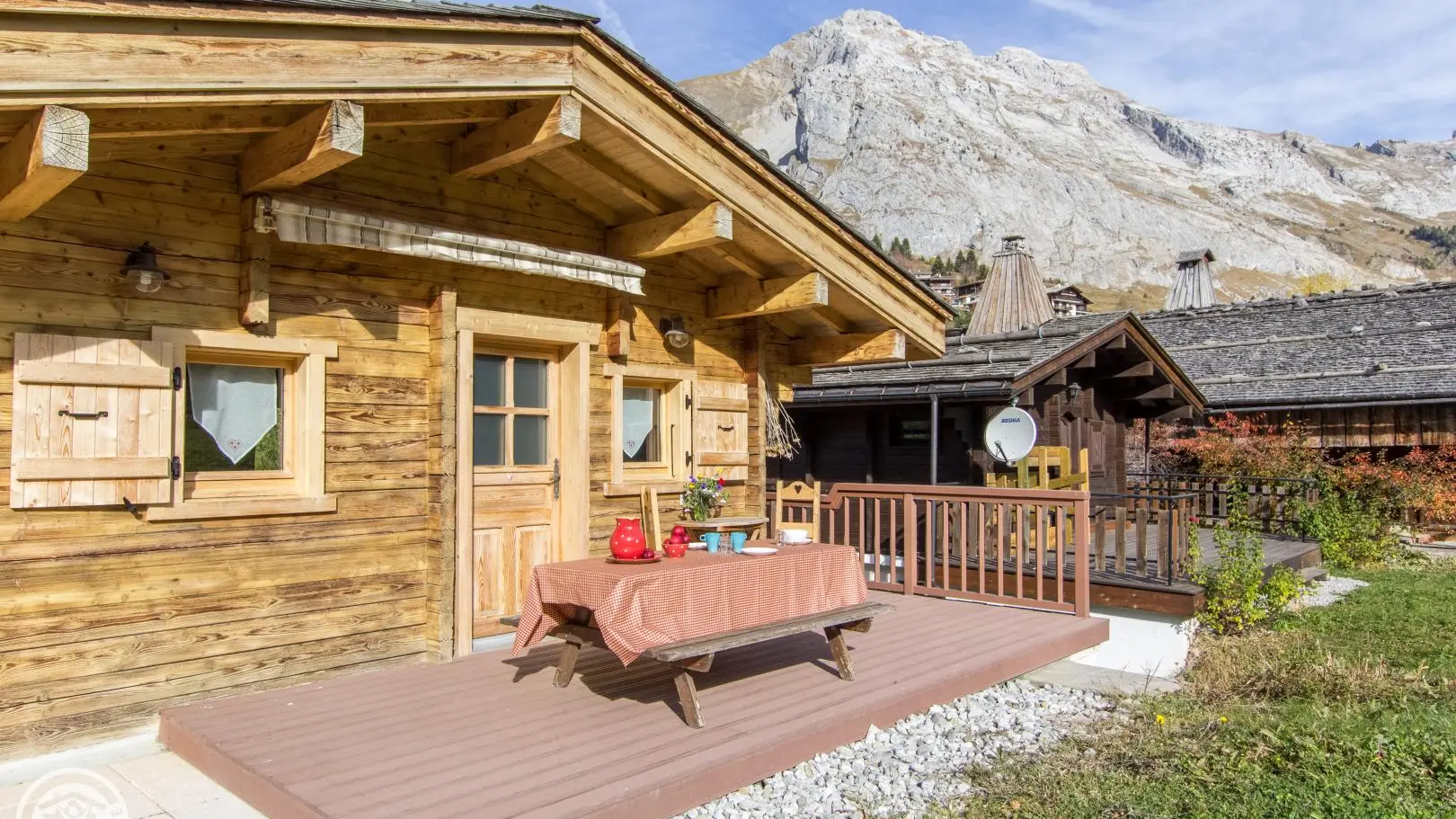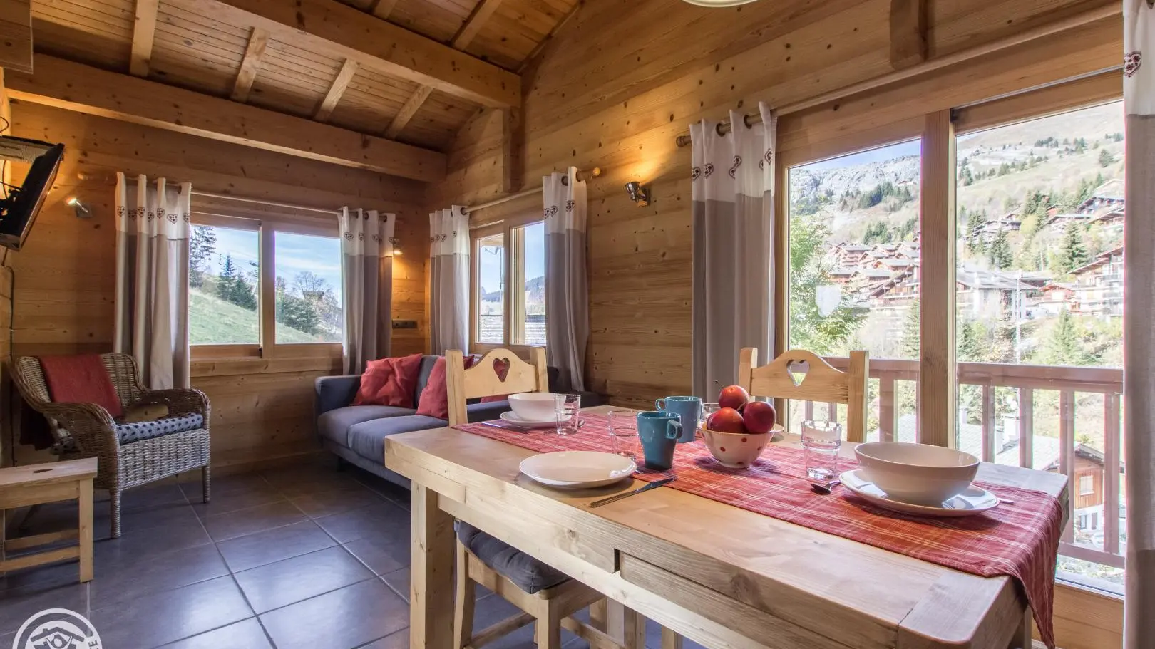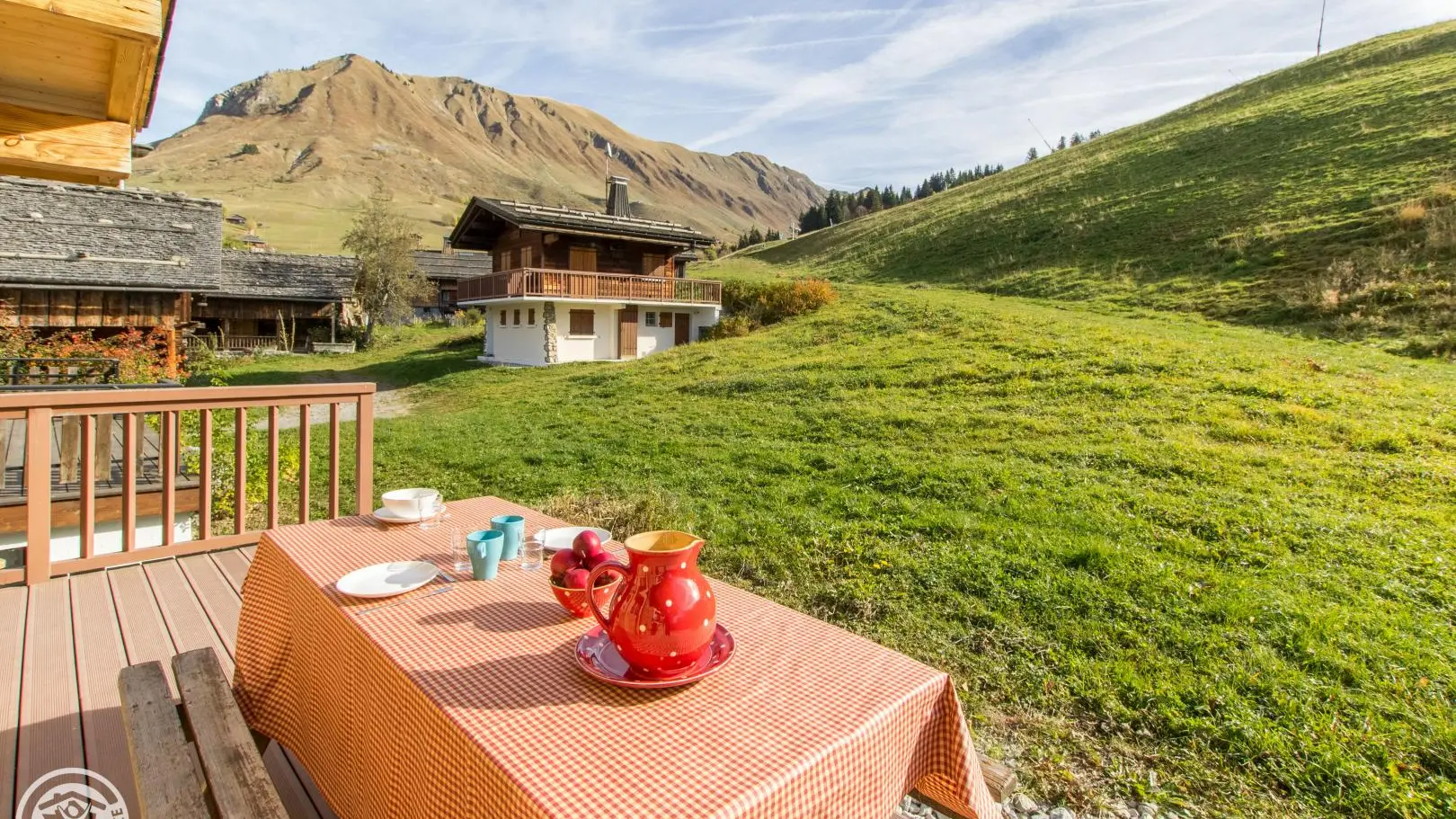 Chalet indépendant de 65m² aménagé sur 2 niveaux avec terrasse privative. Emplacement idéal été comme hiver, face aux montagnes, sur les pistes l'hiver. (piste verte à côté du chalet et rassemblement cours ESF à 200 m)