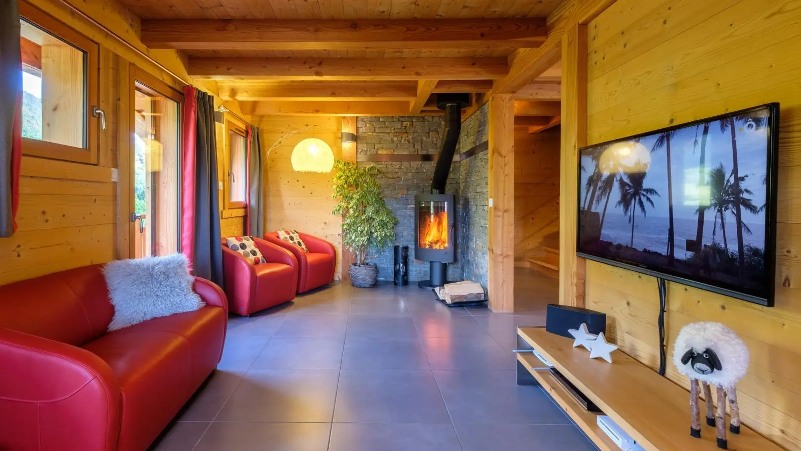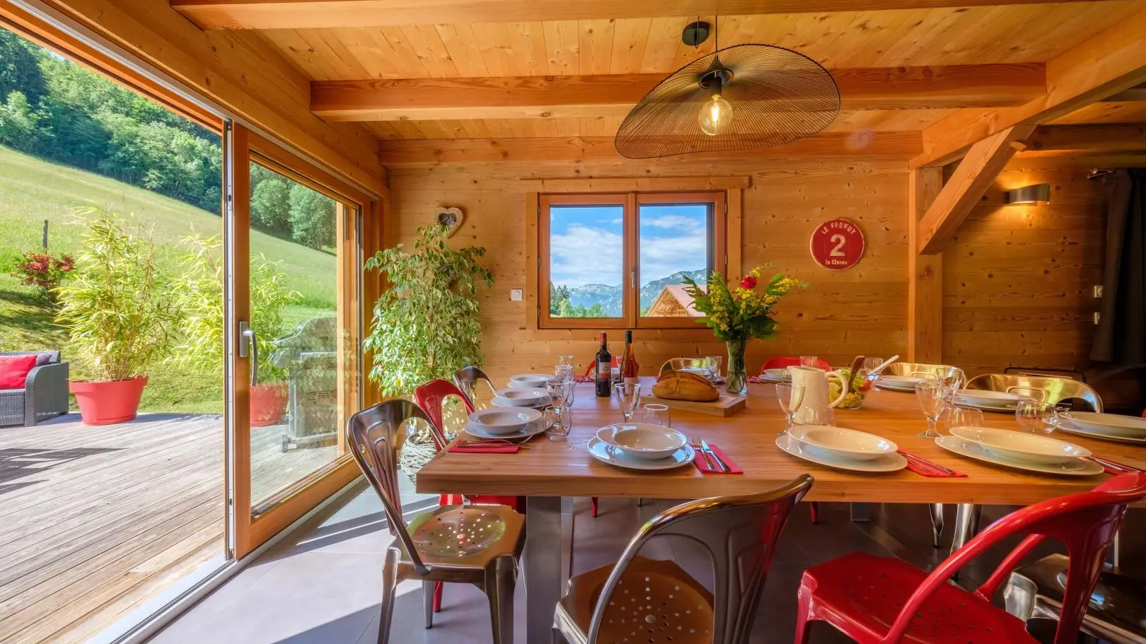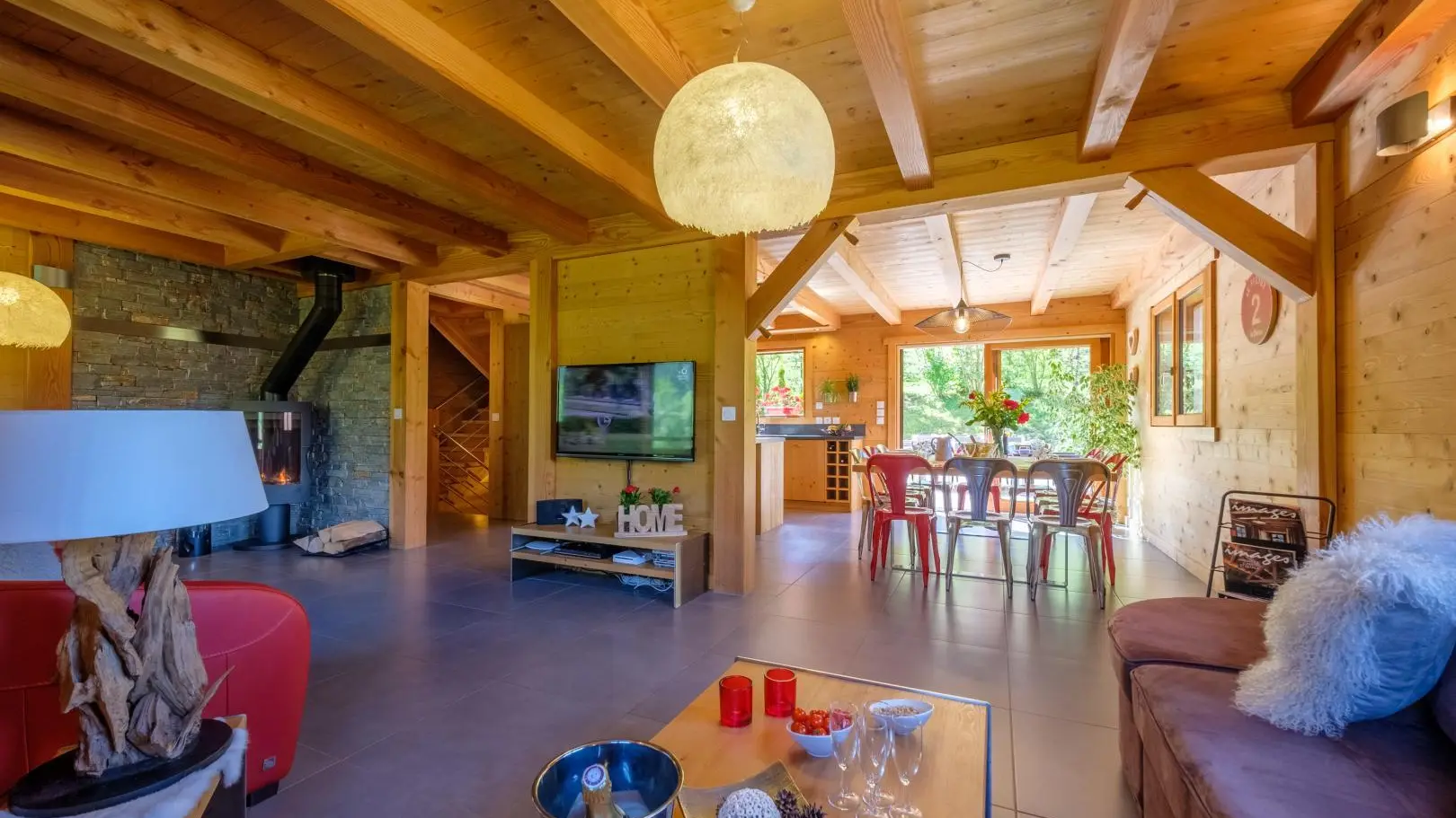 1er étage du chalet : cuisine entièrement équipée ouverte sur l'espace repas et le salon (poêle à bois avec bois fourni, canapés, télévision connectée, console de jeux), baie vitrée donnant accès à la grande terrasse bois. Réduit avec réfrigérateur supplémentaire. Chambre 2 (1 lit double 160x200cm, tv), salle d'eau, wc indépendant.