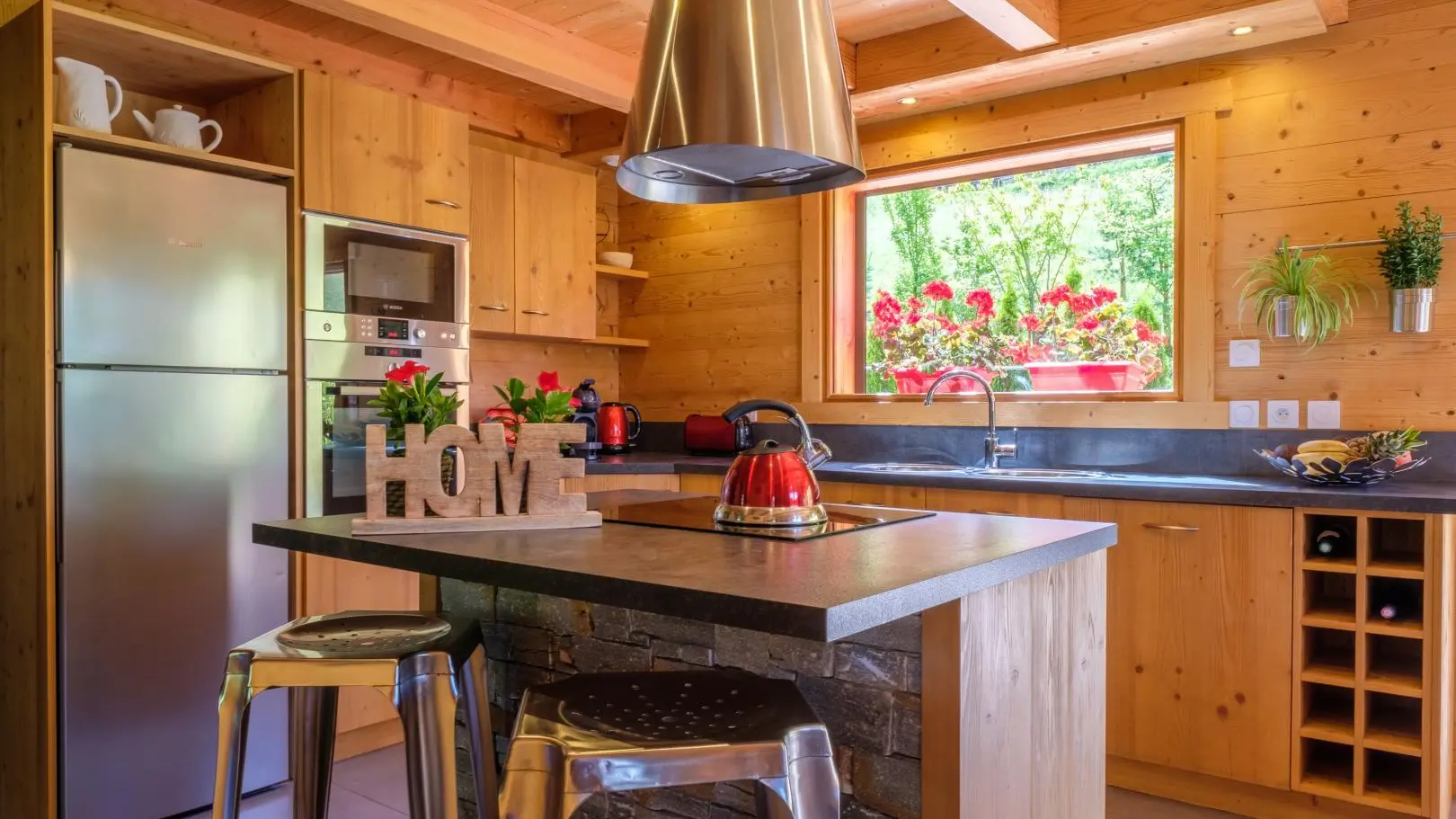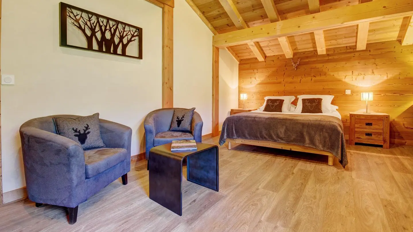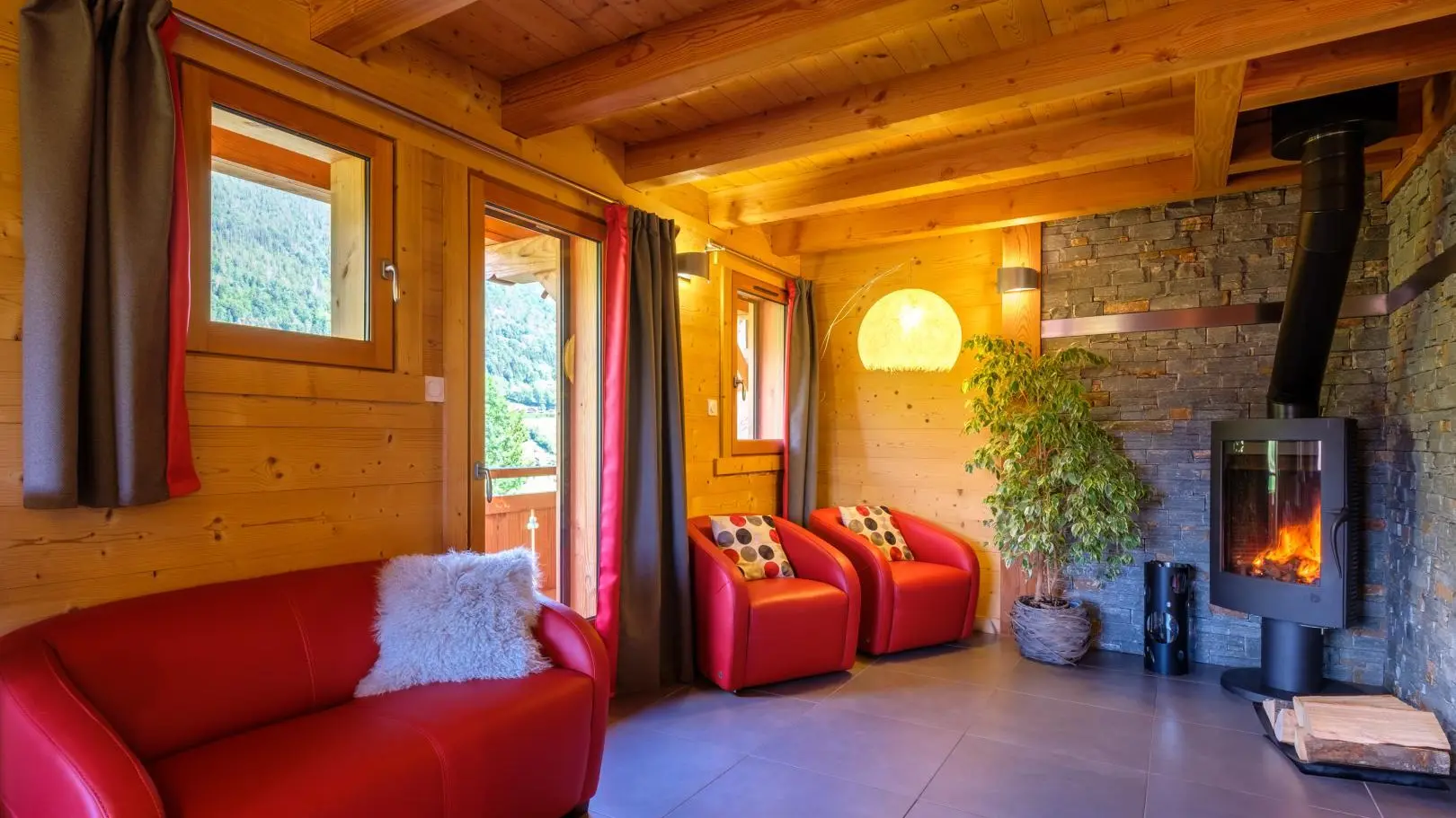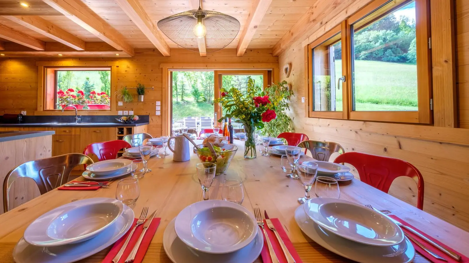 1er étage du chalet : cuisine entièrement équipée ouverte sur l'espace repas et le salon (poêle à bois avec bois fourni, canapés, télévision connectée, console de jeux), baie vitrée donnant accès à la grande terrasse bois. Réduit avec réfrigérateur supplémentaire. Chambre 2 (1 lit double 160x200cm, tv), salle d'eau, wc indépendant.