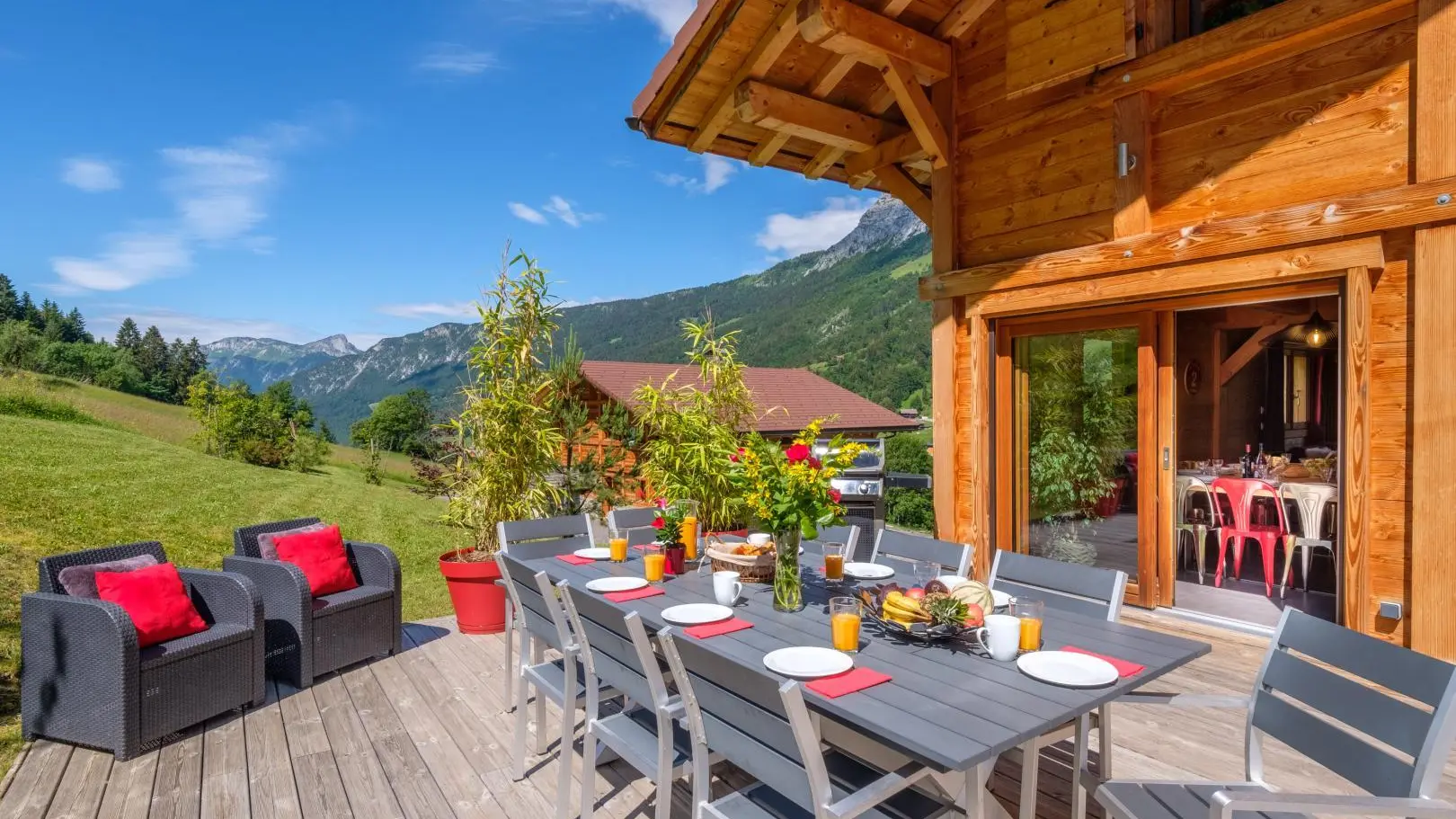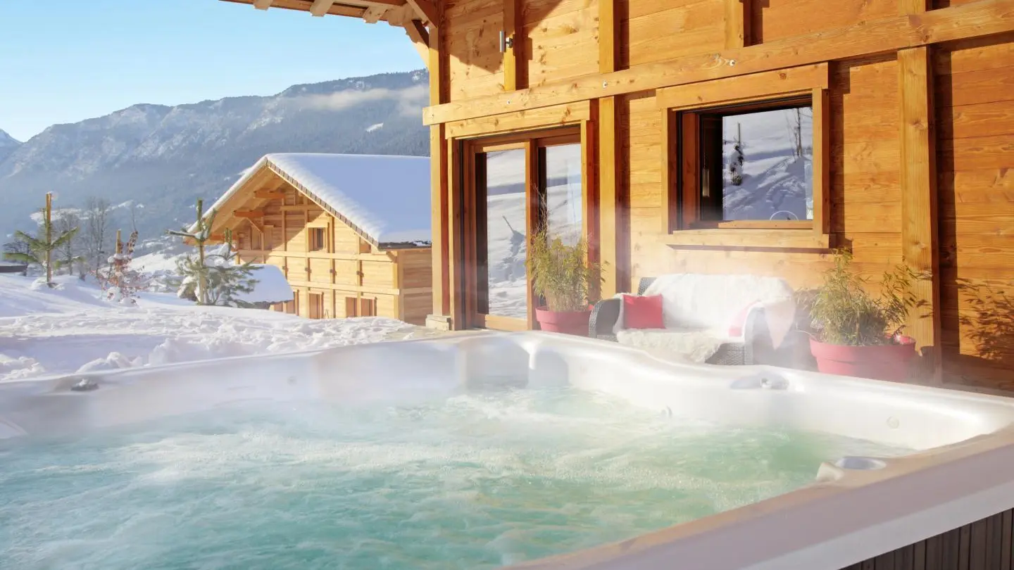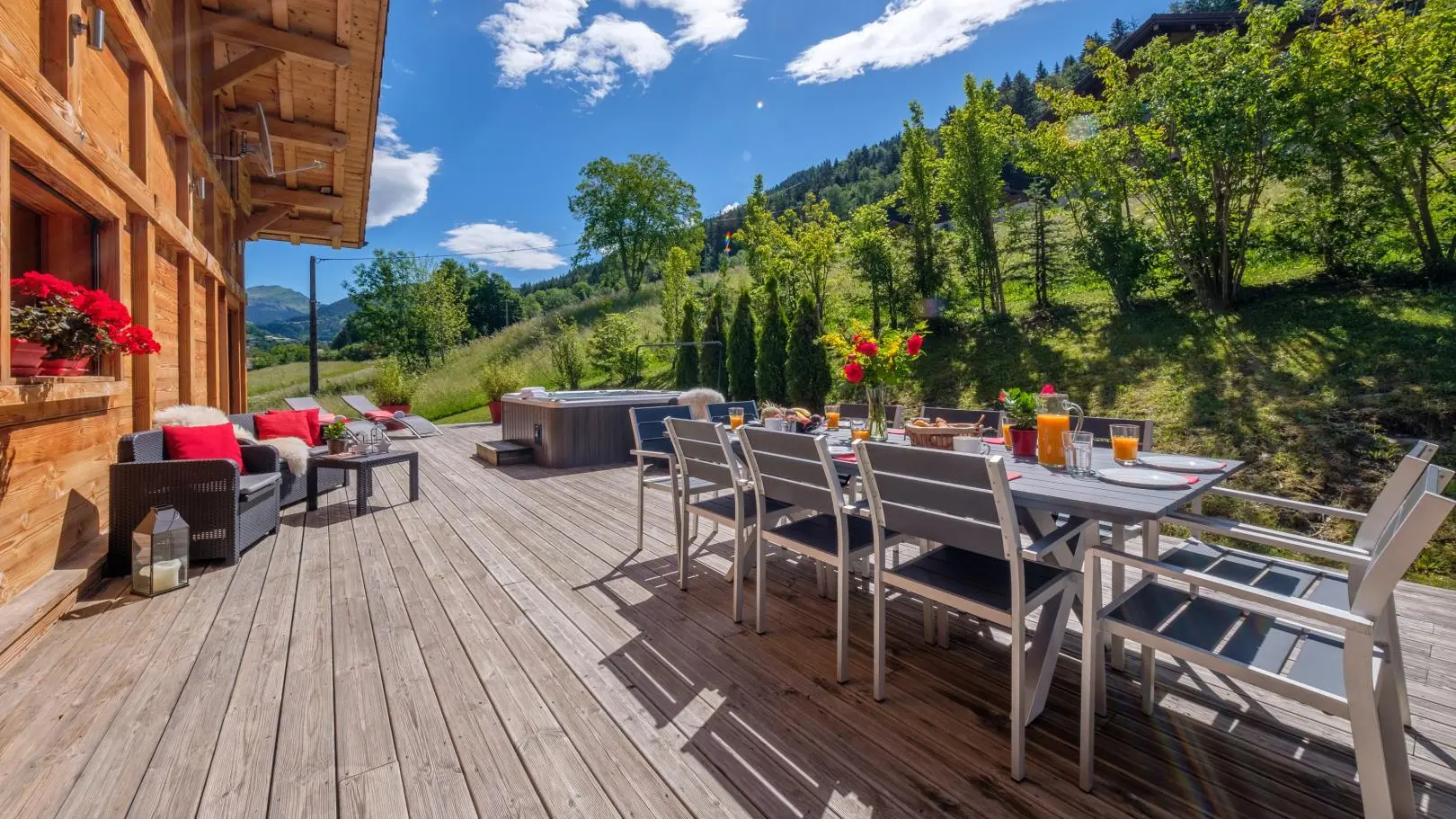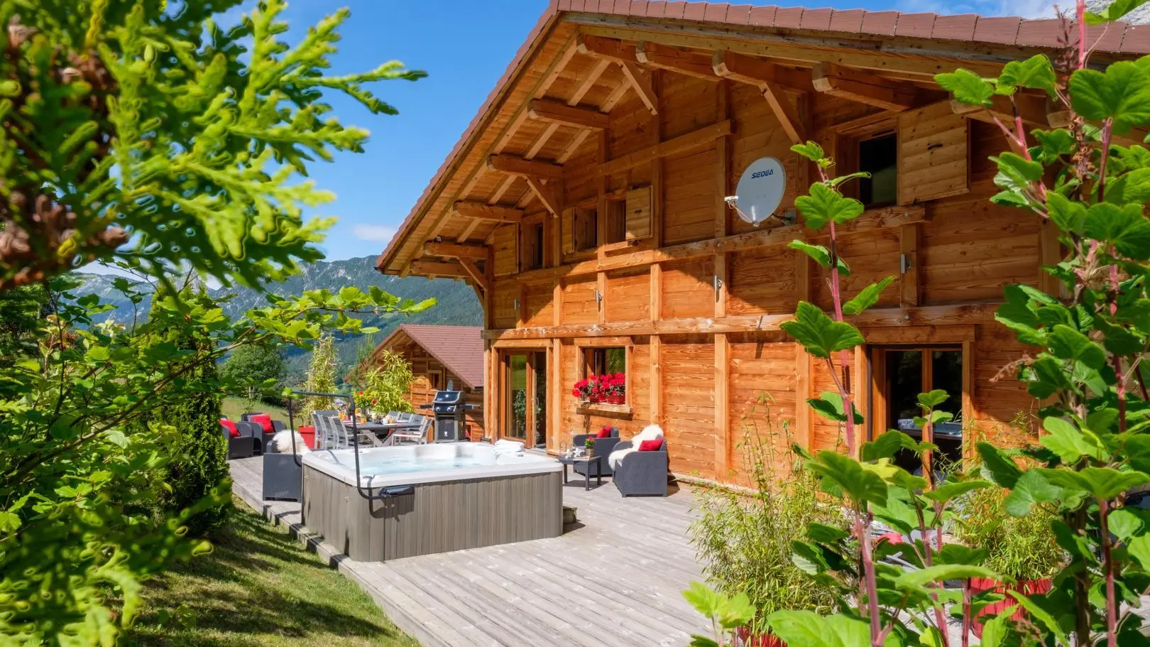 Grande terrasse bois avec jacuzzi privatif, salon de jardin, barbecue, transats. Balcons. Terrain en pente sur l'arrière du chalet.