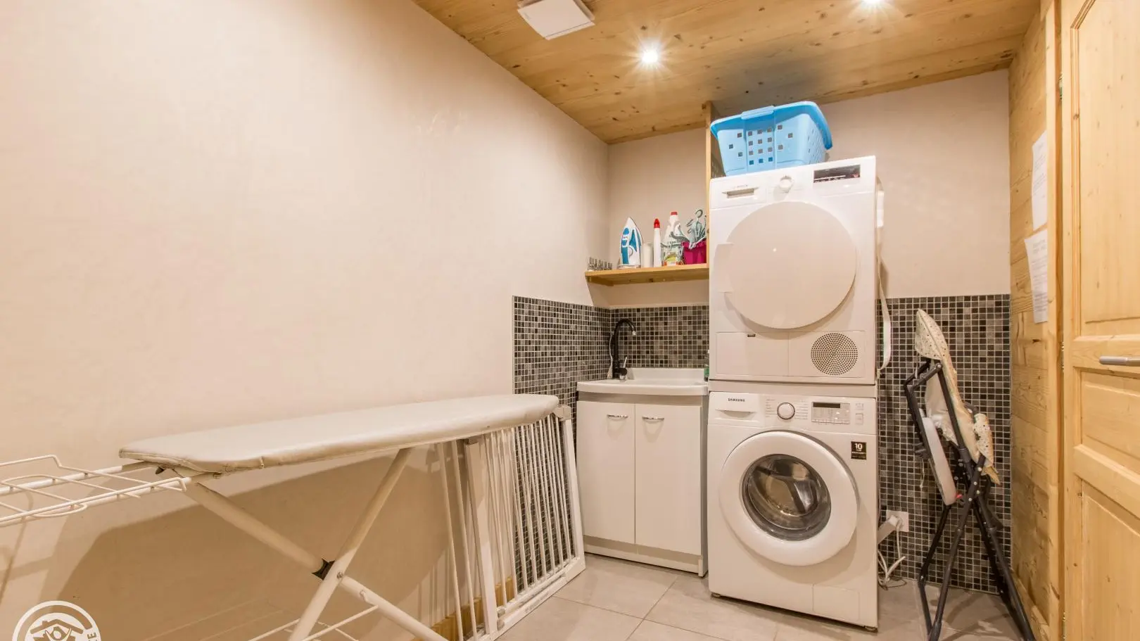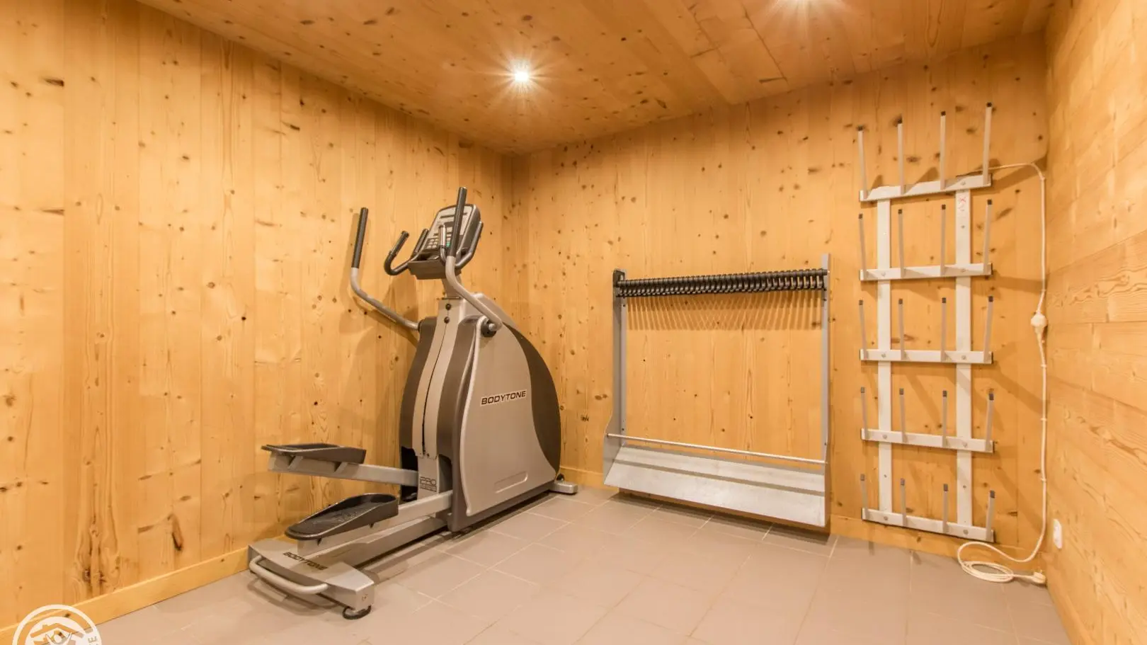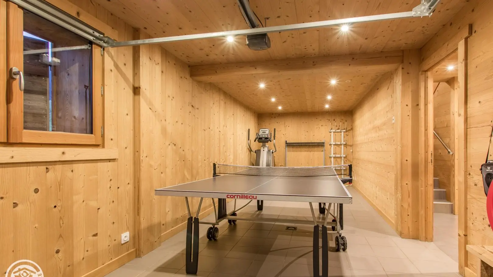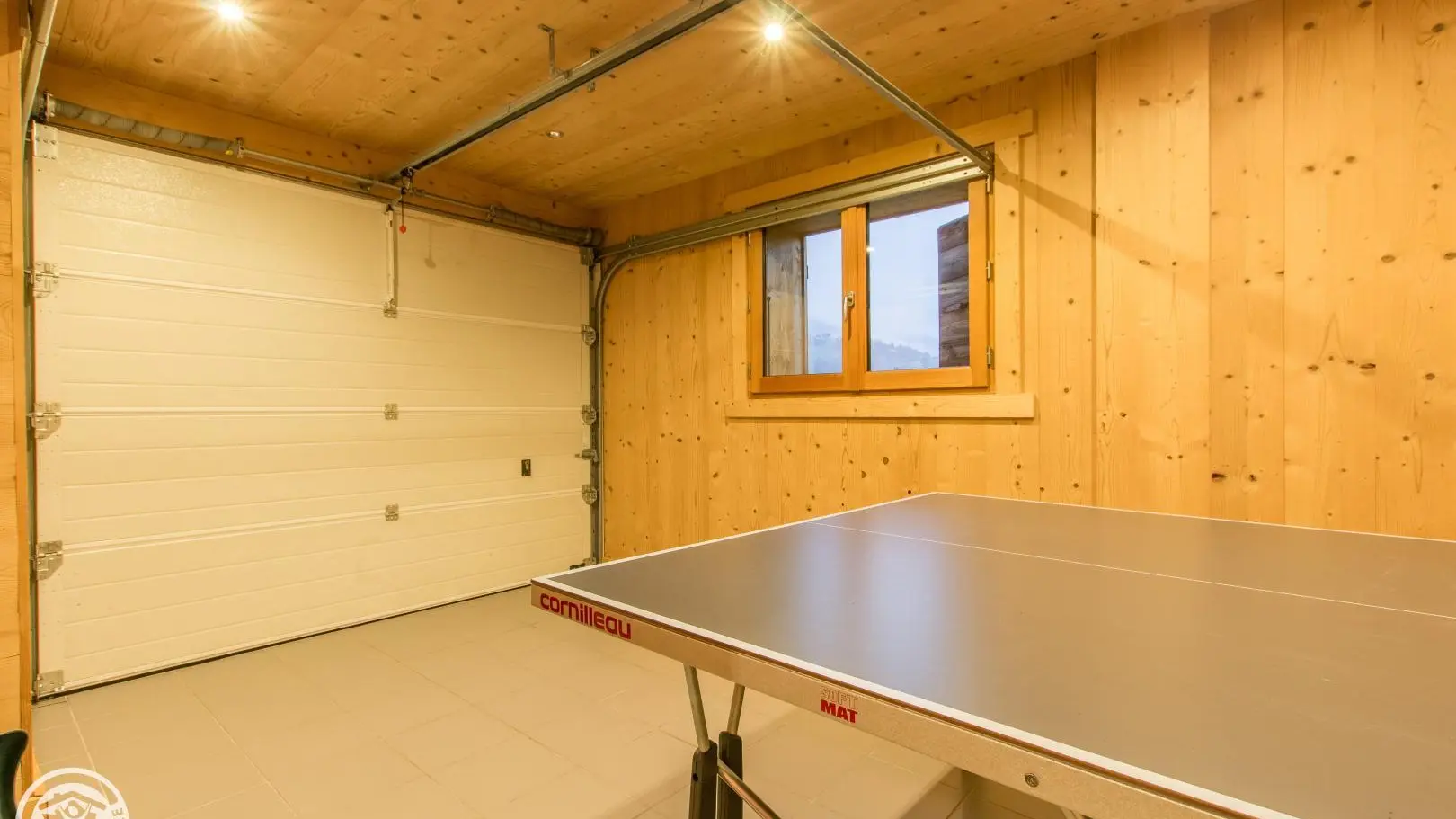 Rez-de-chaussée du chalet : hall d'entrée, chambre 1 pour 4 personnes (1 lit double 160x200cm + 2 lits 90x190cm superposés, salle d'eau/wc), buanderie (lave et sèche-linge), garage carrelé avec table ping-pong, vélo elliptique, espace skiroom (rack à skis et sèche-chaussures).