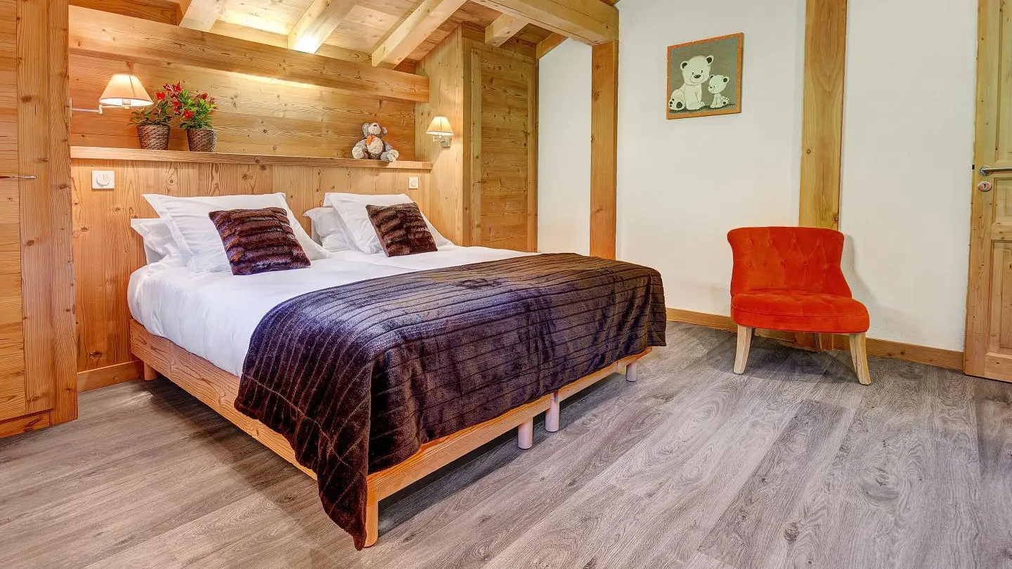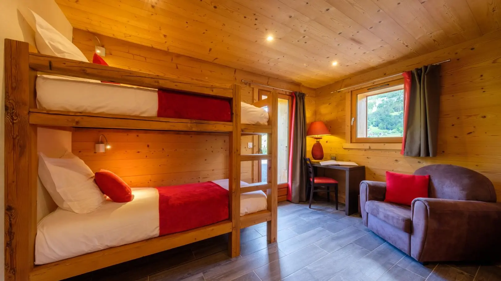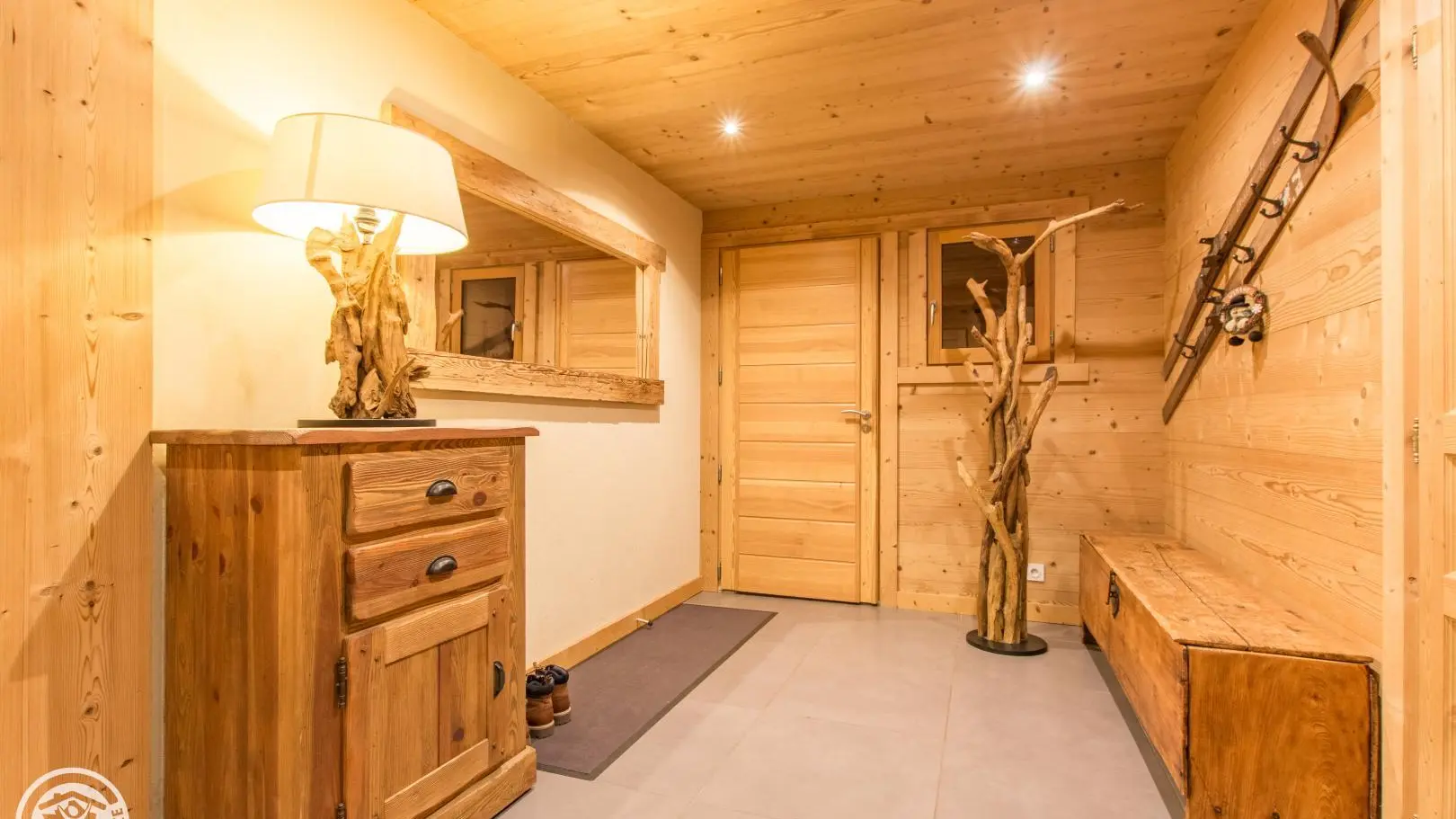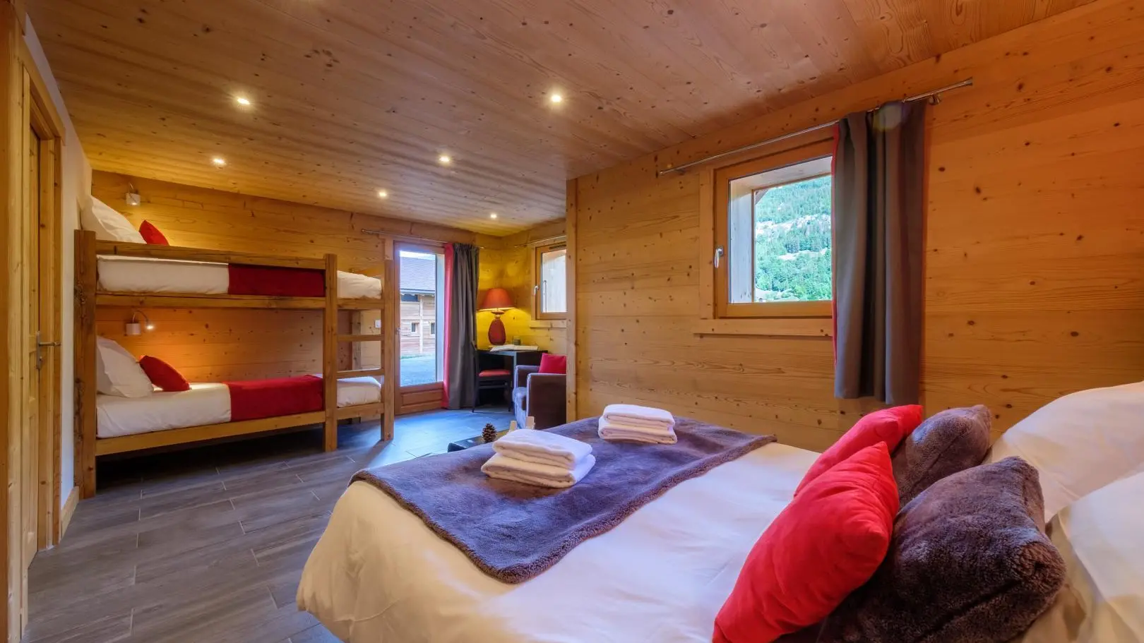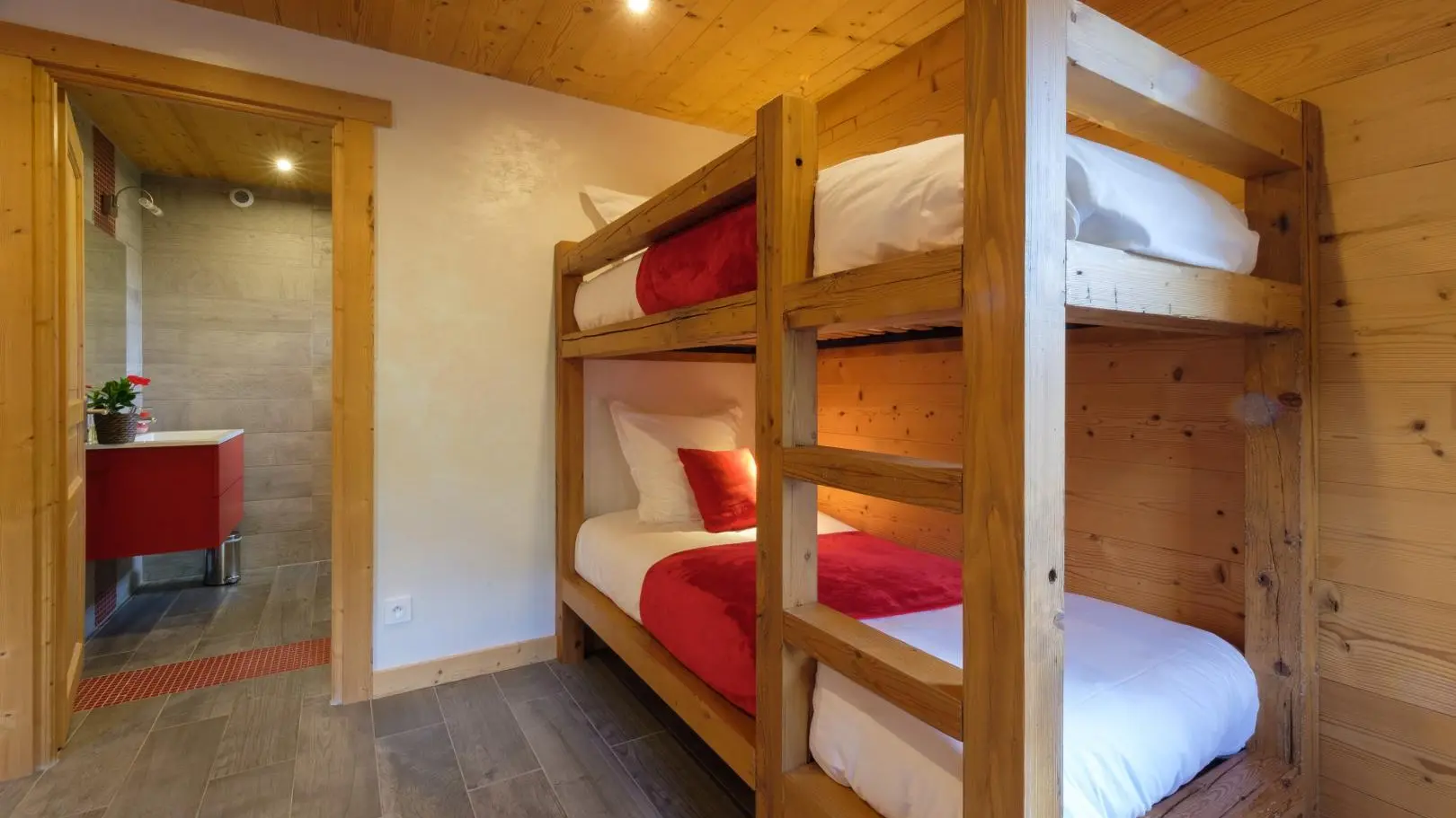 Rez-de-chaussée du chalet : hall d'entrée, chambre 1 pour 4 personnes (1 lit double 160x200cm + 2 lits 90x190cm superposés, salle d'eau/wc), buanderie (lave et sèche-linge), garage carrelé avec table ping-pong, vélo elliptique, espace skiroom (rack à skis et sèche-chaussures).
