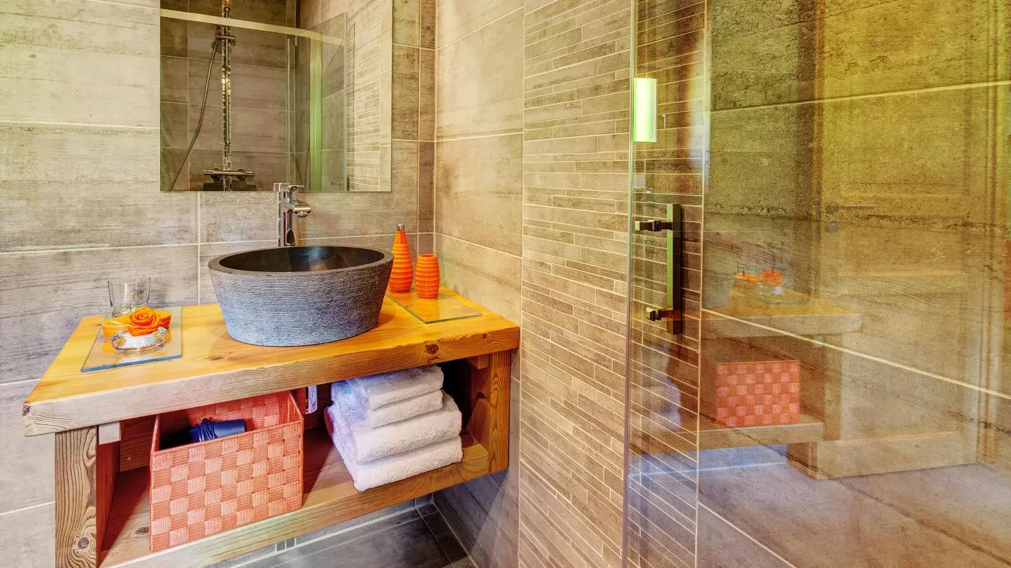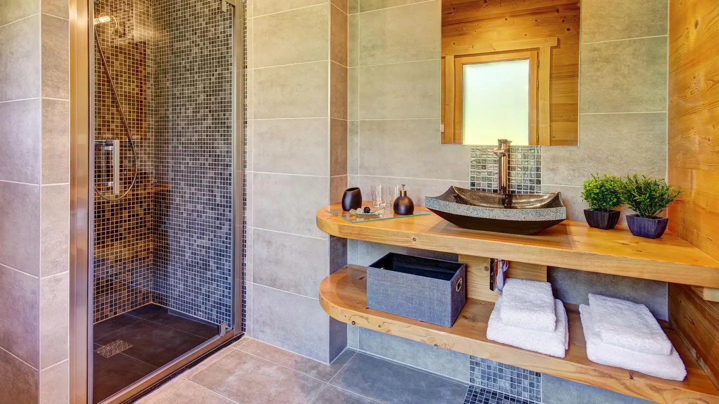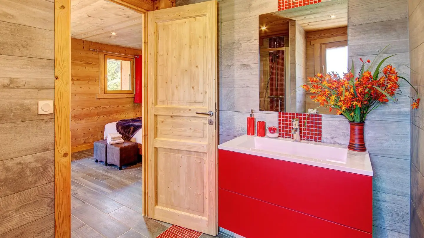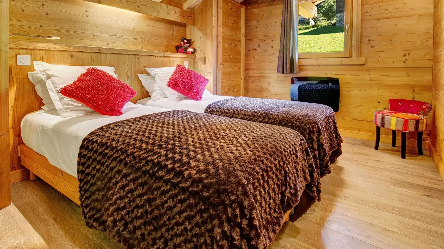 Rez-de-chaussée du chalet : hall d'entrée, chambre 1 pour 4 personnes (1 lit double 160x200cm + 2 lits 90x190cm superposés, salle d'eau/wc), buanderie (lave et sèche-linge), garage carrelé avec table ping-pong, vélo elliptique, espace skiroom (rack à skis et sèche-chaussures).