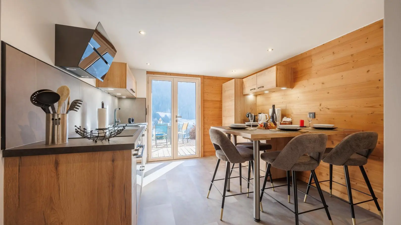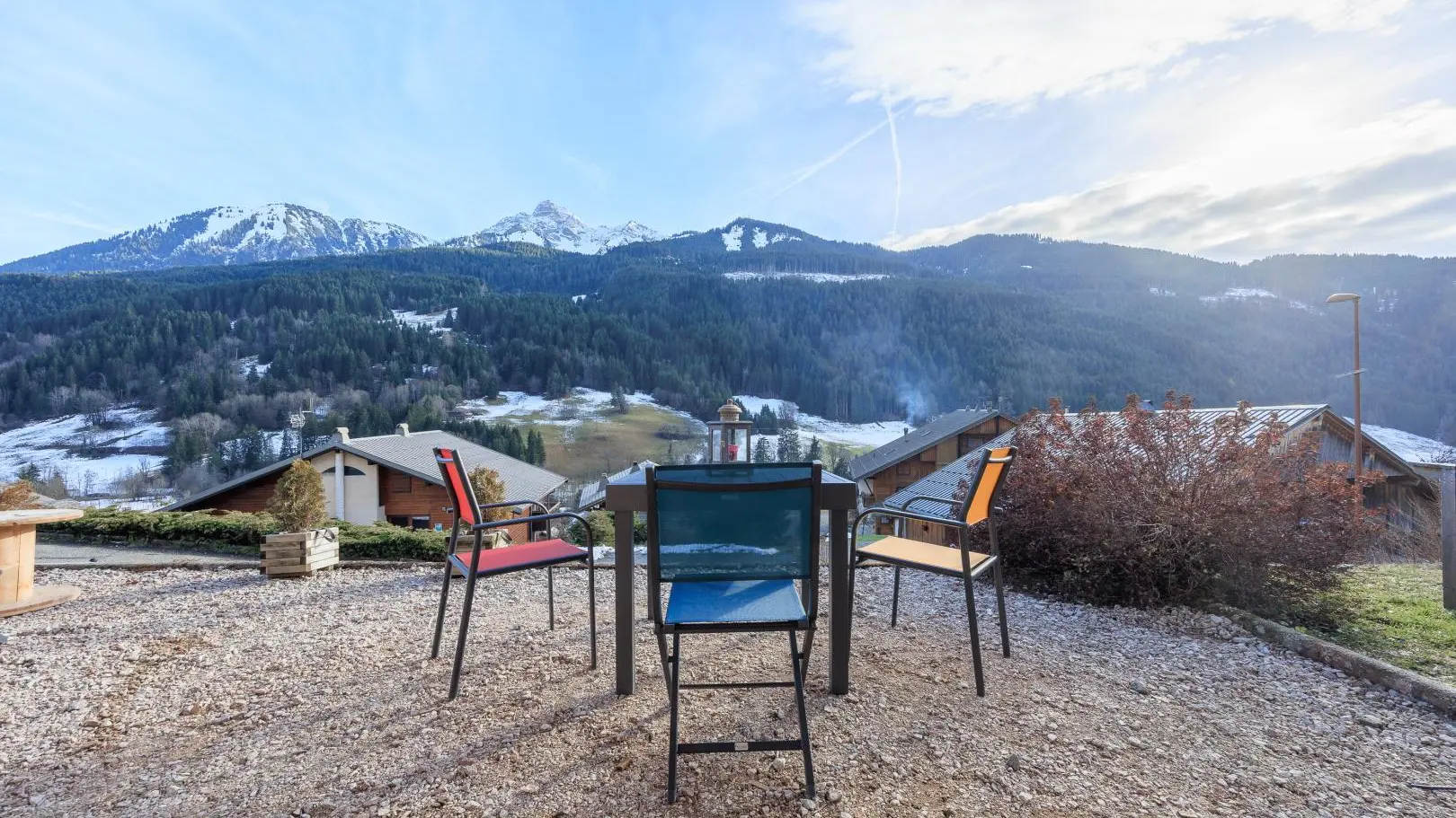 Terrasse privative orientée Sud devant le gîte avec magnifique vue sur les montagnes (Mont de Grange), mobilier de jardin, transats, barbecue. Espace terrasse abritée avec table repas. Petit jardin.