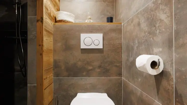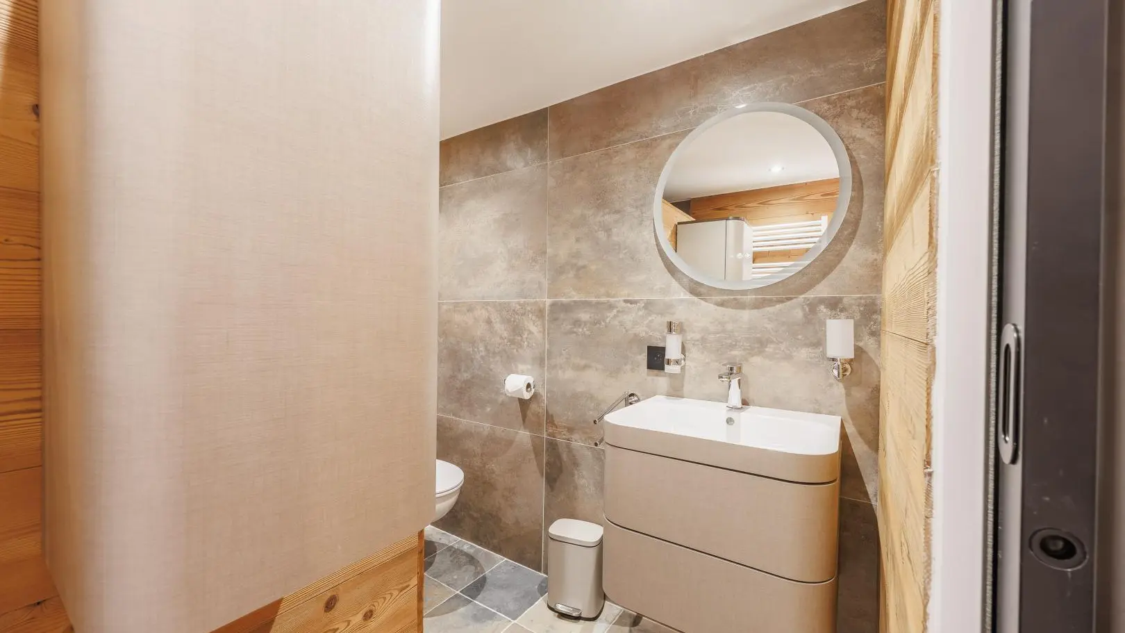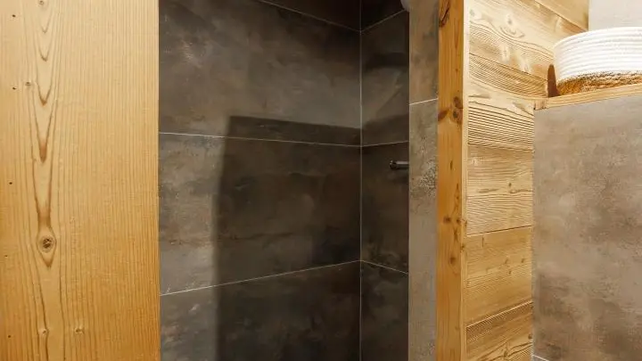 Salle d'eau avec douche, vasque sur meuble, sèche-serviettes, wc. Lave-linge et sèche-linge communs avec le propriétaire dans local rangement sur le côté du gîte.