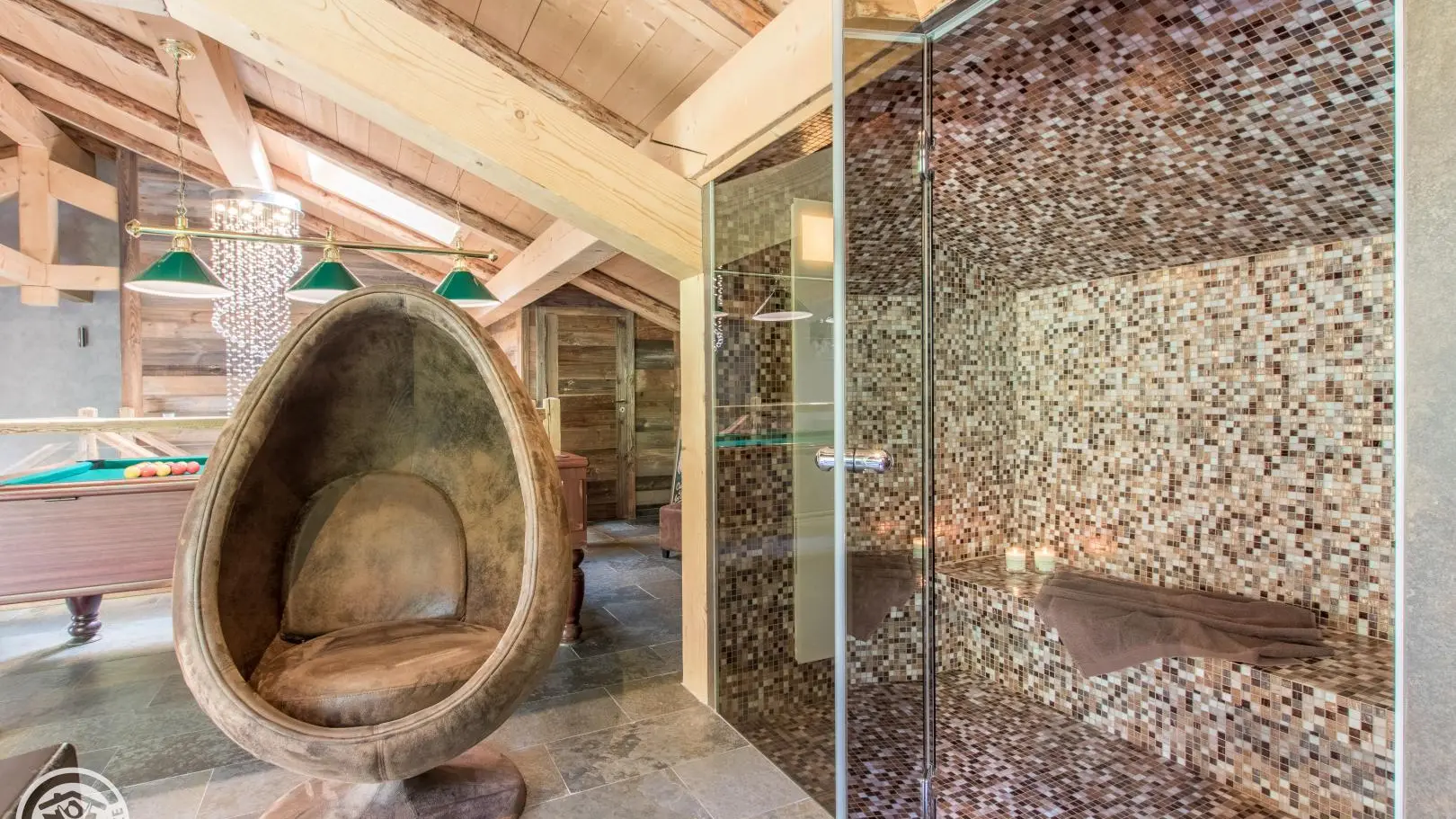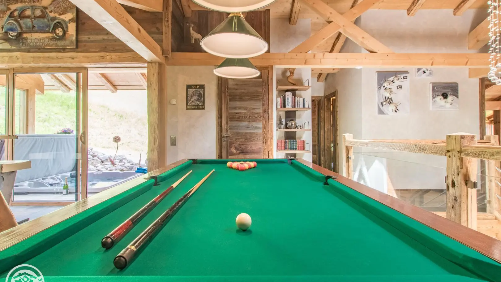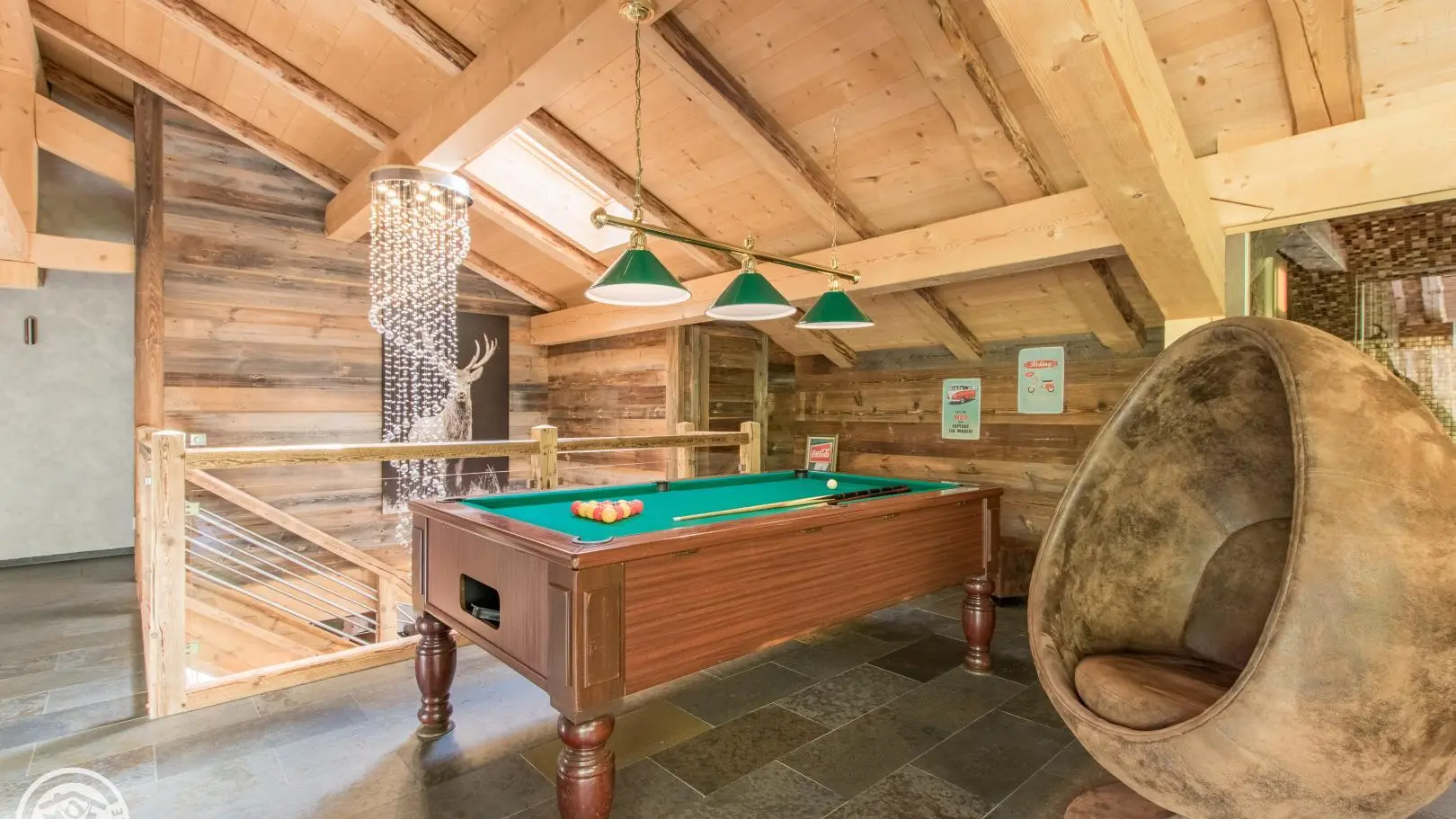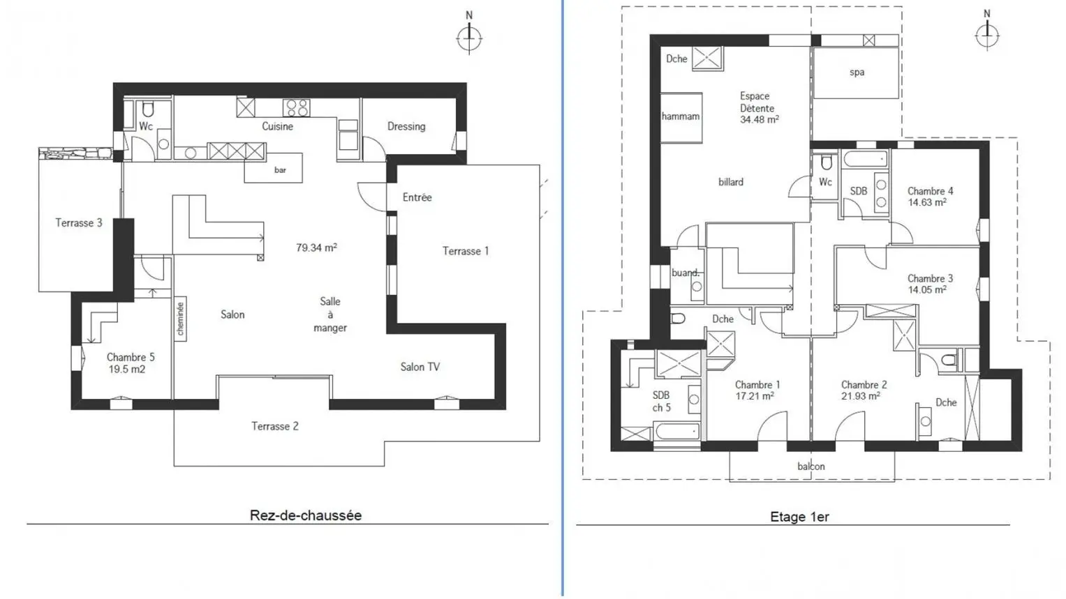 A l'étage : chambre 2 (1 lit 160x200cm, tv, balcon, salle d'eau ouverte, wc), chambre 3 (1 lit 160x200cm, tv, balcon, salle d'eau ouverte, wc), chambre 4 (2 lits 90x190cm), chambre 5 (2 lits 90x190cm et 2 lits 90x190cm superposés). Salle de bains (baignoire). Magnifique espace détente / bien-être avec billard, hammam, accès la terrasse avec le spa, salle d'eau, 1 wc indépendant. Buanderie avec lave-linge séchant.