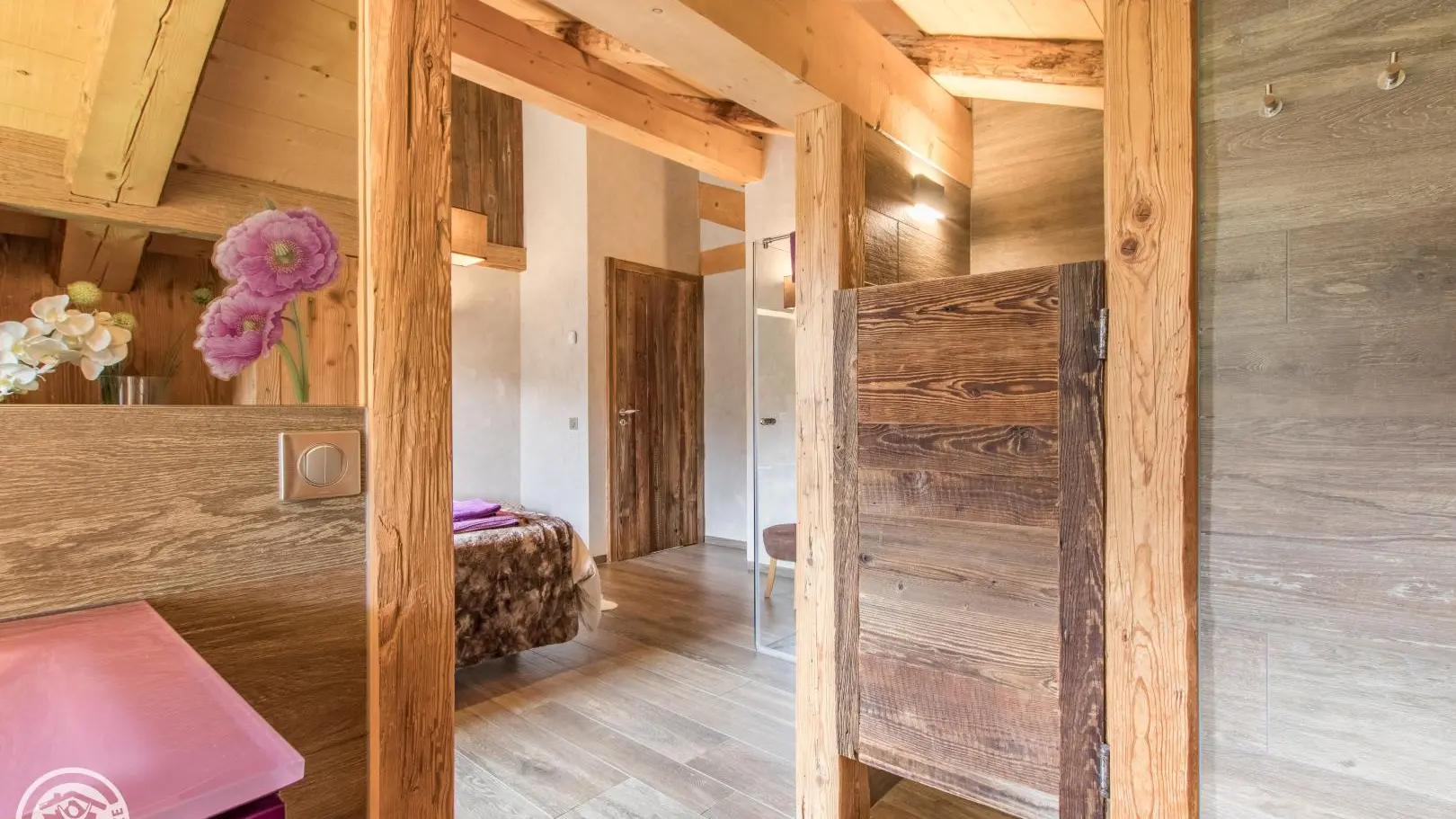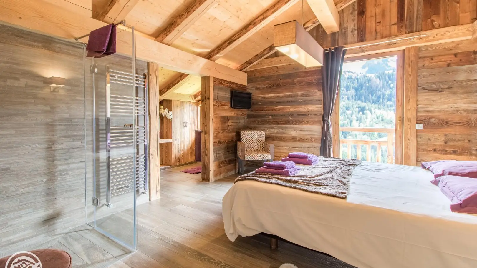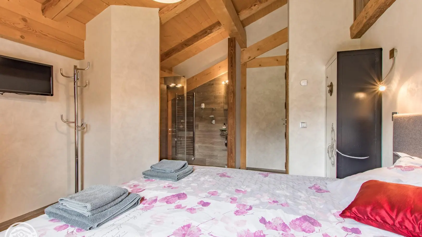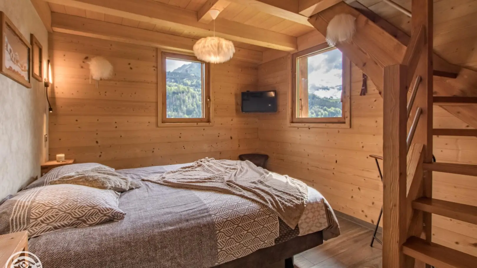 Chambre 1 (1 lit 160x200cm, tv, salle de bains en duplex avec douche et baignoire - vue montagnes). 1 wc indépendant.