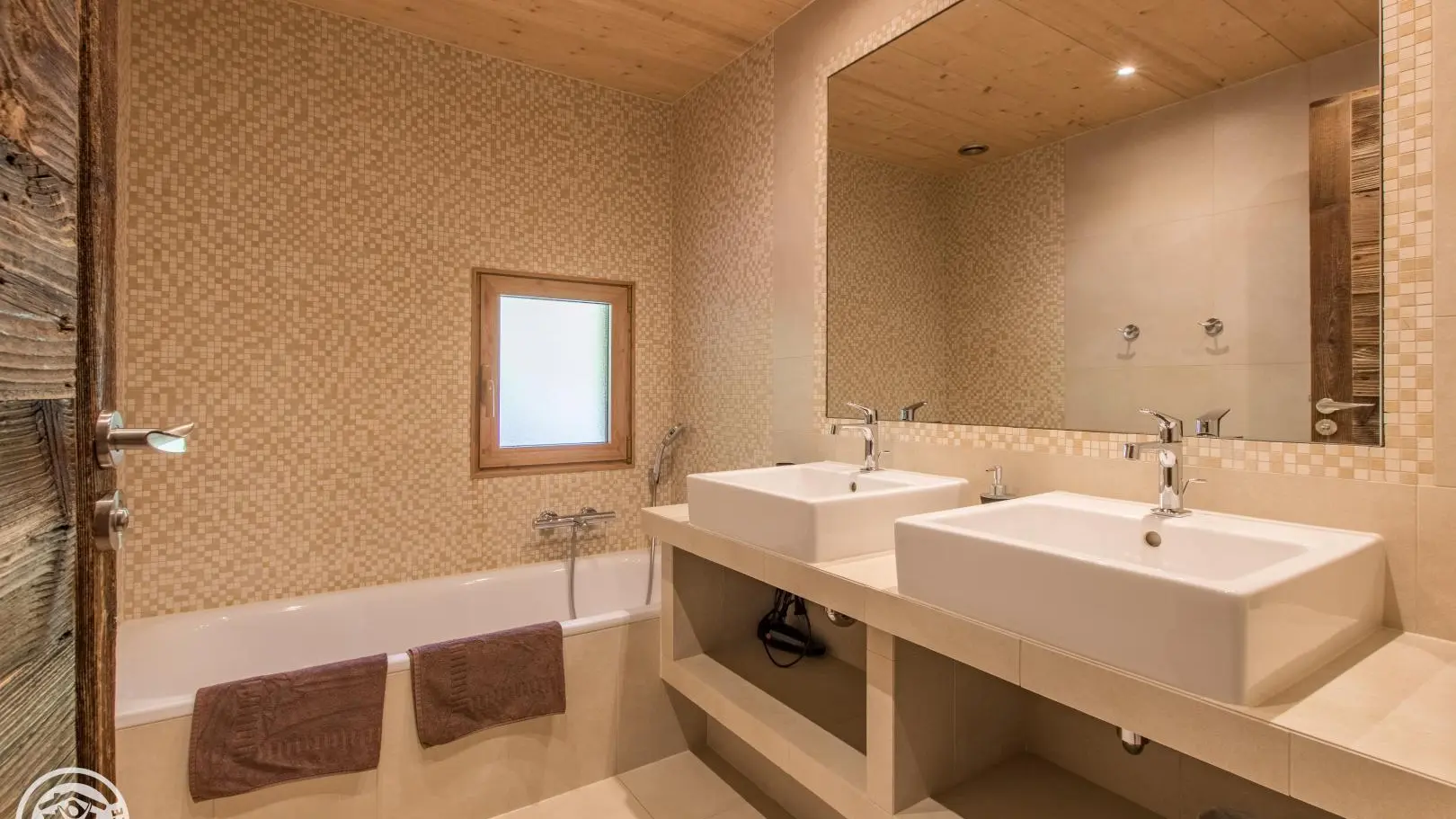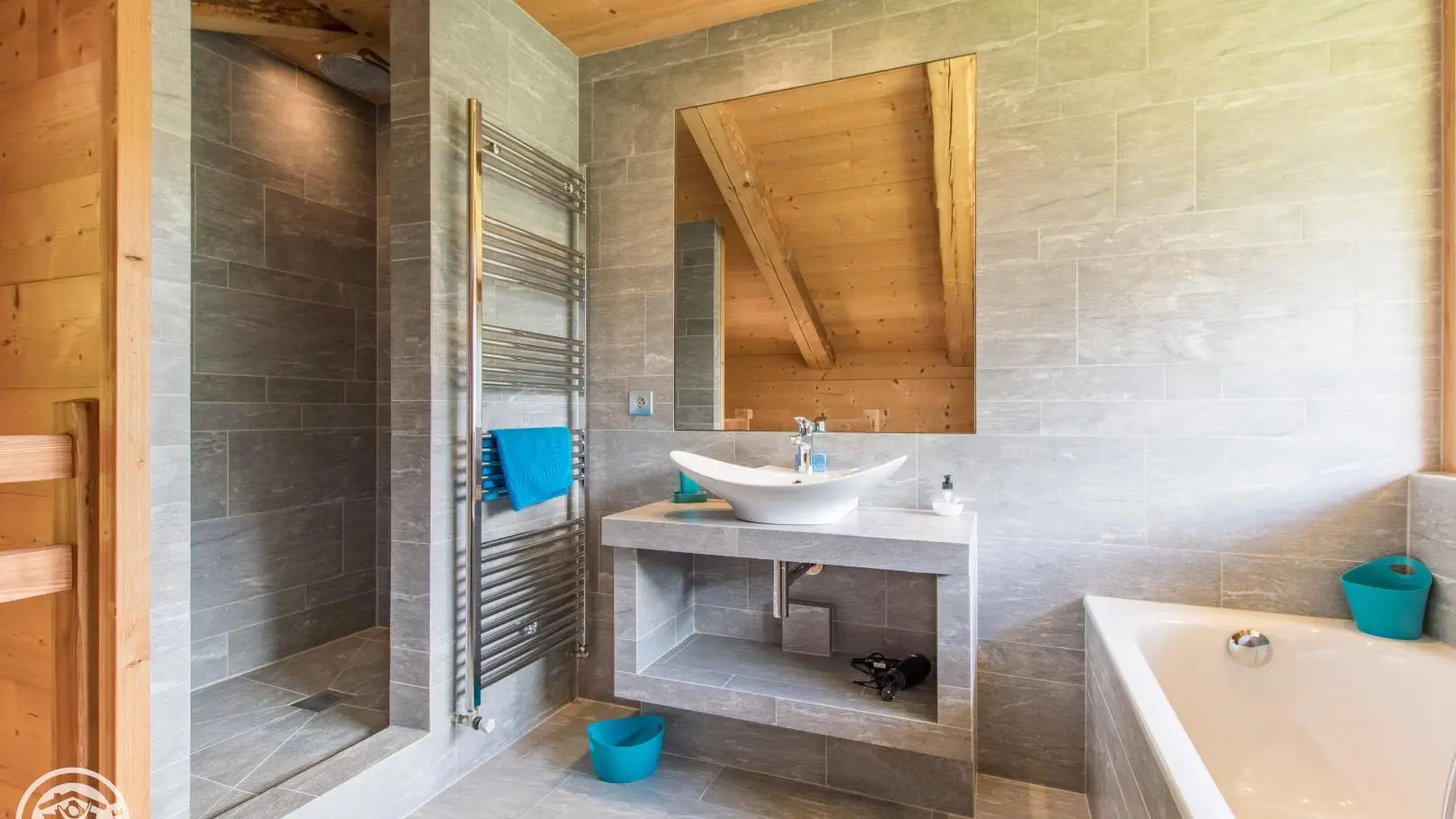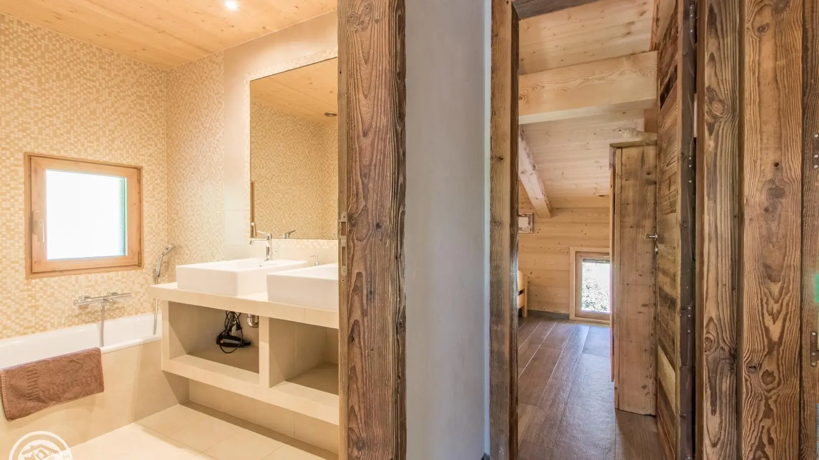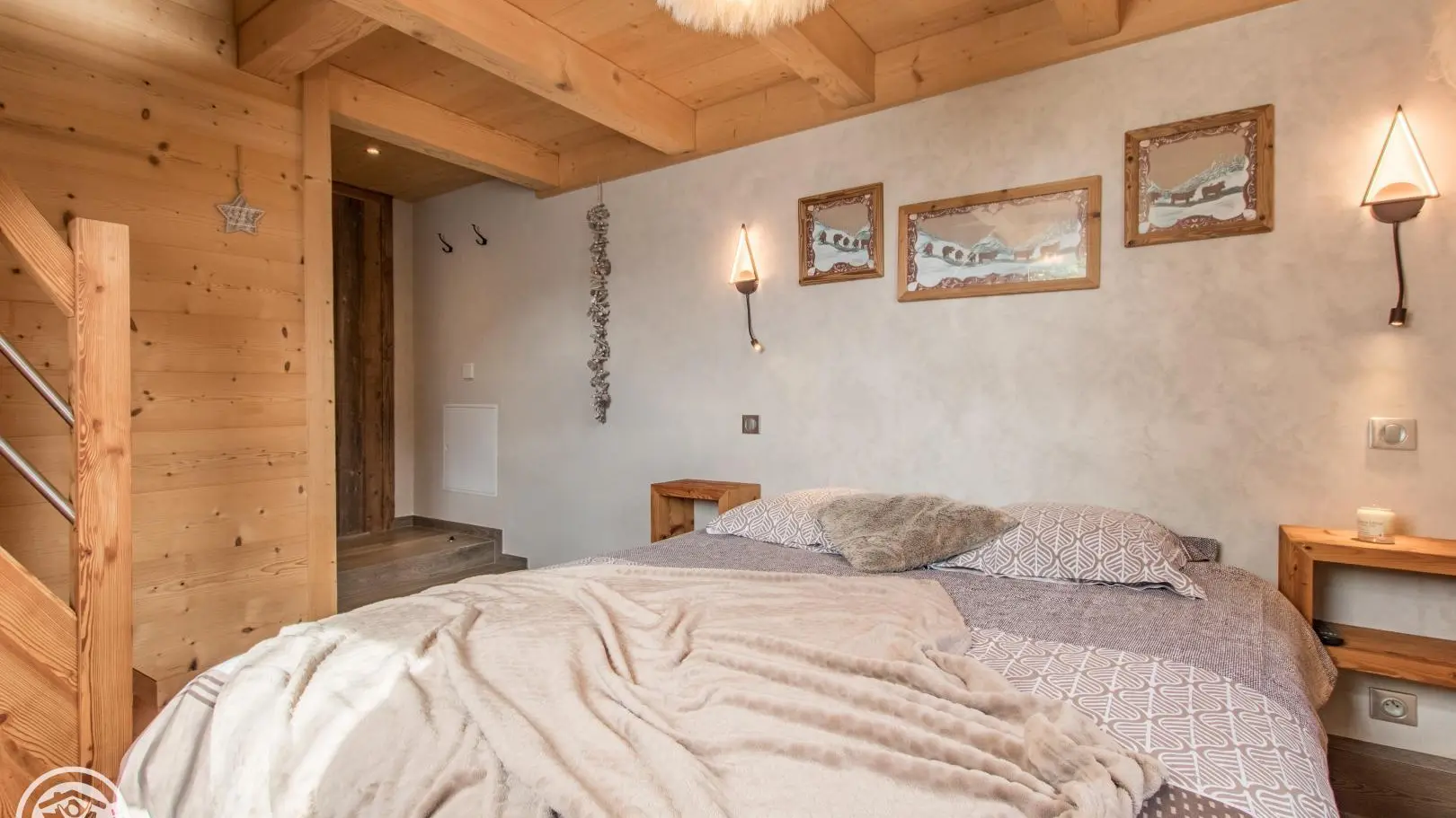 Chambre 1 (1 lit 160x200cm, tv, salle de bains en duplex avec douche et baignoire - vue montagnes). 1 wc indépendant.