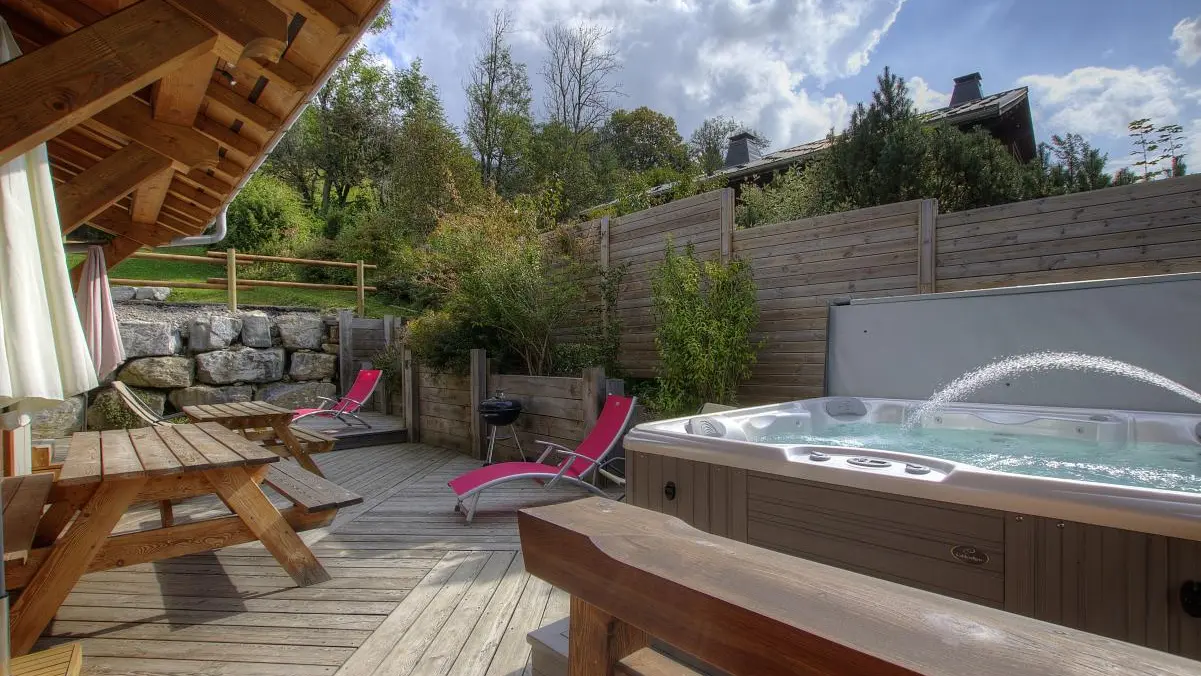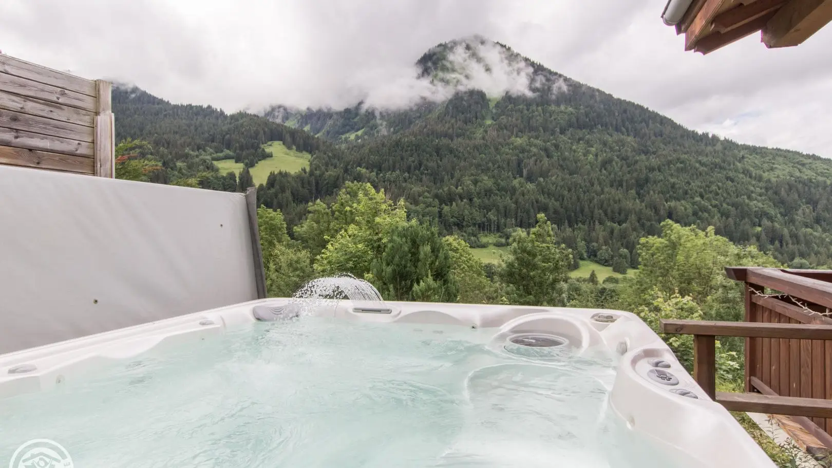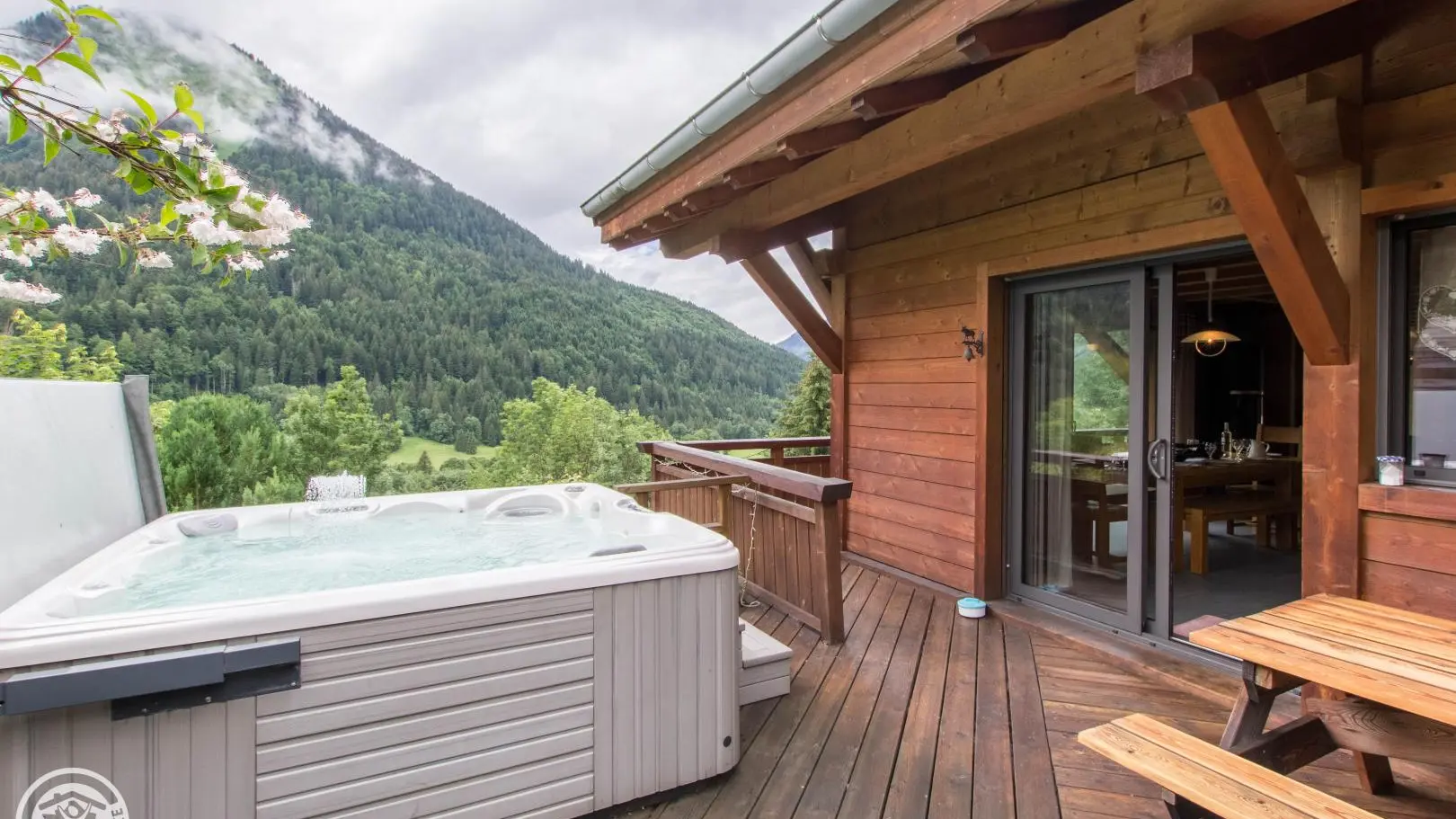Vaste terrasse bois au 1er étage (accès depuis pièce de vie) avec 2 tables forestière, barbecue, et SPA. Draps et serviettes de toilette inclus.