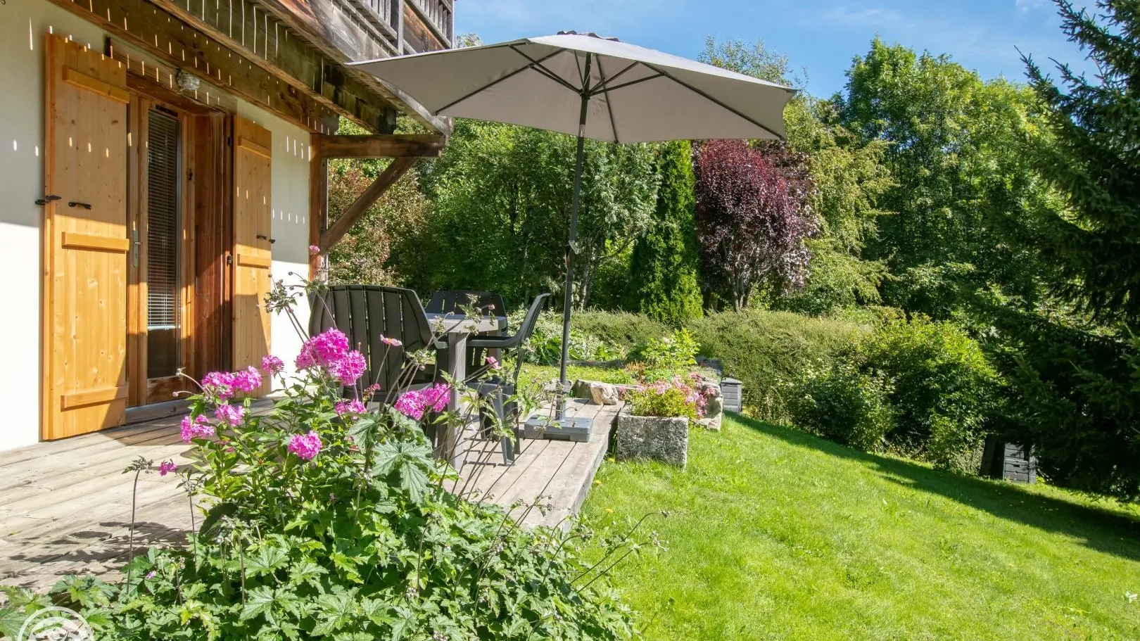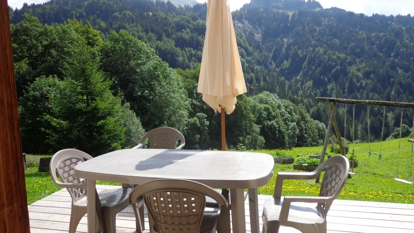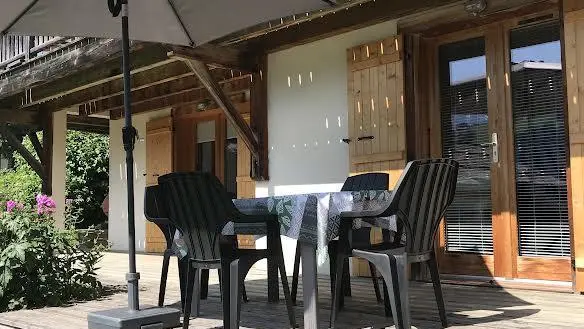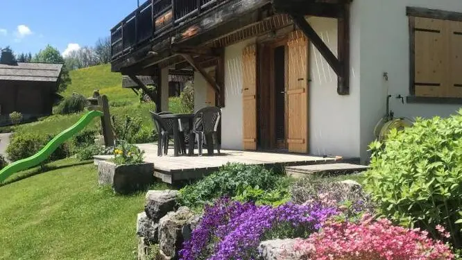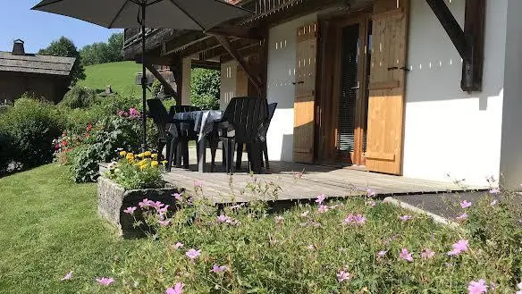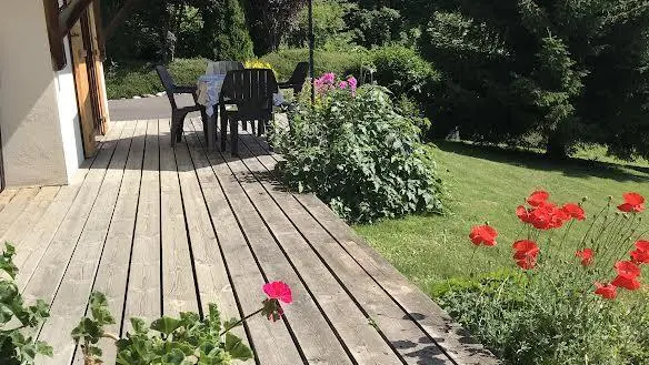 En location sur demande : linge de lits et serviettes. Ménage de fin de séjour en option. Terrasse privative devant le gîte avec salon de jardin, transats, parasol. Vue sur les montagnes. Jardin commun (en pente) sur l'avant du chalet .
