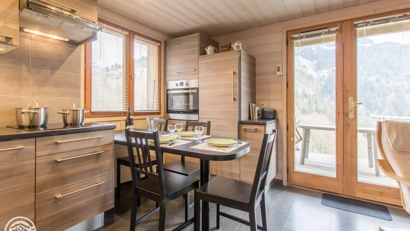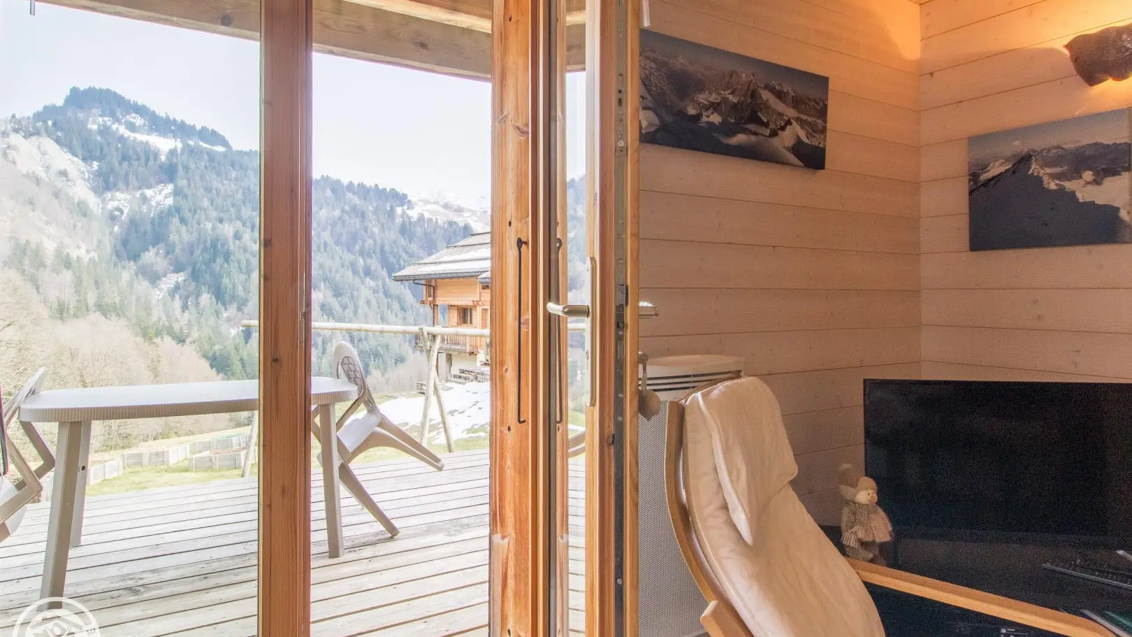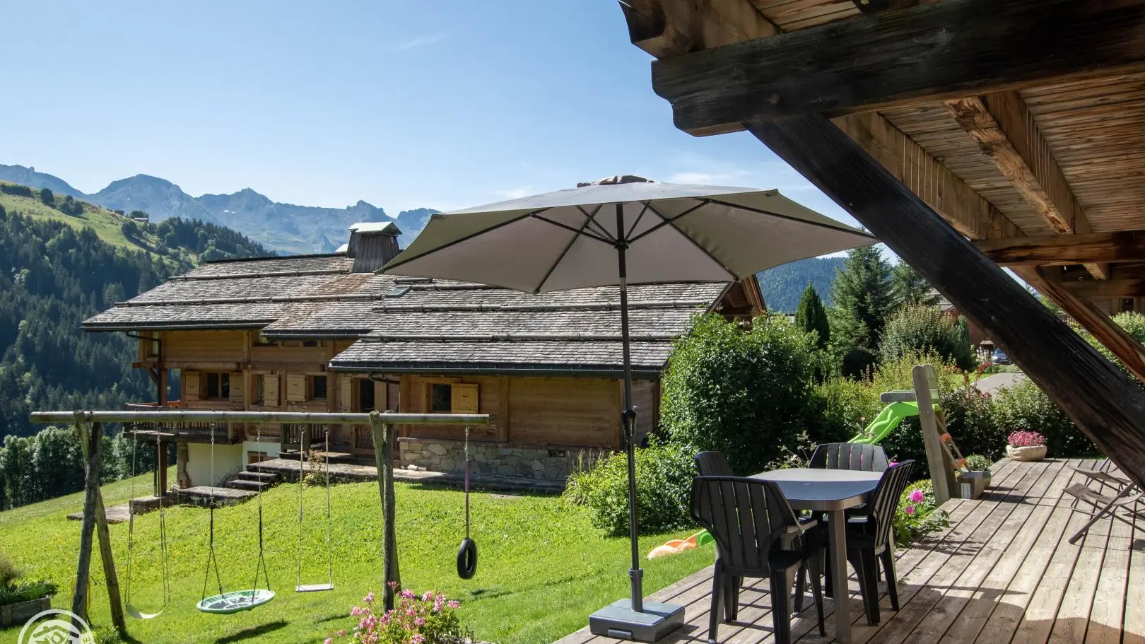 En location sur demande : linge de lits et serviettes. Ménage de fin de séjour en option. Terrasse privative devant le gîte avec salon de jardin, transats, parasol. Vue sur les montagnes. Jardin commun (en pente) sur l'avant du chalet .