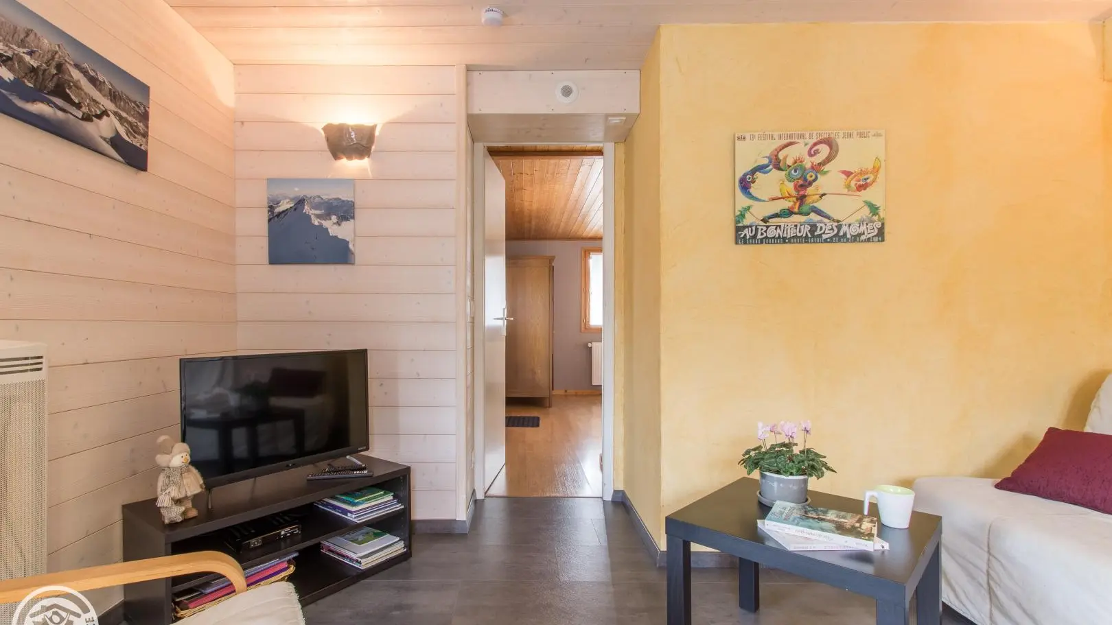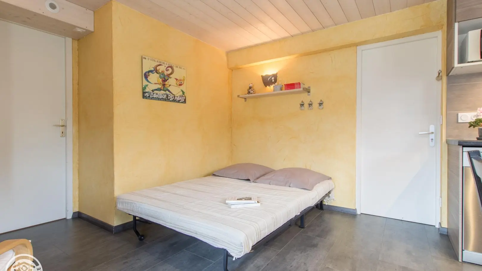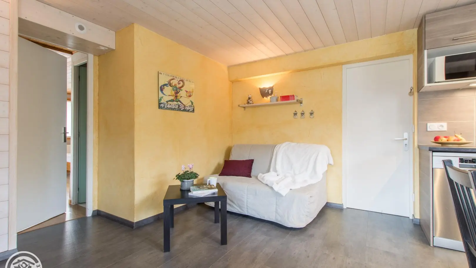 Cuisine équipée ouverte sur le séjour (table repas, télévision, canapé convertible type BZ pour couchage 2 personnes), accès à la terrasse et au jardin. 1 chambre avec 1 lit 140x190cm et 1 lit 80x190cm, armoire, porte-fenêtre donnant sur la terrasse. A l'entrée de la chambre, salle d'eau (douche, vasque sur meuble, wc). SAS d'entrée avec étagères de rangement, lave-linge, petit congélateur indépendant, possibilité de poser les skis et vélos. Accès internet wifi. Hauteur sous plafond : 2,20m.