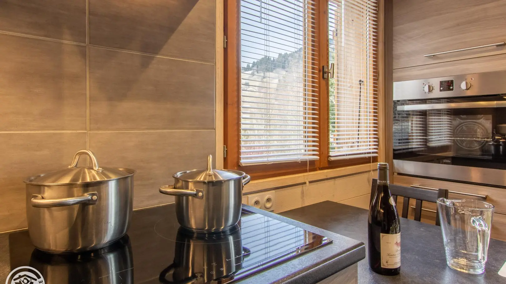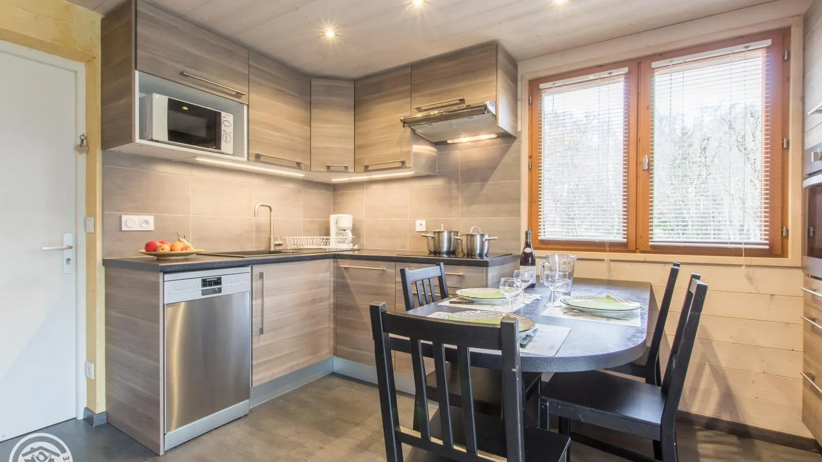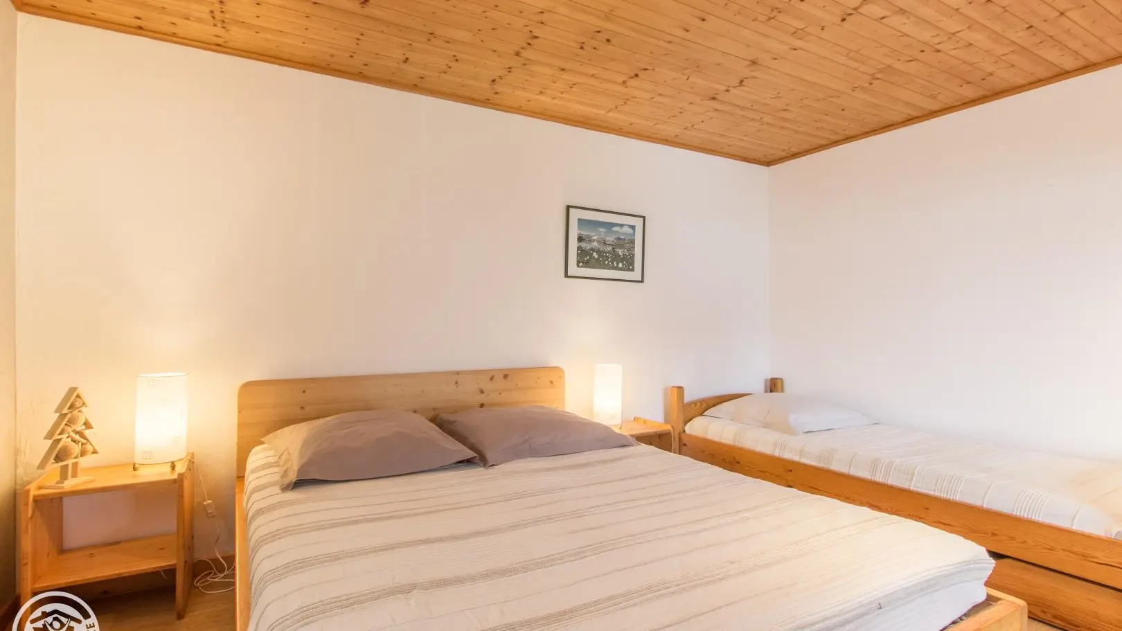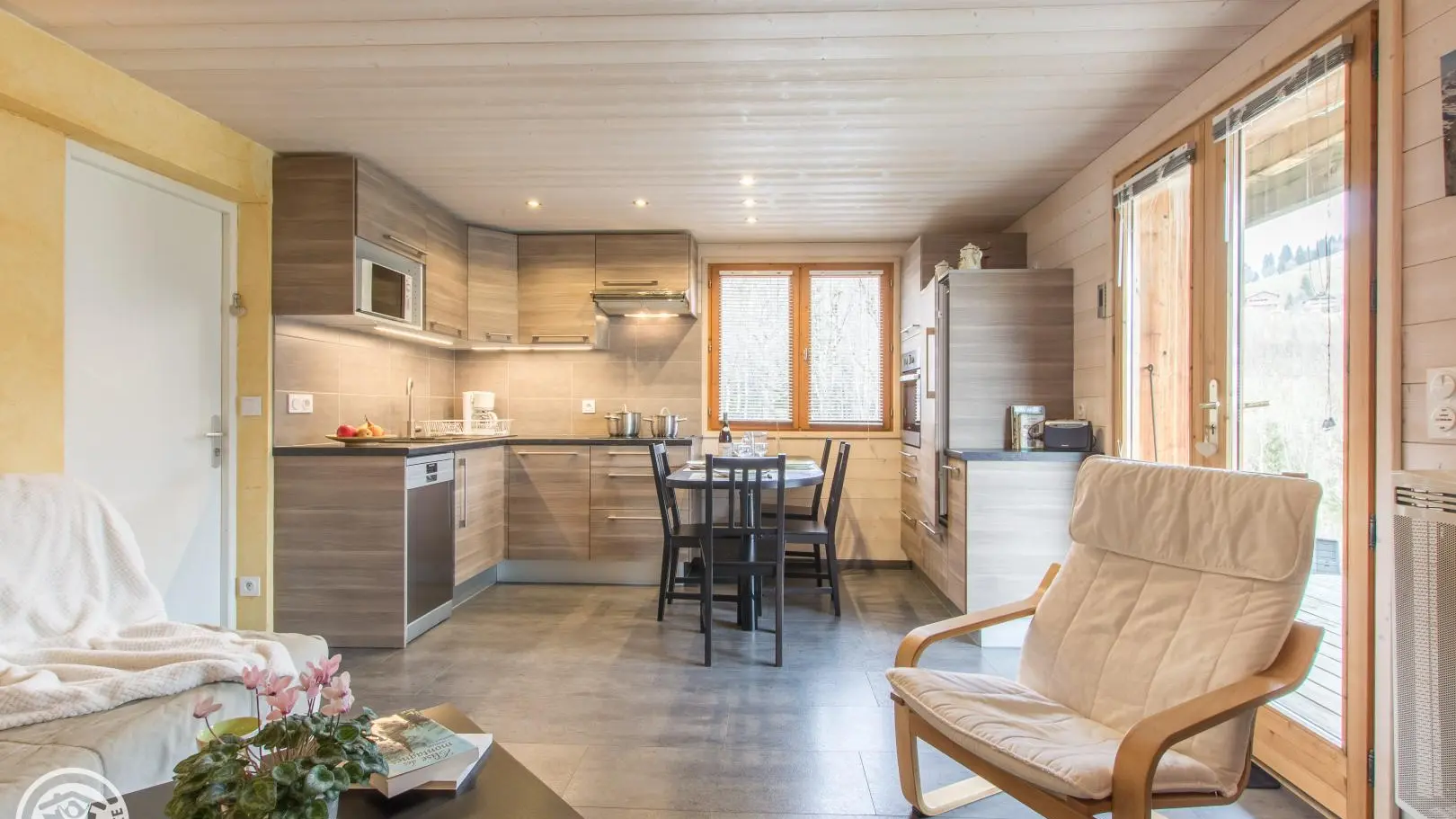 Cuisine équipée ouverte sur le séjour (table repas, télévision, canapé convertible type BZ pour couchage 2 personnes), accès à la terrasse et au jardin. 1 chambre avec 1 lit 140x190cm et 1 lit 80x190cm, armoire, porte-fenêtre donnant sur la terrasse. A l'entrée de la chambre, salle d'eau (douche, vasque sur meuble, wc). SAS d'entrée avec étagères de rangement, lave-linge, petit congélateur indépendant, possibilité de poser les skis et vélos. Accès internet wifi. Hauteur sous plafond : 2,20m.
