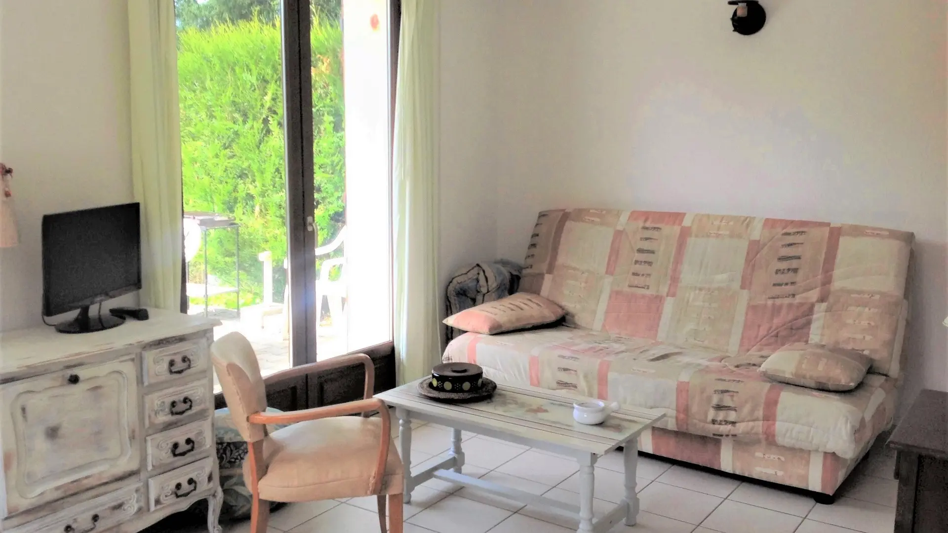 Séjour coin salon avec canapé et coin salle à manger, télévision, cuisine américaine., cafetière, grille-pain, bouilloire, micro-ondes, cuisinière 4 feux et four, réfrigérateur.... Chambre Indépendante : 1 lit de 140. Chambre Indépendante : 2 lits de 90 ou lit de 180 Dans le séjour : 1 canapé de 140. Terrasse, Salon de jardin, bains de soleil, parasol, BBQ (bois) particulier,