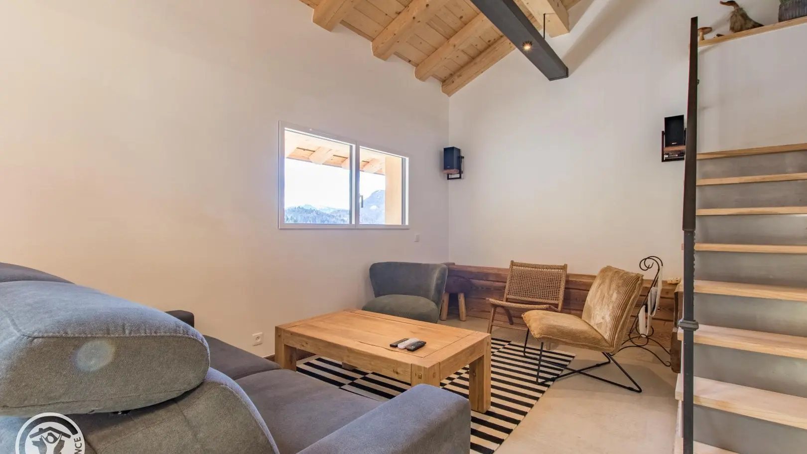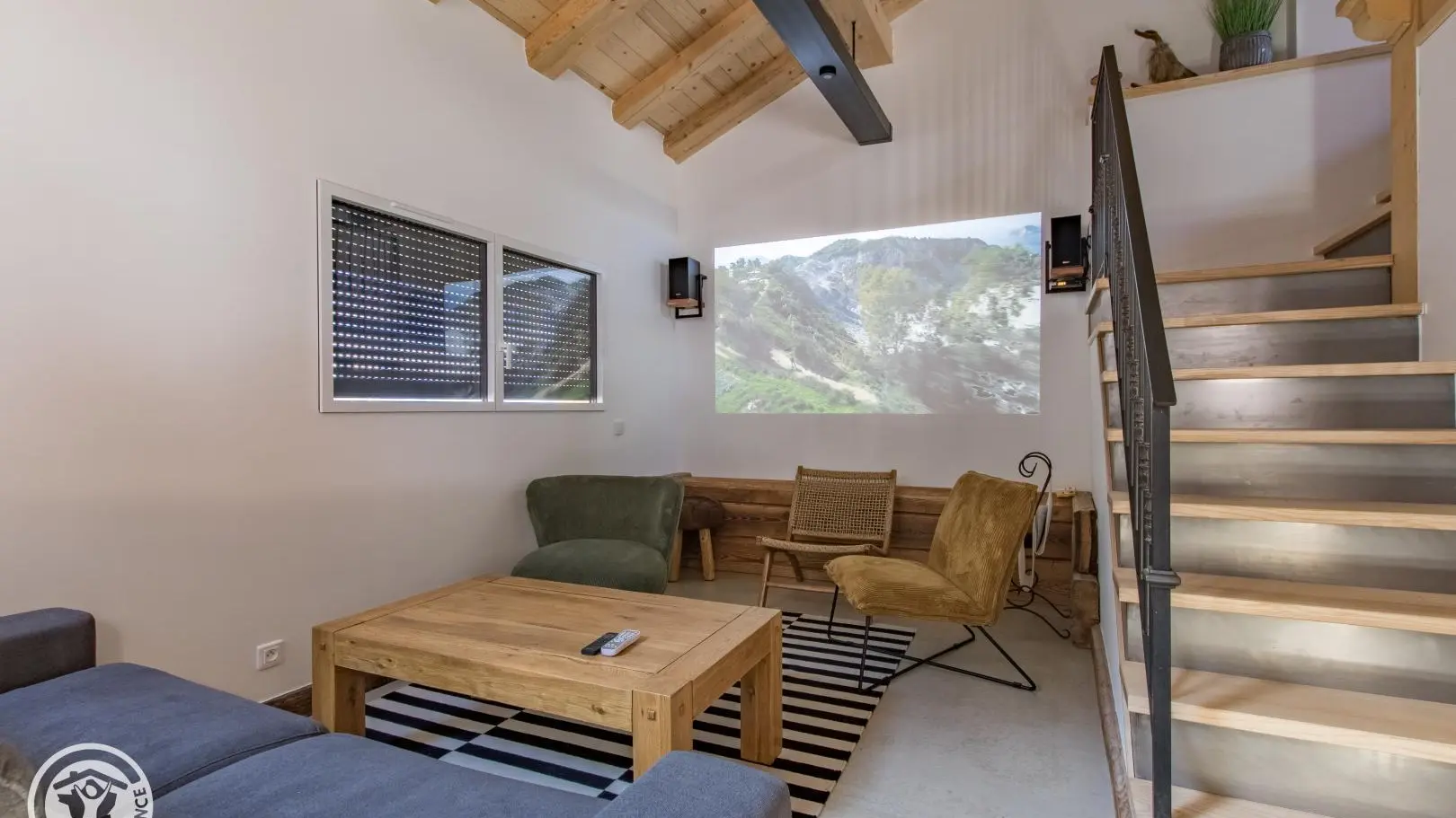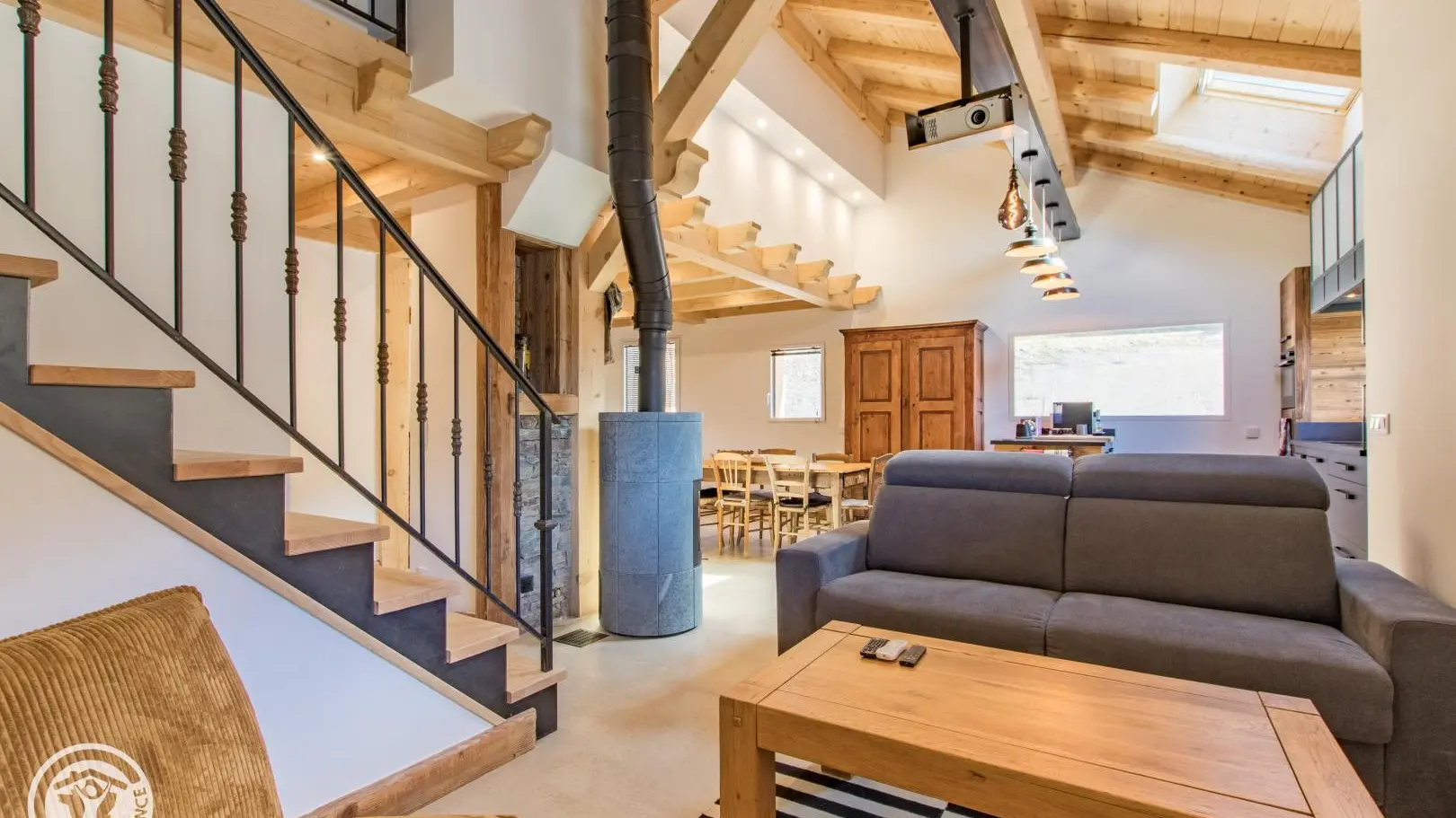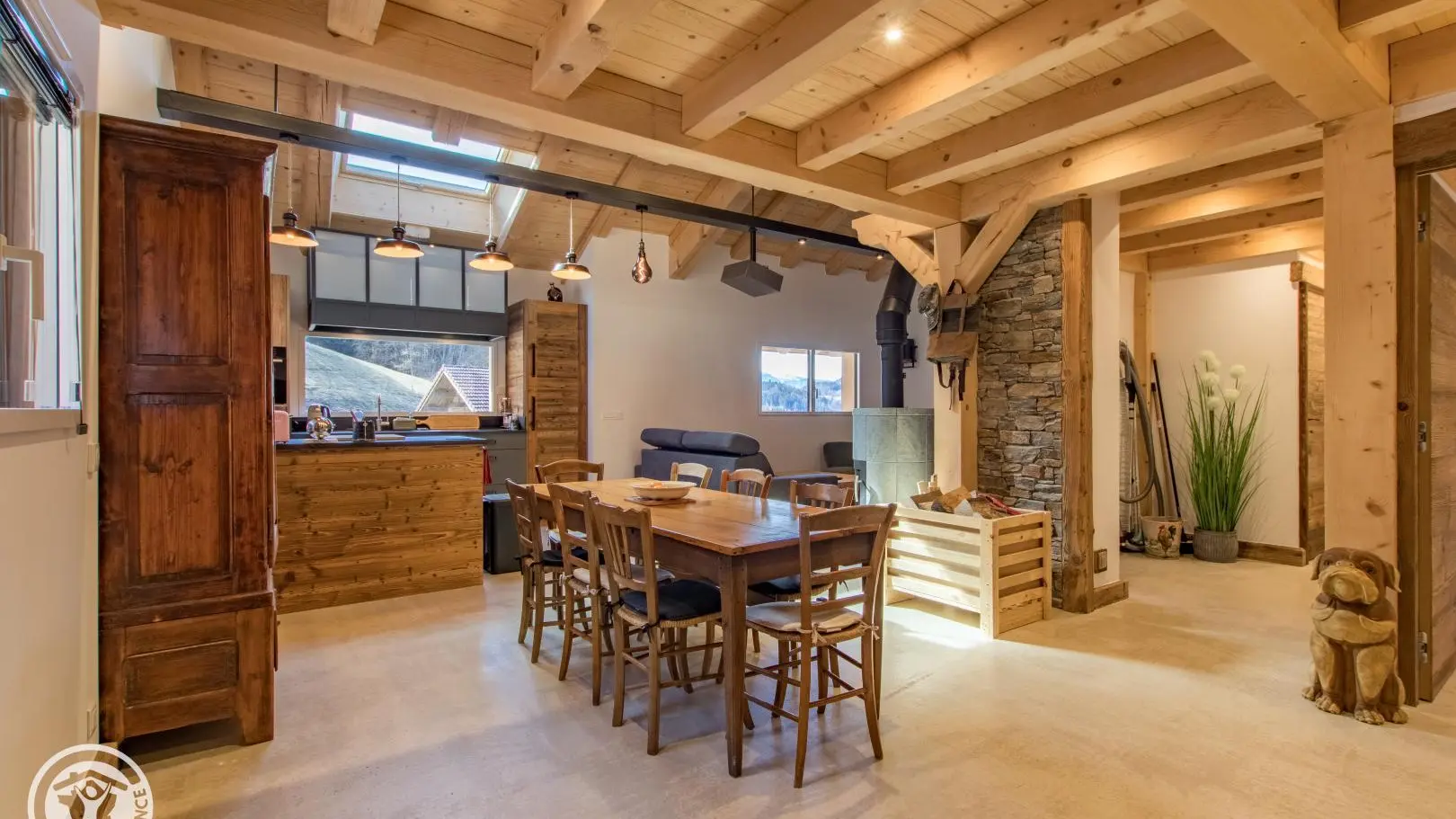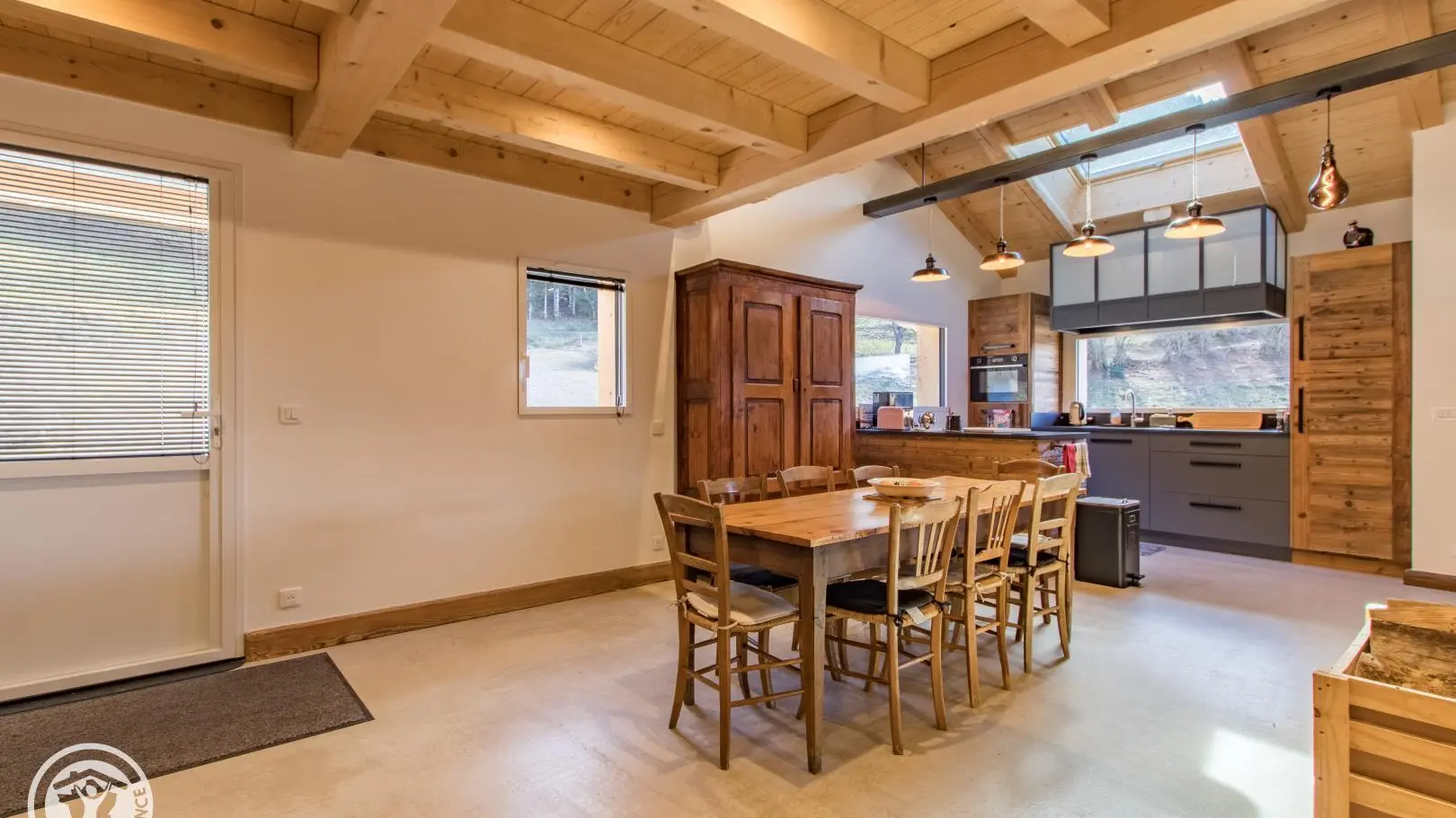 Rez-de-chaussée (2 marches) : belle pièce de vie avec cuisine équipée ouverte sur le séjour : table repas, canapé convertible type rapido, fauteuils, télévision sur vidéoprojecteur. Le poêle à bois n'est pas utilisable. Chambre 1 (1 lit 180x200cm), salle d'eau/wc (vasque, douche, lave-linge).