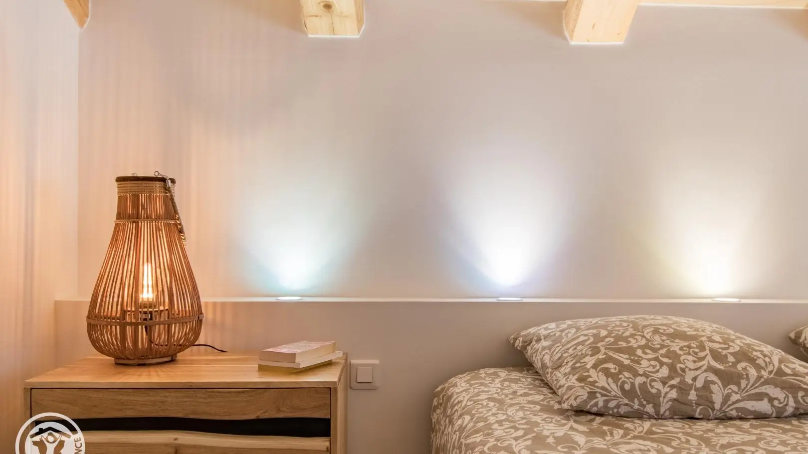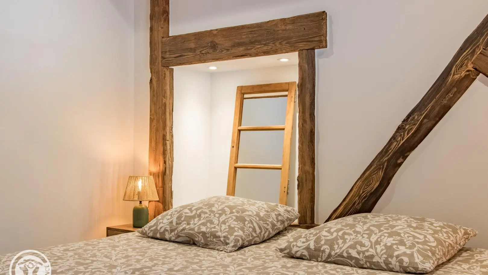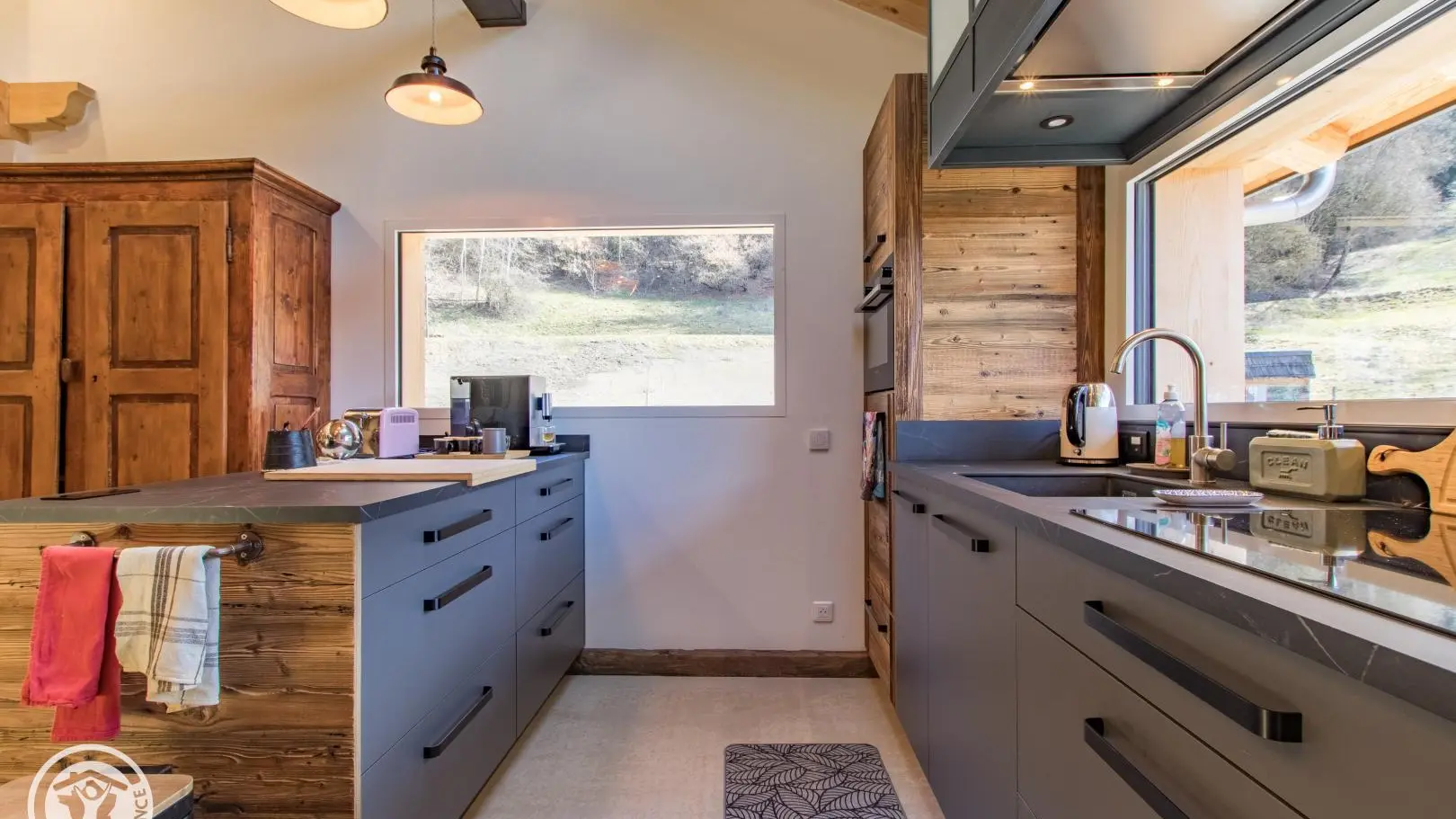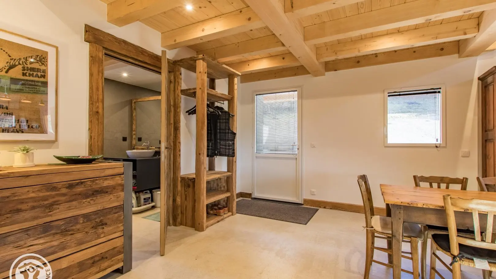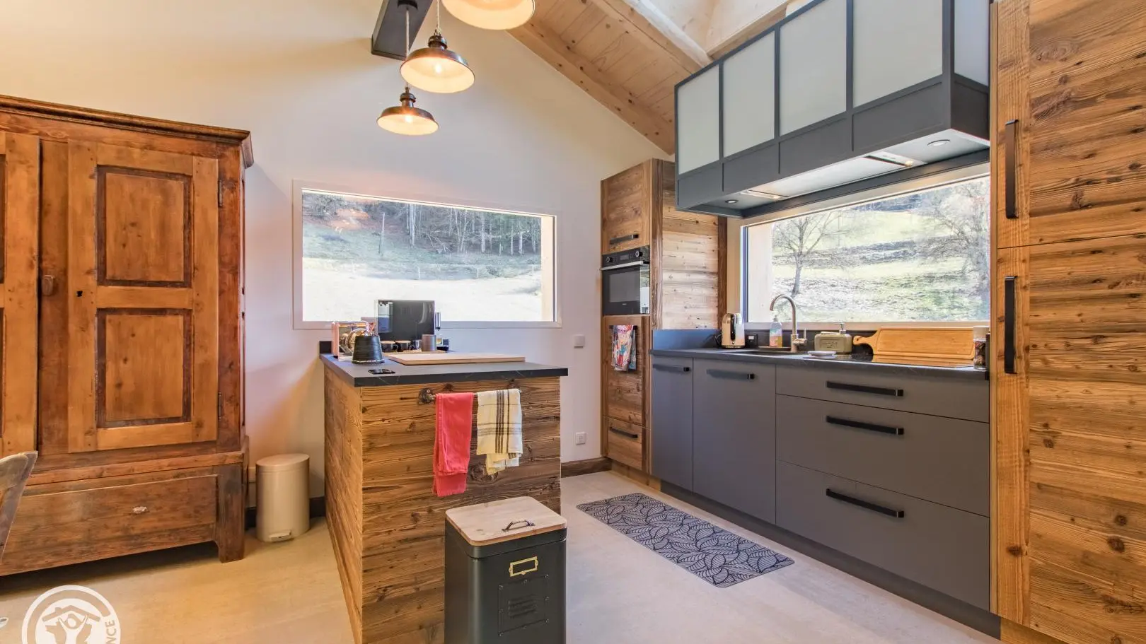 Rez-de-chaussée (2 marches) : belle pièce de vie avec cuisine équipée ouverte sur le séjour : table repas, canapé convertible type rapido, fauteuils, télévision sur vidéoprojecteur. Le poêle à bois n'est pas utilisable. Chambre 1 (1 lit 180x200cm), salle d'eau/wc (vasque, douche, lave-linge).