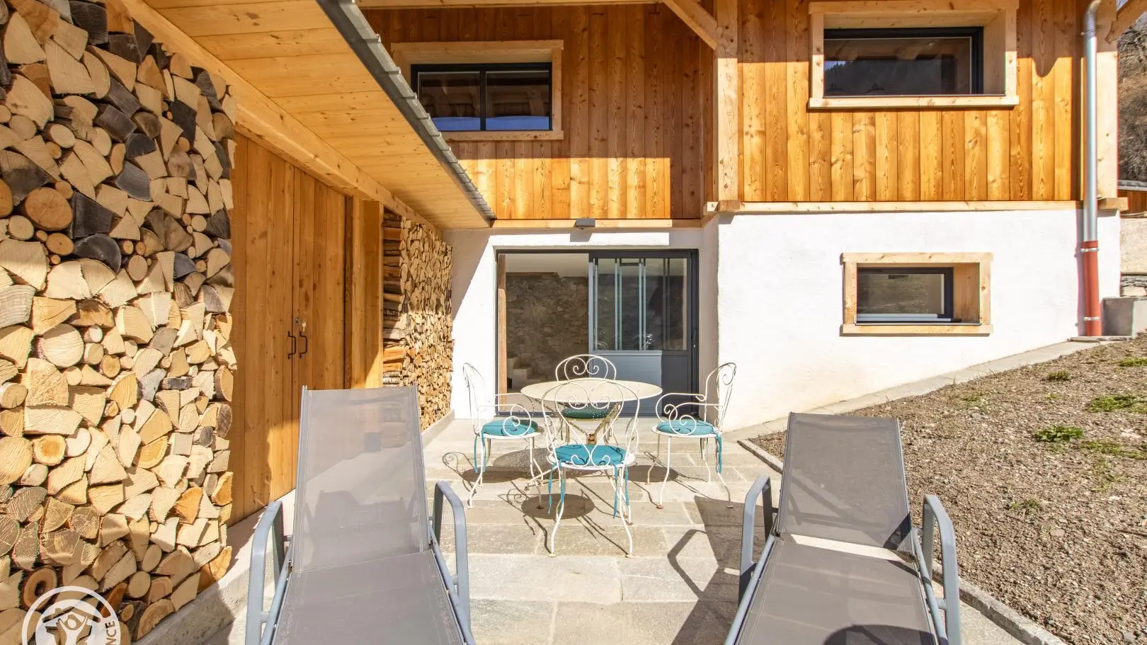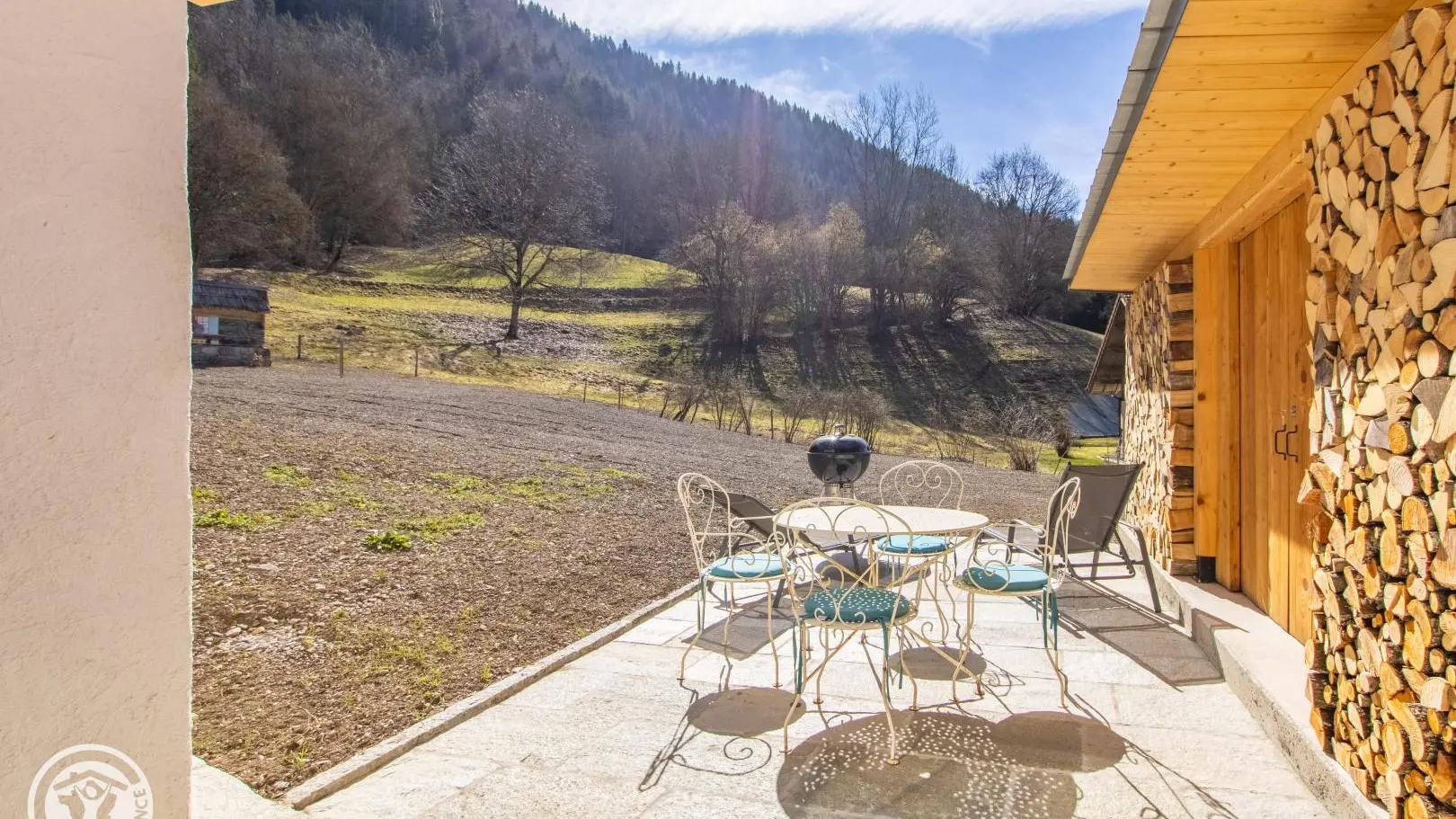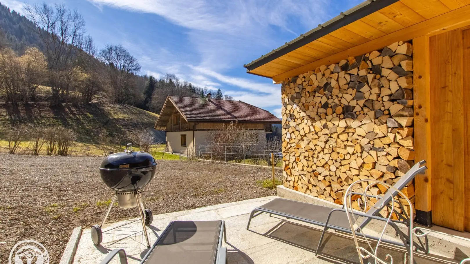 Terrasse Sud avec mobilier de jardin, barbecue, transats. Terrain. 2ème terrasse disponible côté Est.