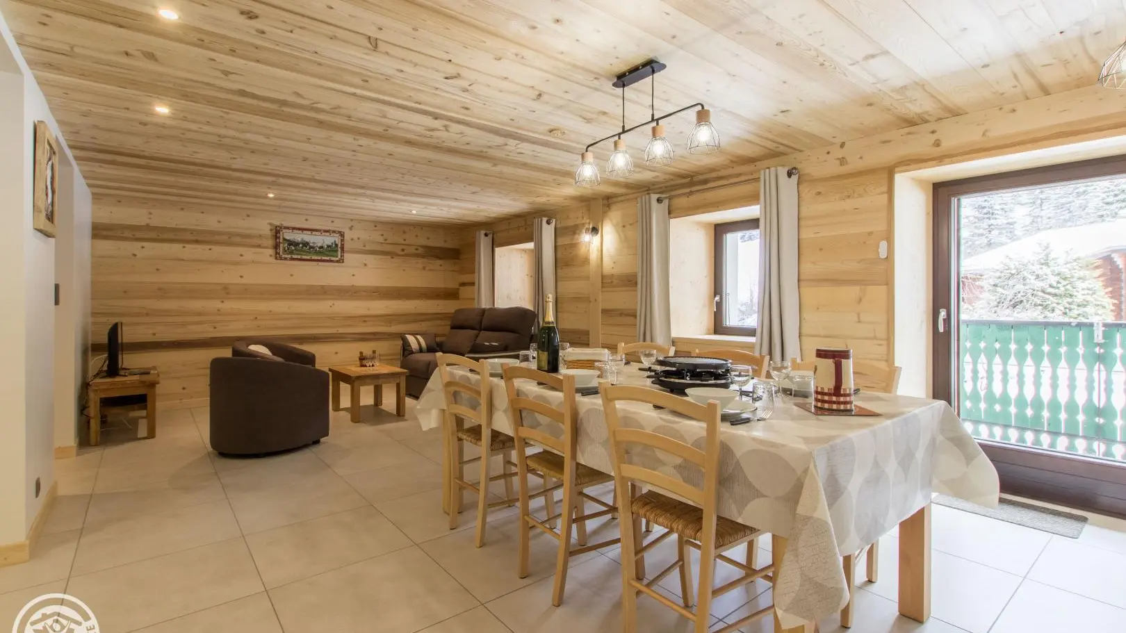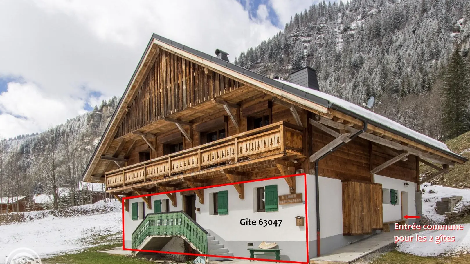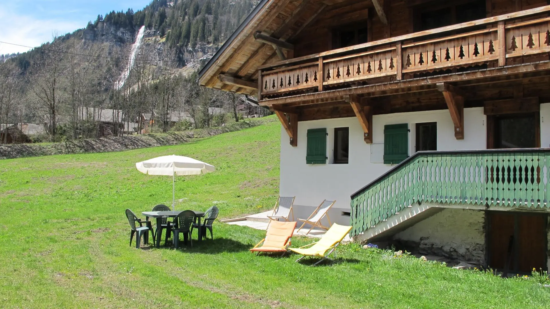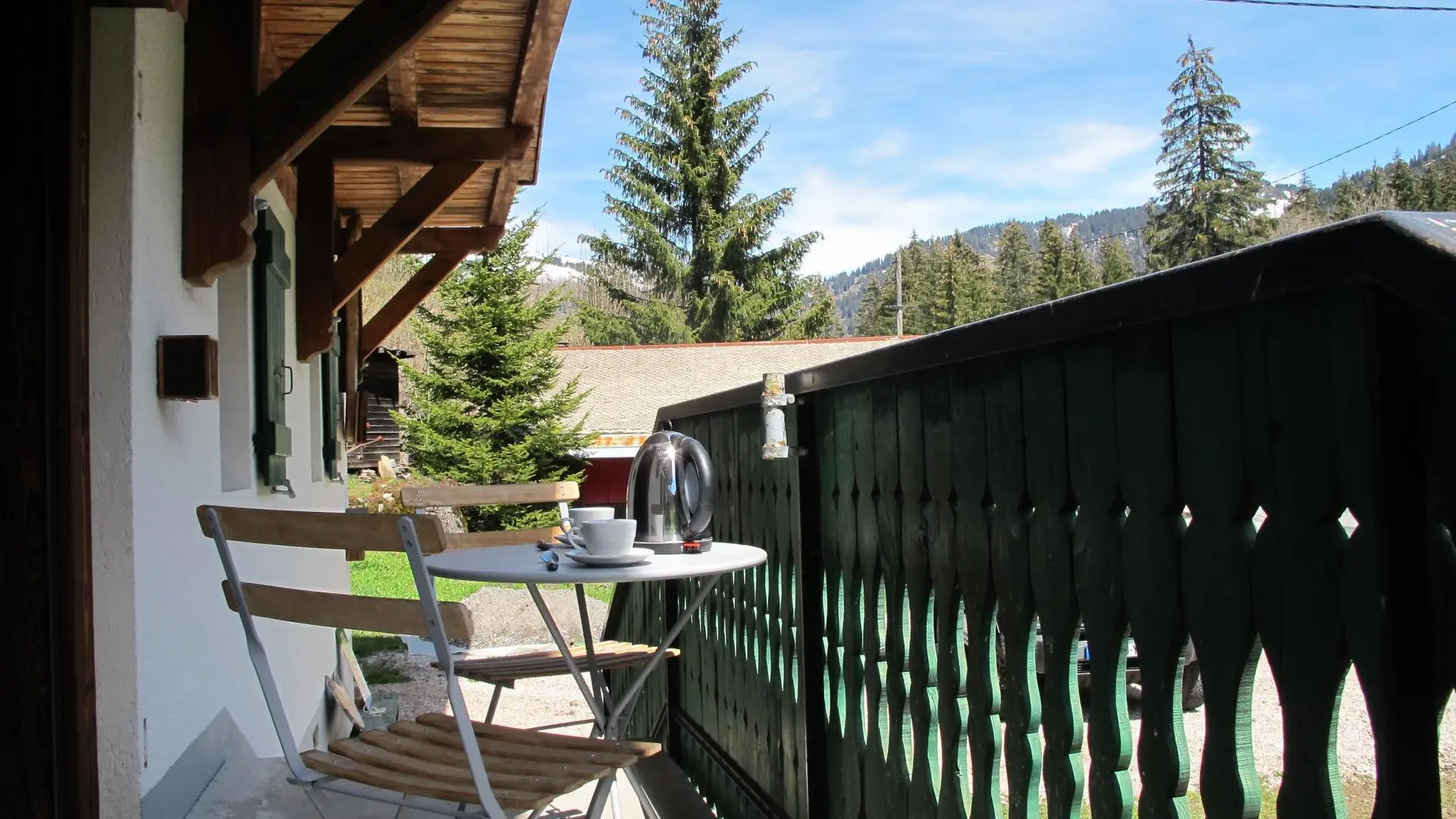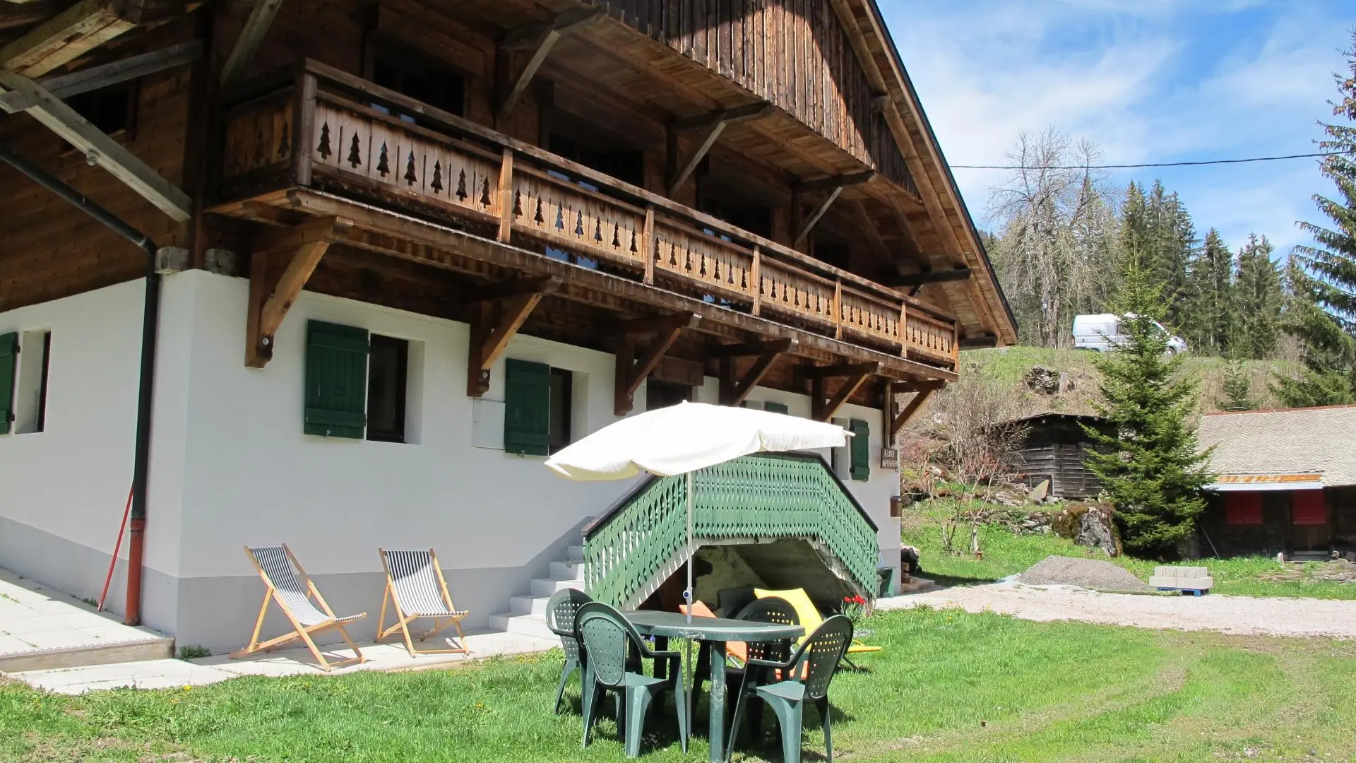 Casier à skis et sèche-chaussures privatifs. Parking privatif devant le chalet. Petit balcon et terrain autour du chalet, salon de jardin privatif installé sur l'avant du chalet. Transats, barbecue. Vue sur les montagnes.