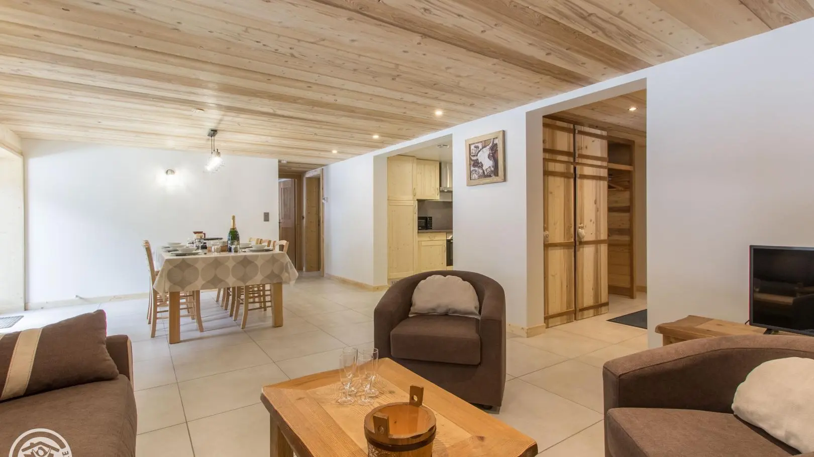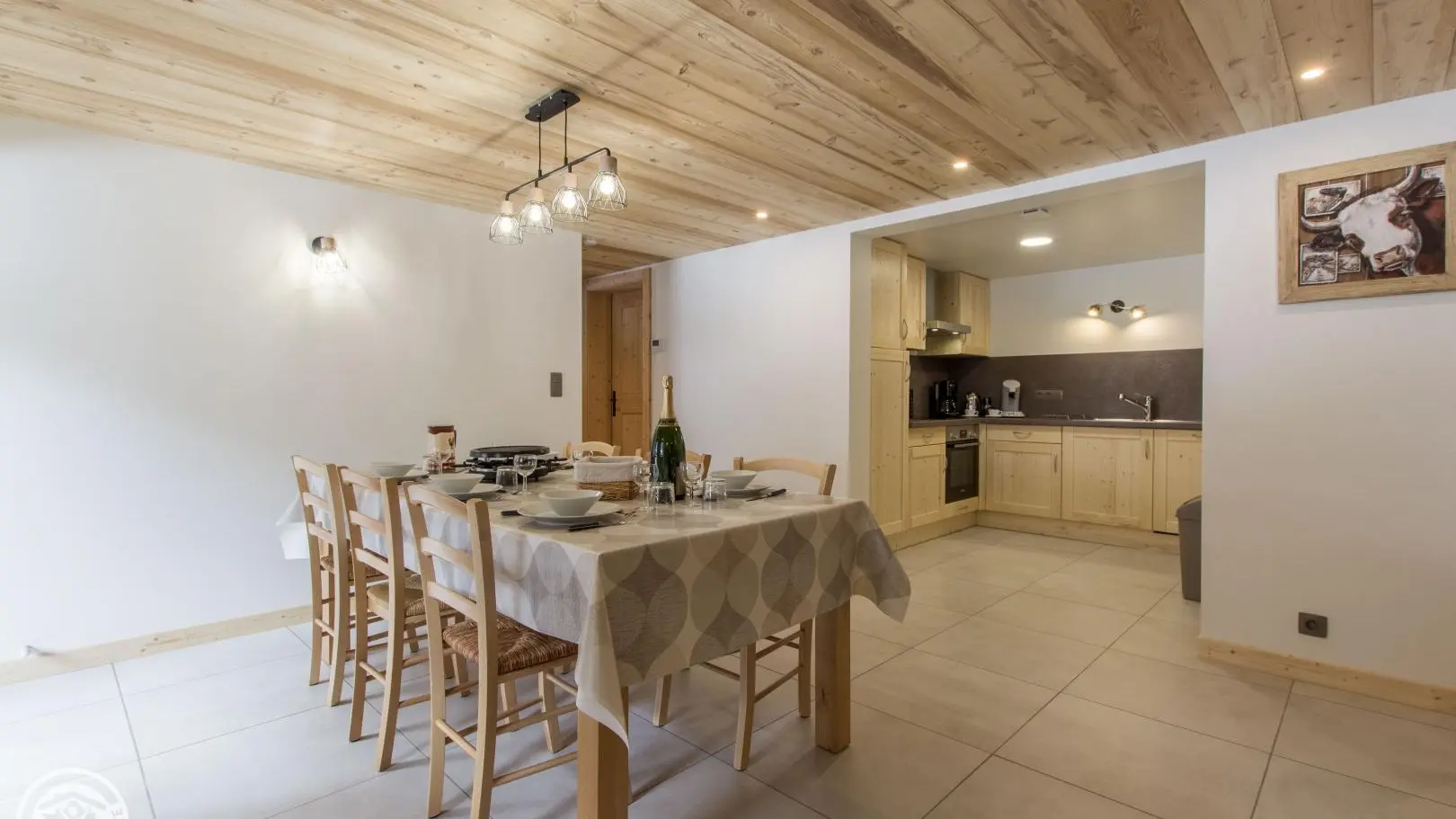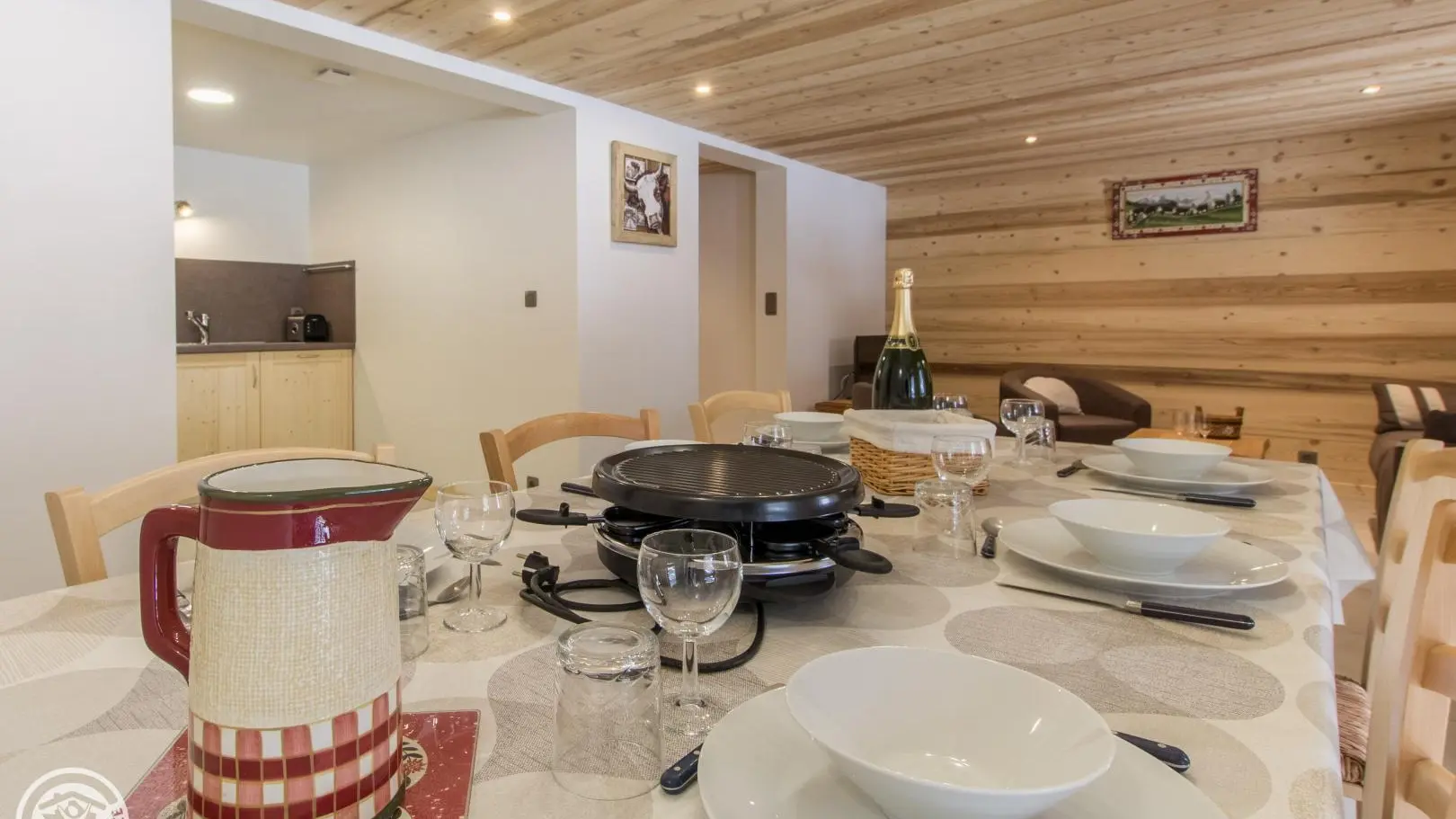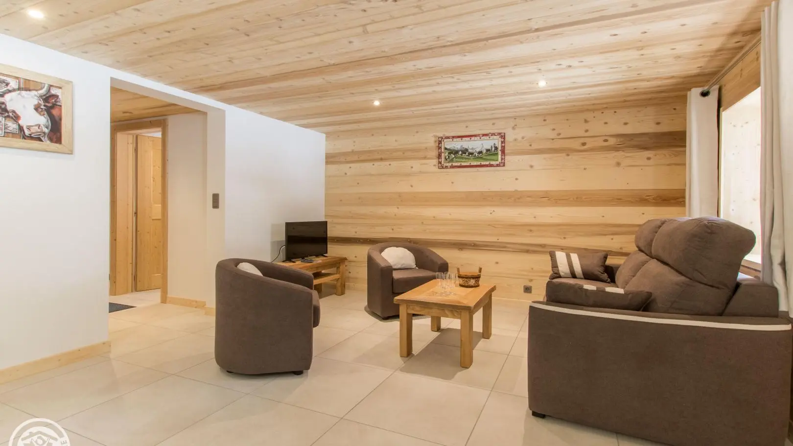 Gîte en rez-de-chaussée surélevé. Capacité 4 à 6 personnes. Entrée commune. Hall d'entrée, cuisine équipée ouverte sur le séjour (table repas, canapé convertible rapido couchage 2 pers., télévision). 2 chambres : chambre 1 (1 lit 160x200cm), chambre 2 (2 lits 90x200cm jumelables permettant de créer un lit double 180x200cm). Salle d'eau avec douche à l'italienne (+ lave-linge), wc indépendant/sèche-chaussures skis. Hauteur sous plafond : 2,13m. Draps fournis, linge de toilette en location, ménage de fin de séjour en option. Accès internet wifi.