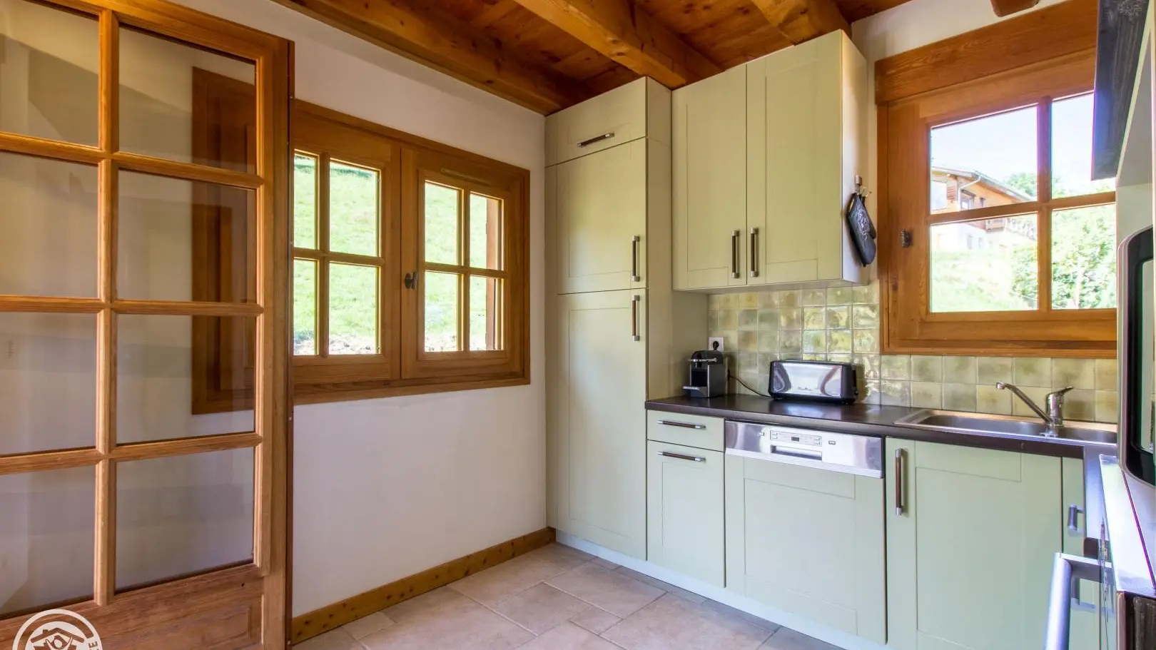 Très belle vue sur les montagnes environnantes depuis l'ensemble des pièces du chalet : Mont-Blanc, Fiz et Aravis. Au 1er étage du chalet (accès par escalier extérieur ou intérieur) : cuisine intégrée indépendante, salon (canapé, Tv, espace repas, poêle à bois), wc indépendant.
