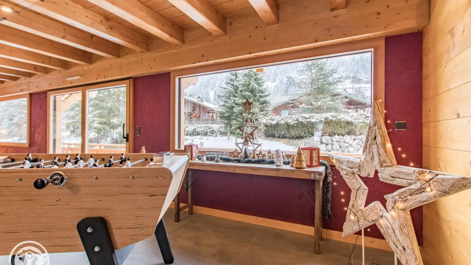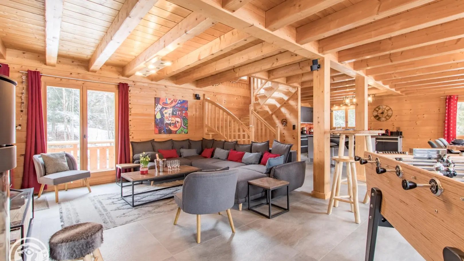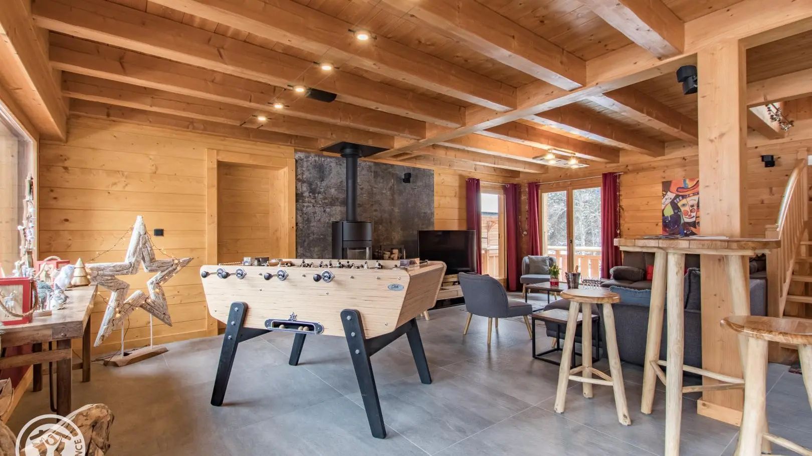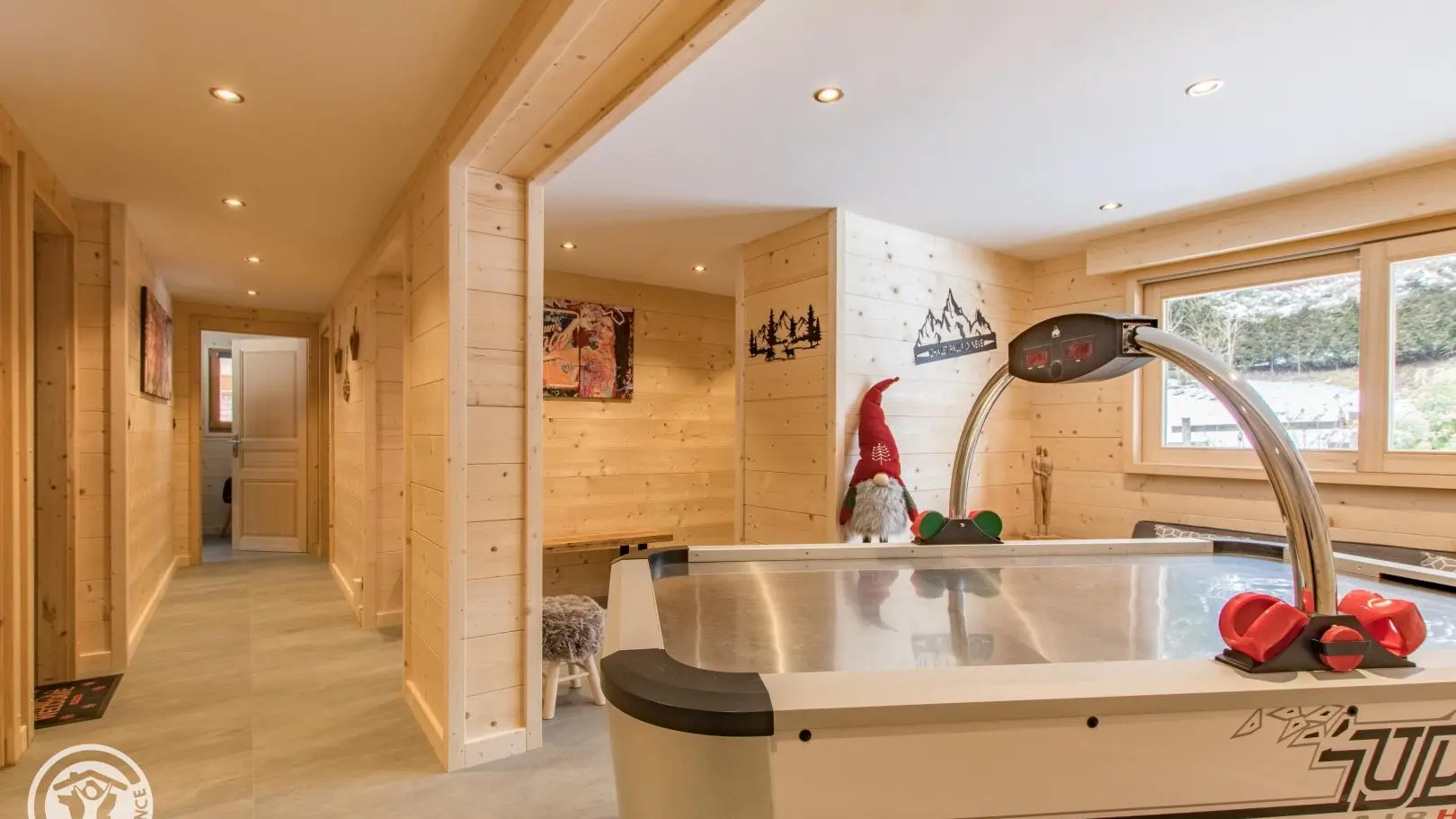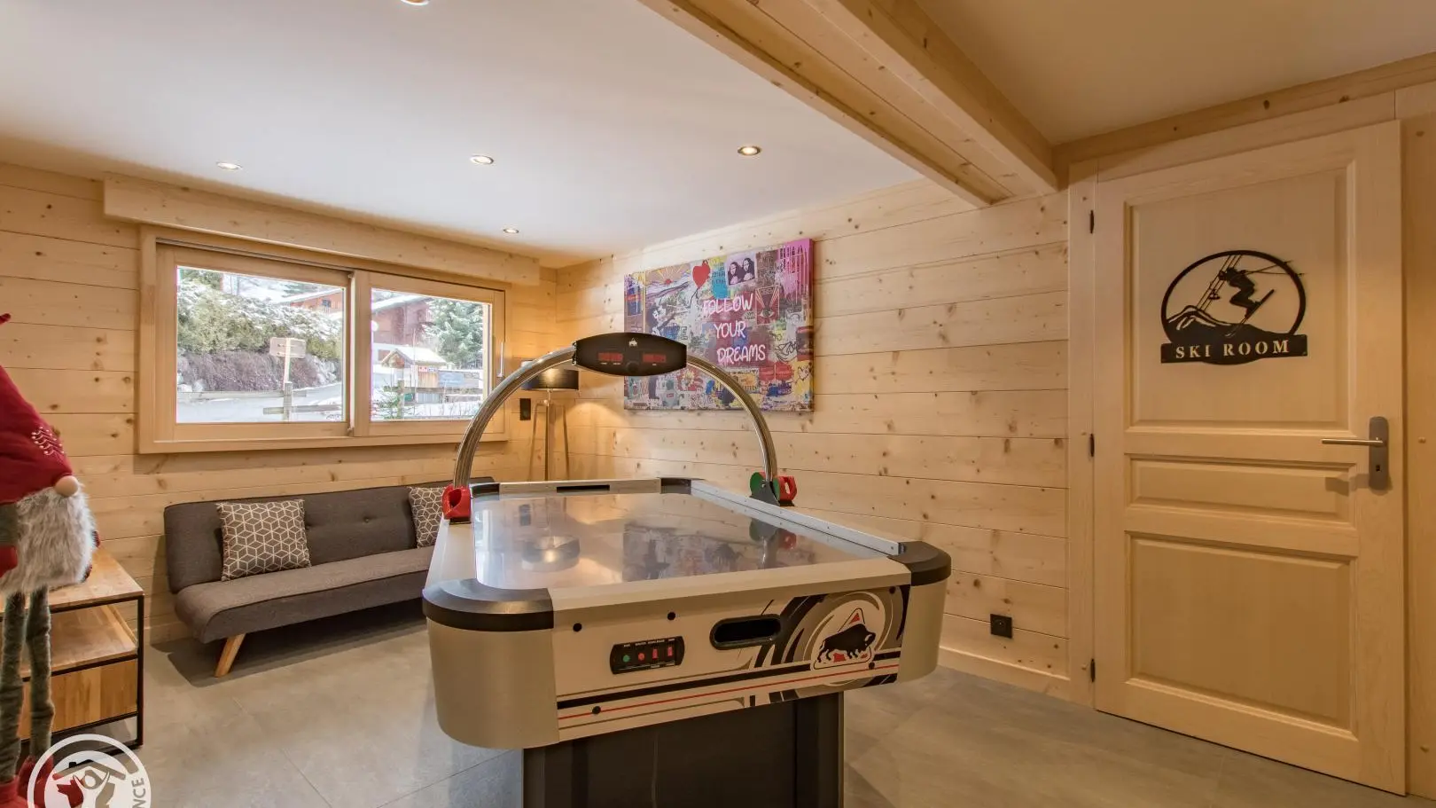 Au rez-de-chaussée : ch 5 (2 lits 80x200cm jumelables, salle d'eau/WC), ch 6 (2 lits 90x190cm superposés, salle d'eau). Hall d'entrée, salle de jeux avec jeu Air Hockey, canapé, skiroom, buanderie avec lave-linge séchant.