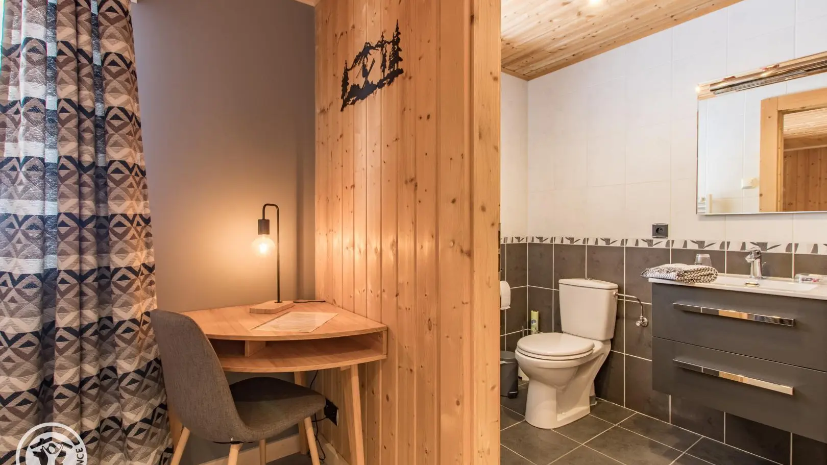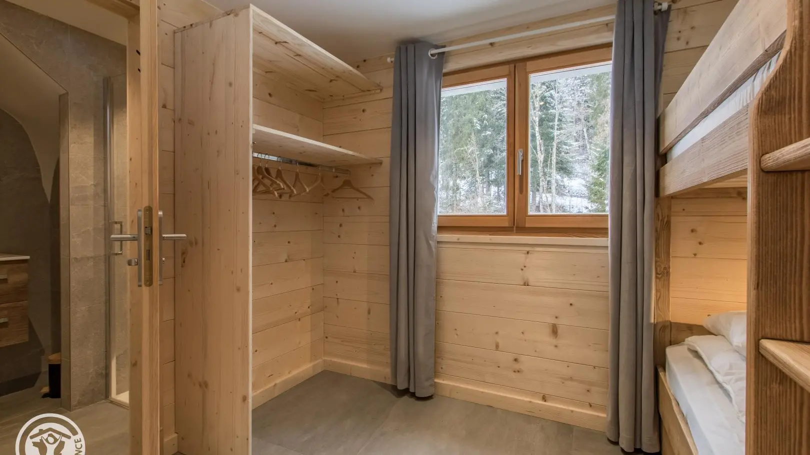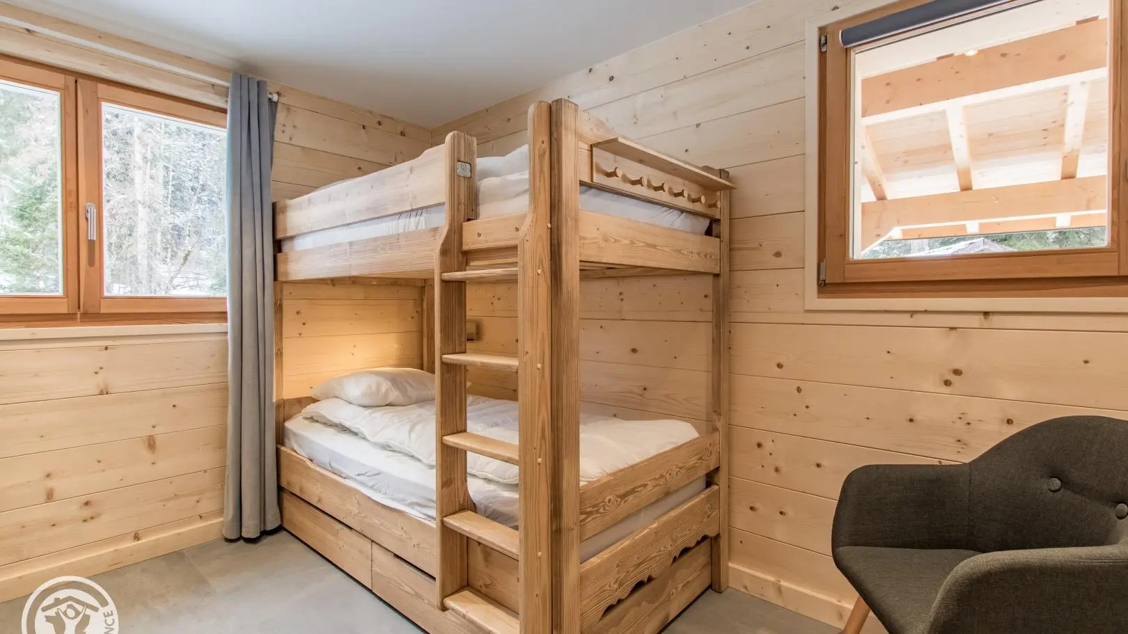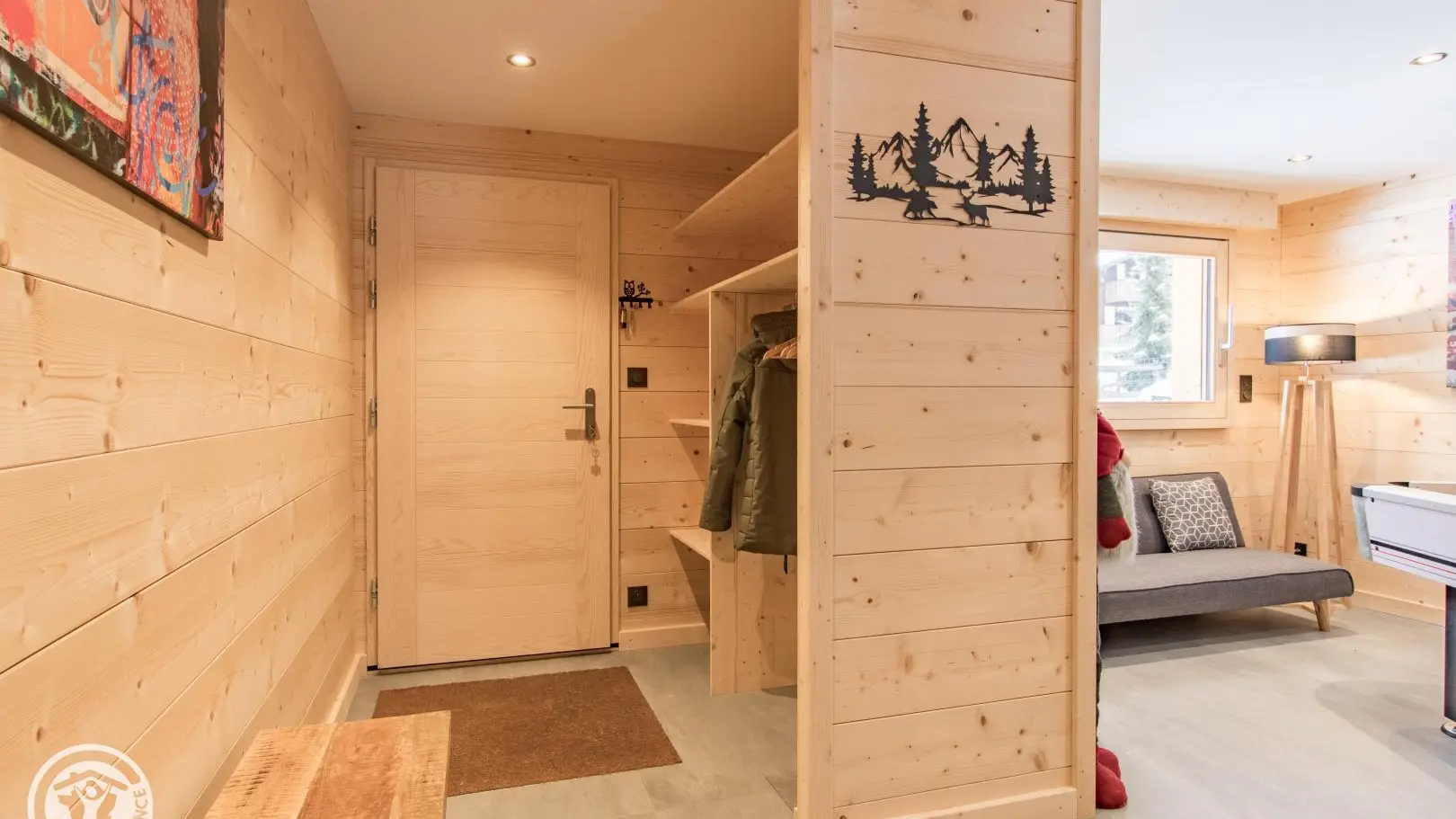 Au rez-de-chaussée : ch 5 (2 lits 80x200cm jumelables, salle d'eau/WC), ch 6 (2 lits 90x190cm superposés, salle d'eau). Hall d'entrée, salle de jeux avec jeu Air Hockey, canapé, skiroom, buanderie avec lave-linge séchant.