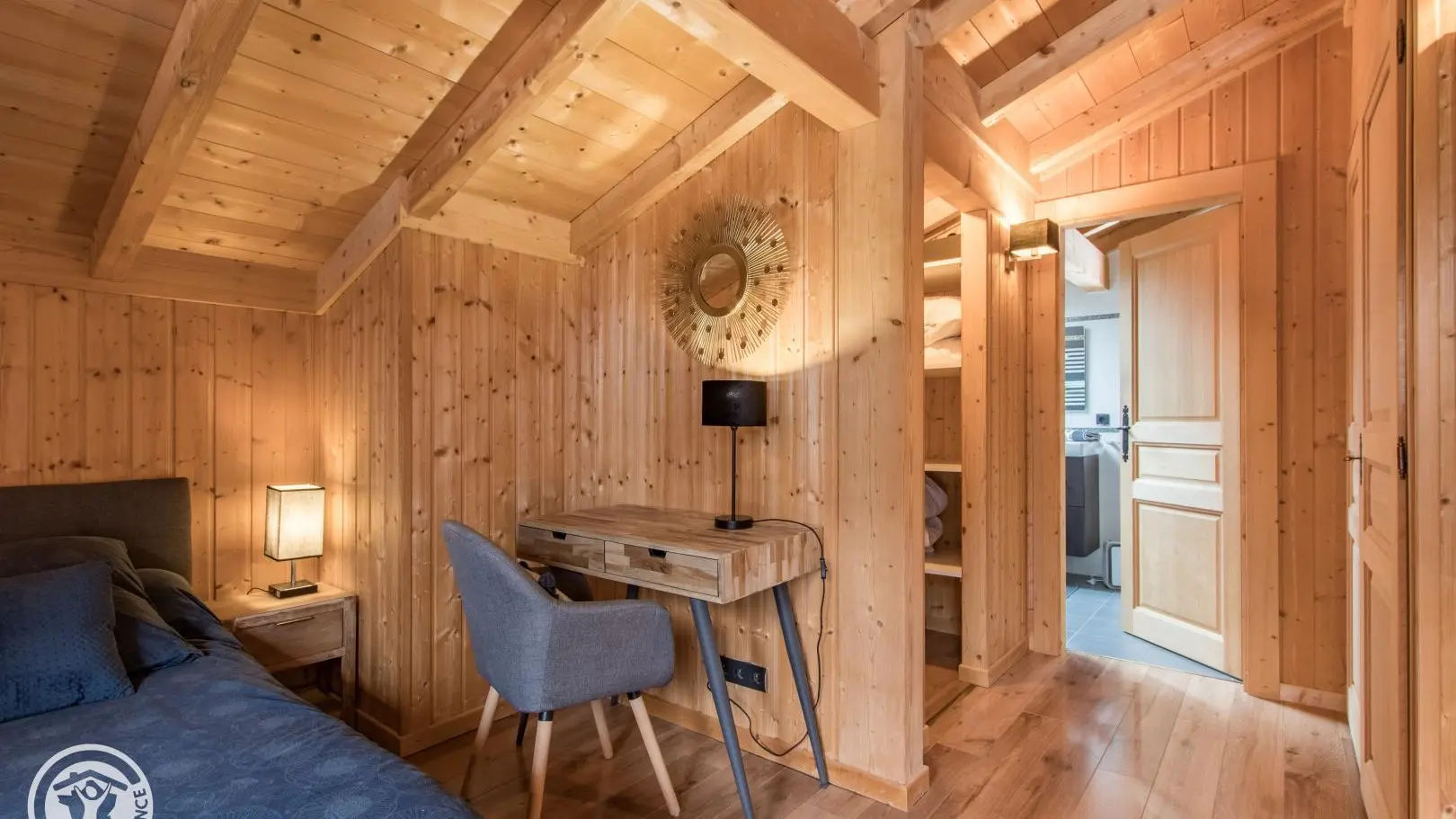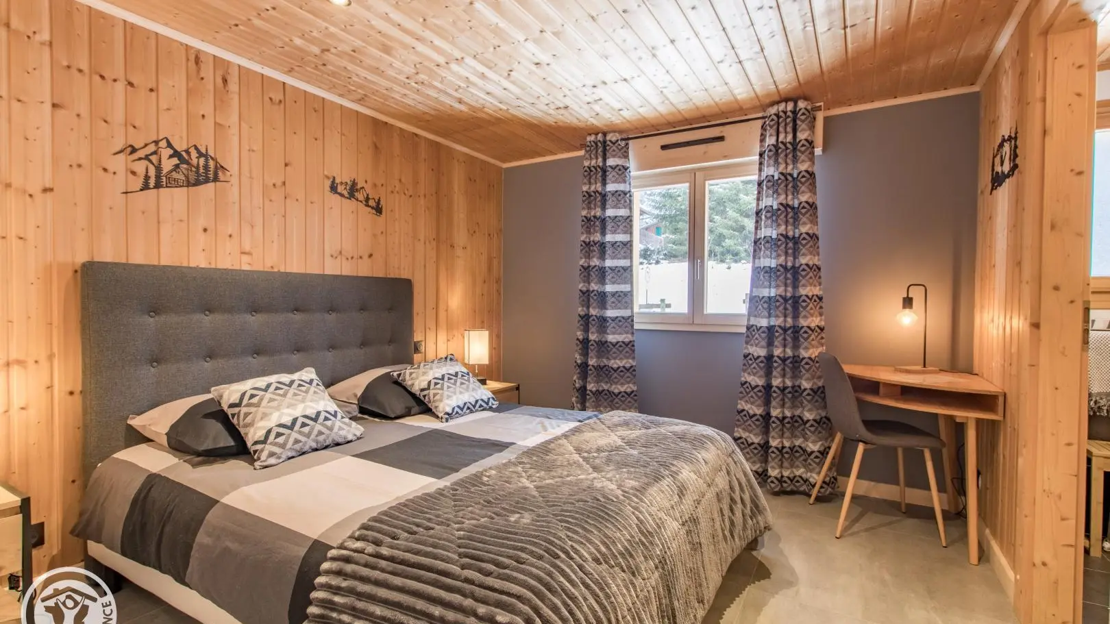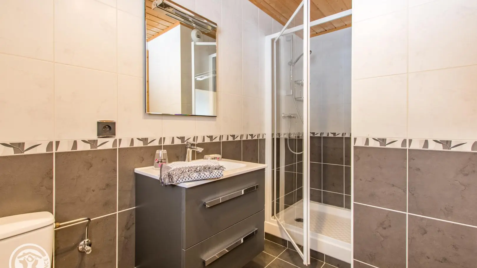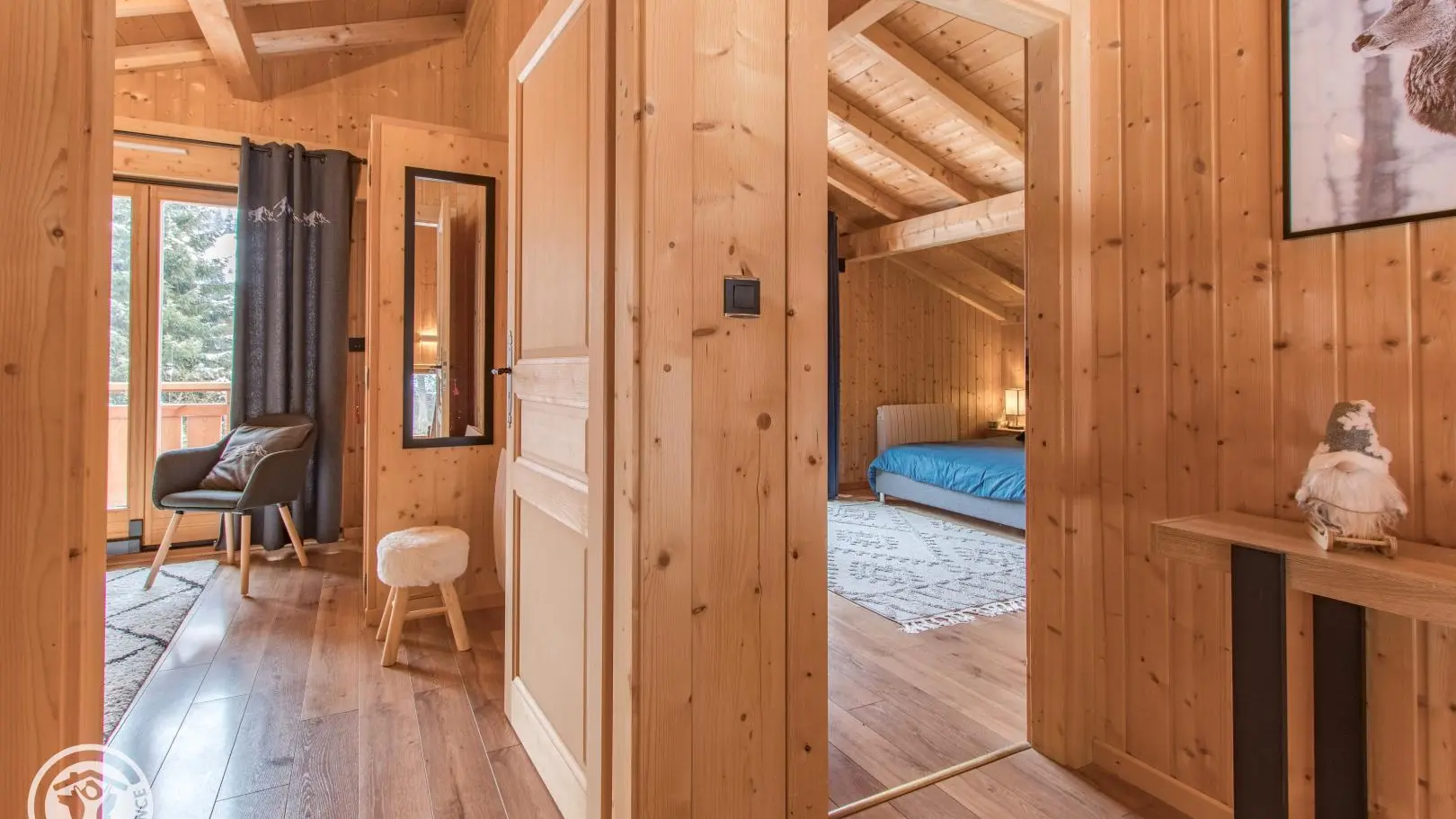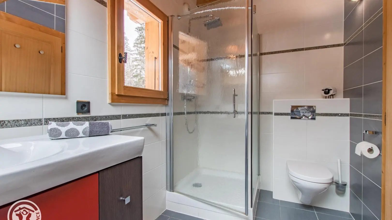 Au rez-de-chaussée : ch 5 (2 lits 80x200cm jumelables, salle d'eau/WC), ch 6 (2 lits 90x190cm superposés, salle d'eau). Hall d'entrée, salle de jeux avec jeu Air Hockey, canapé, skiroom, buanderie avec lave-linge séchant.