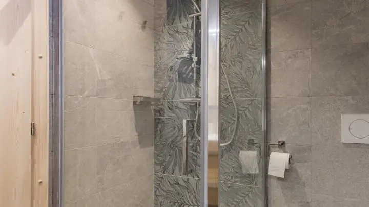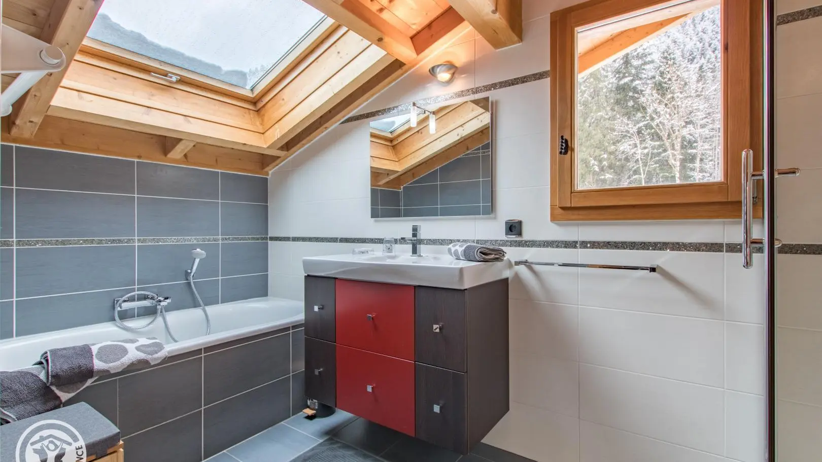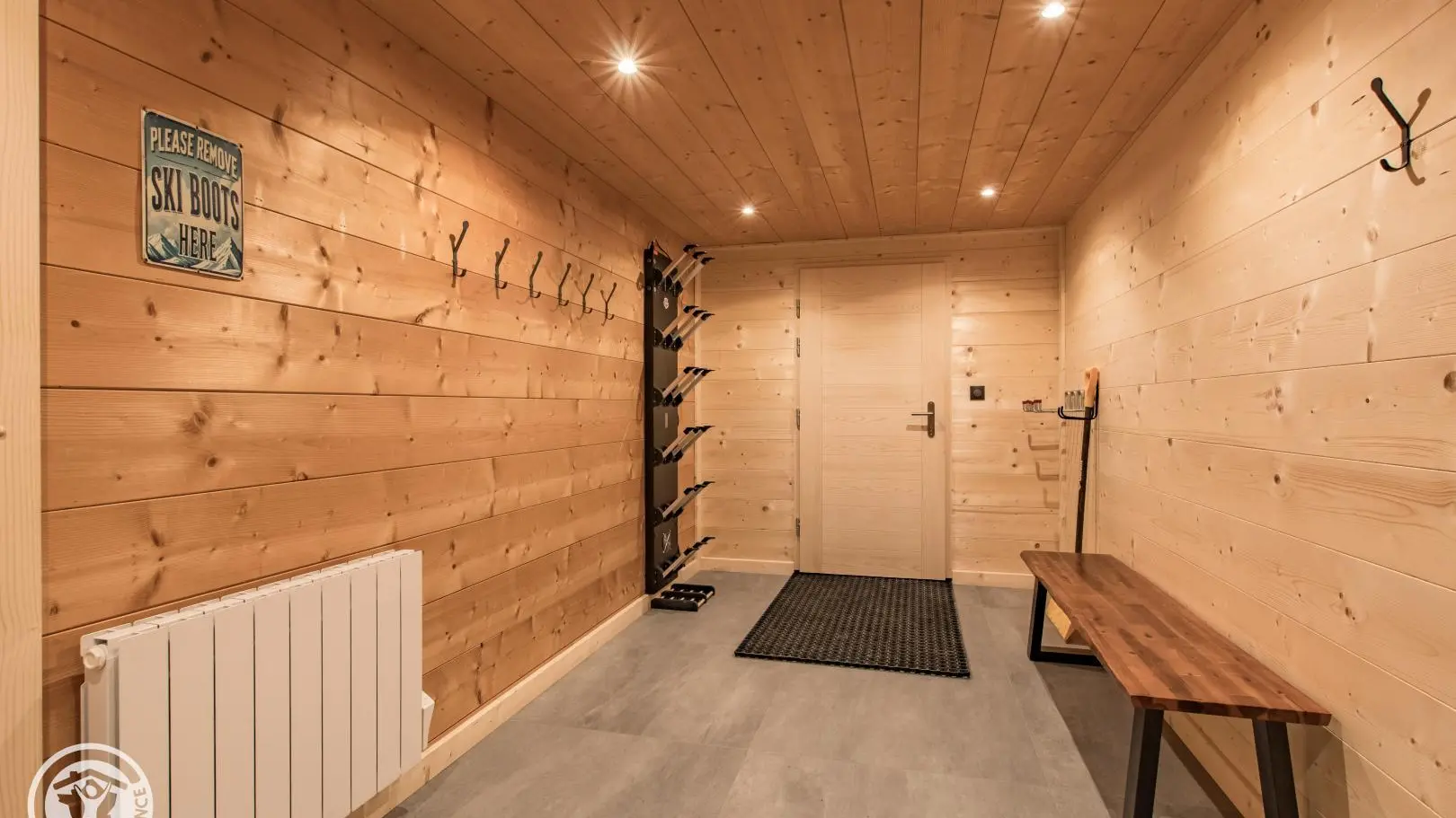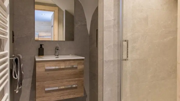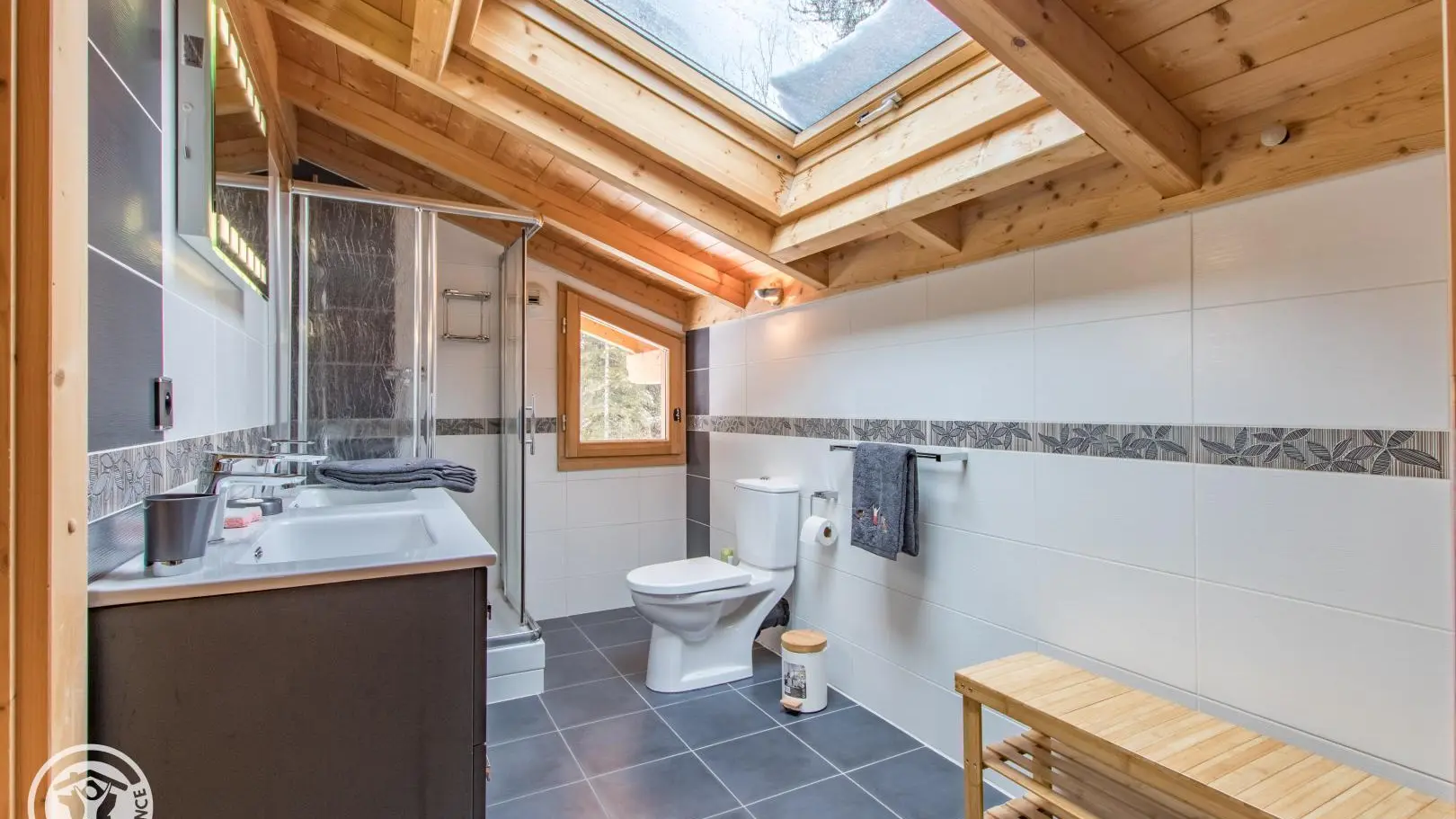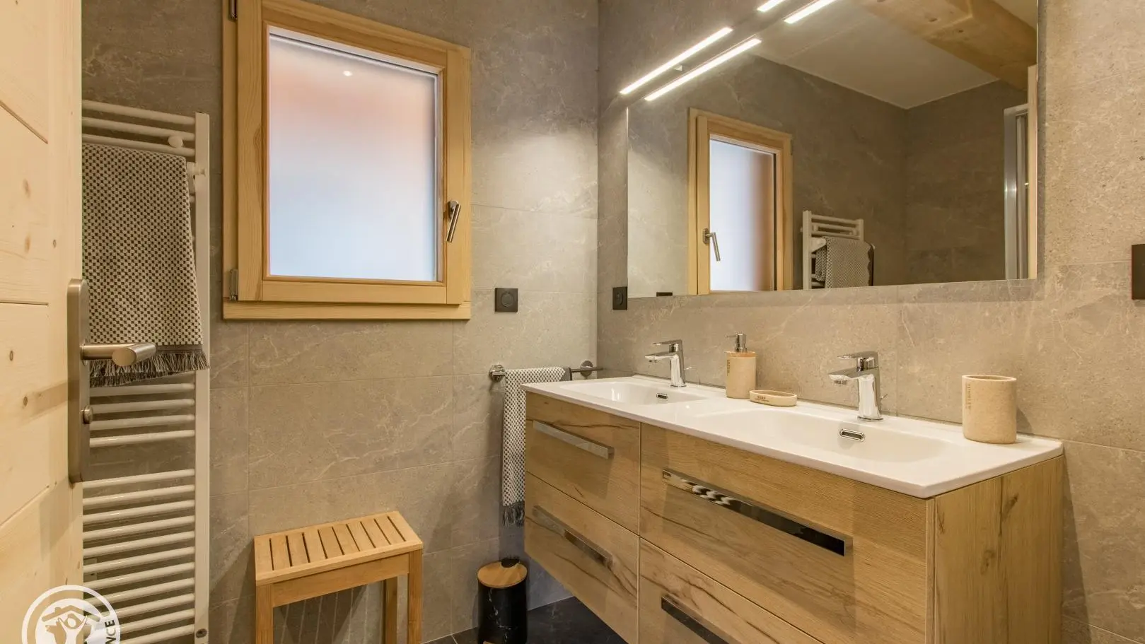 Au rez-de-chaussée : ch 5 (2 lits 80x200cm jumelables, salle d'eau/WC), ch 6 (2 lits 90x190cm superposés, salle d'eau). Hall d'entrée, salle de jeux avec jeu Air Hockey, canapé, skiroom, buanderie avec lave-linge séchant.