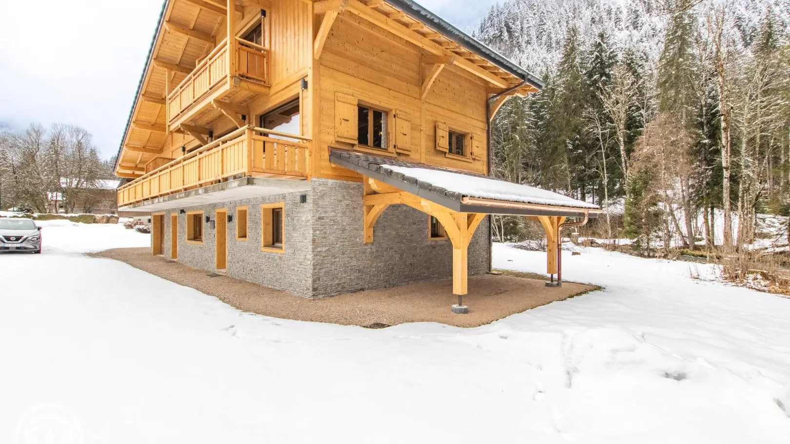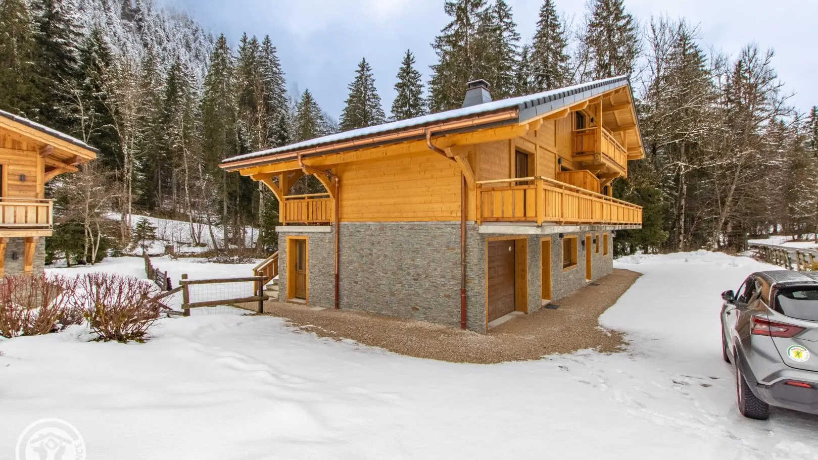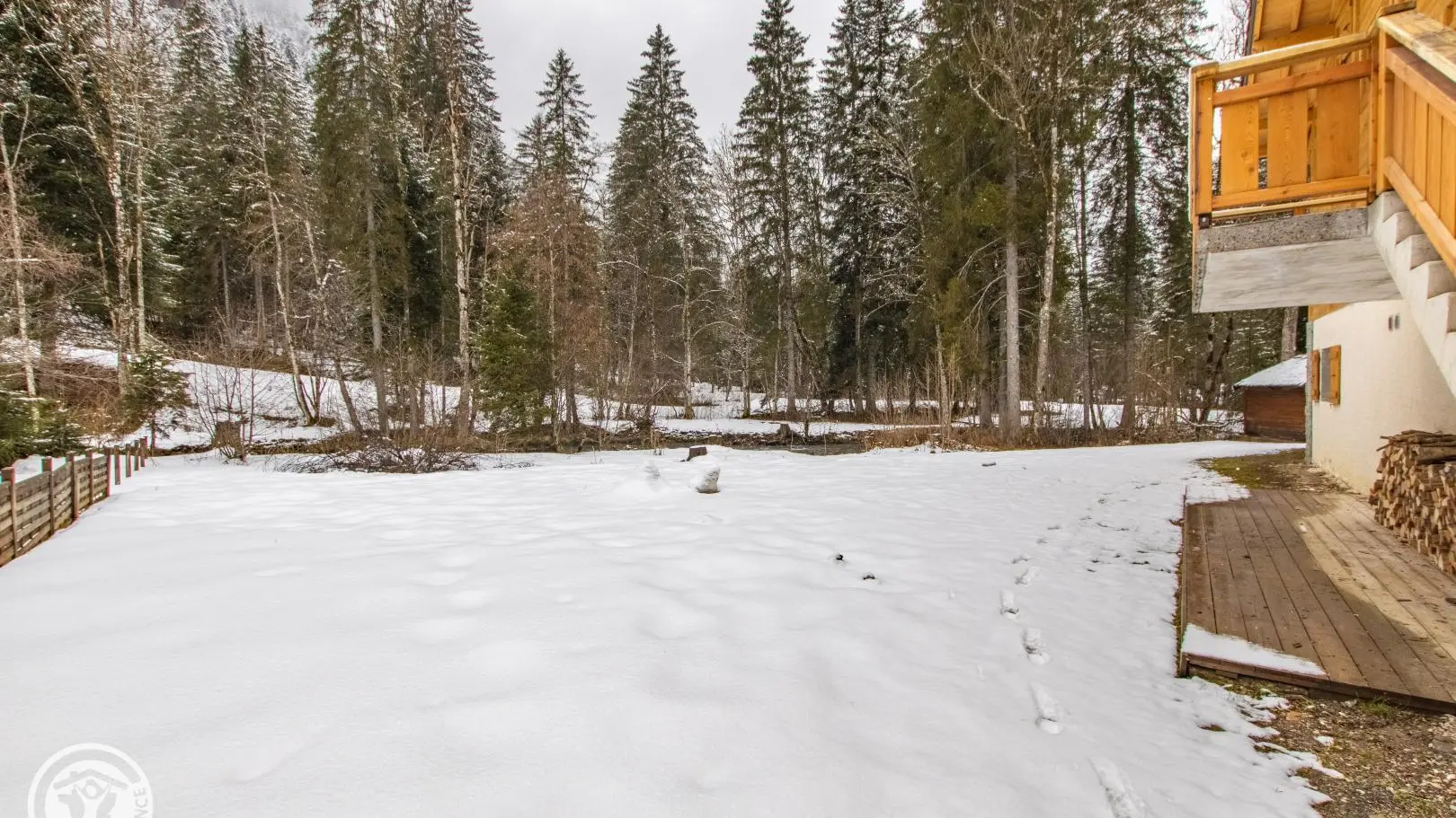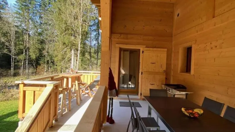Balcons. Terrasse avec salon de jardin sur l'arrière du chalet, côté rivière. Plancha électrique, transats. Jardin / terrain. Parking privatif sur place et garage 1 voiture + abri 1 voiture.