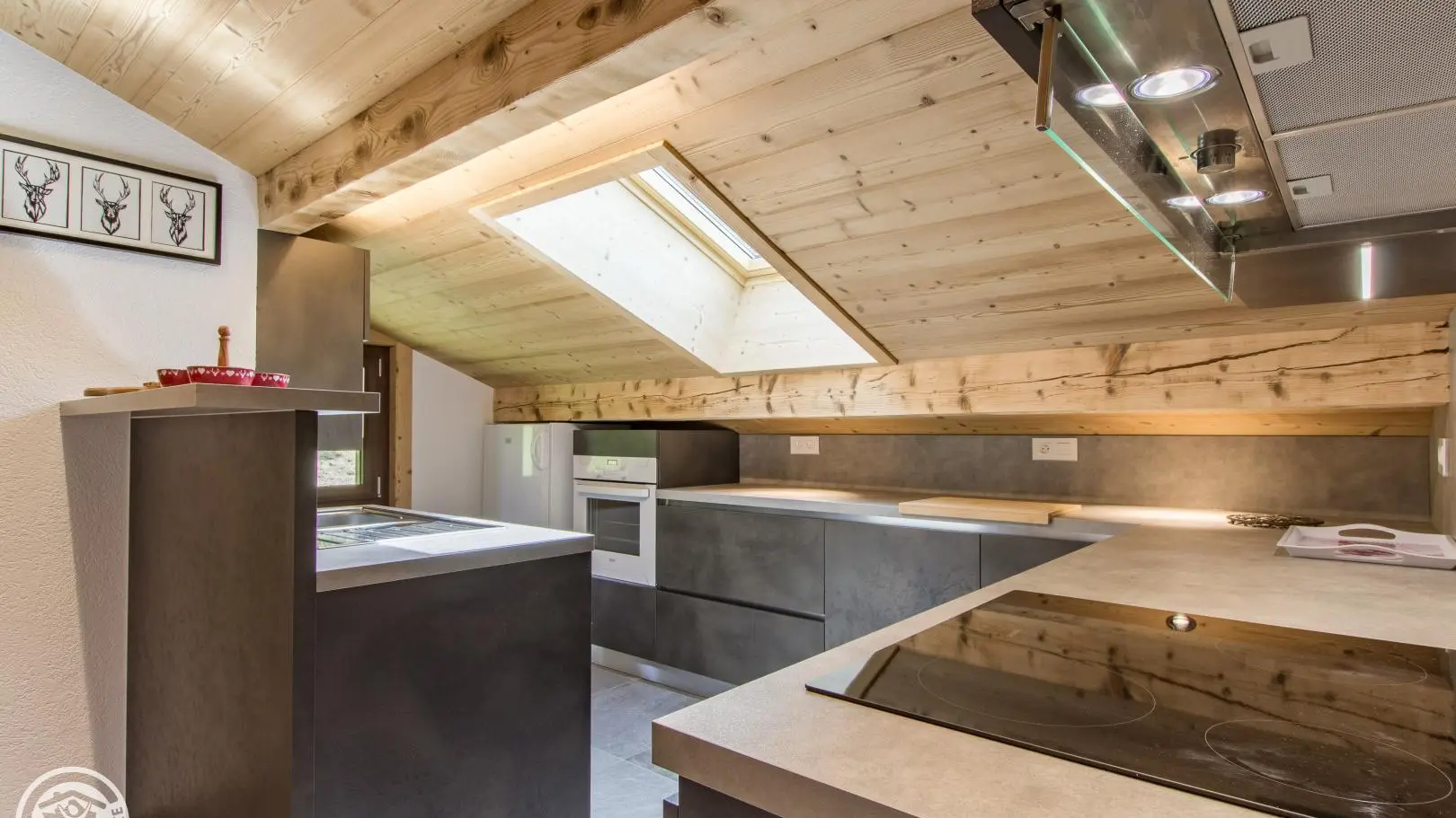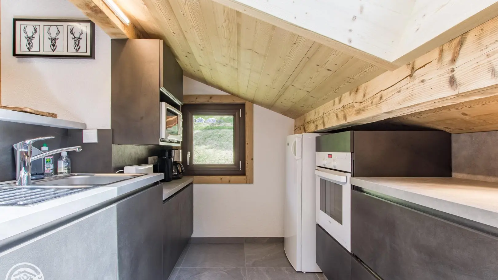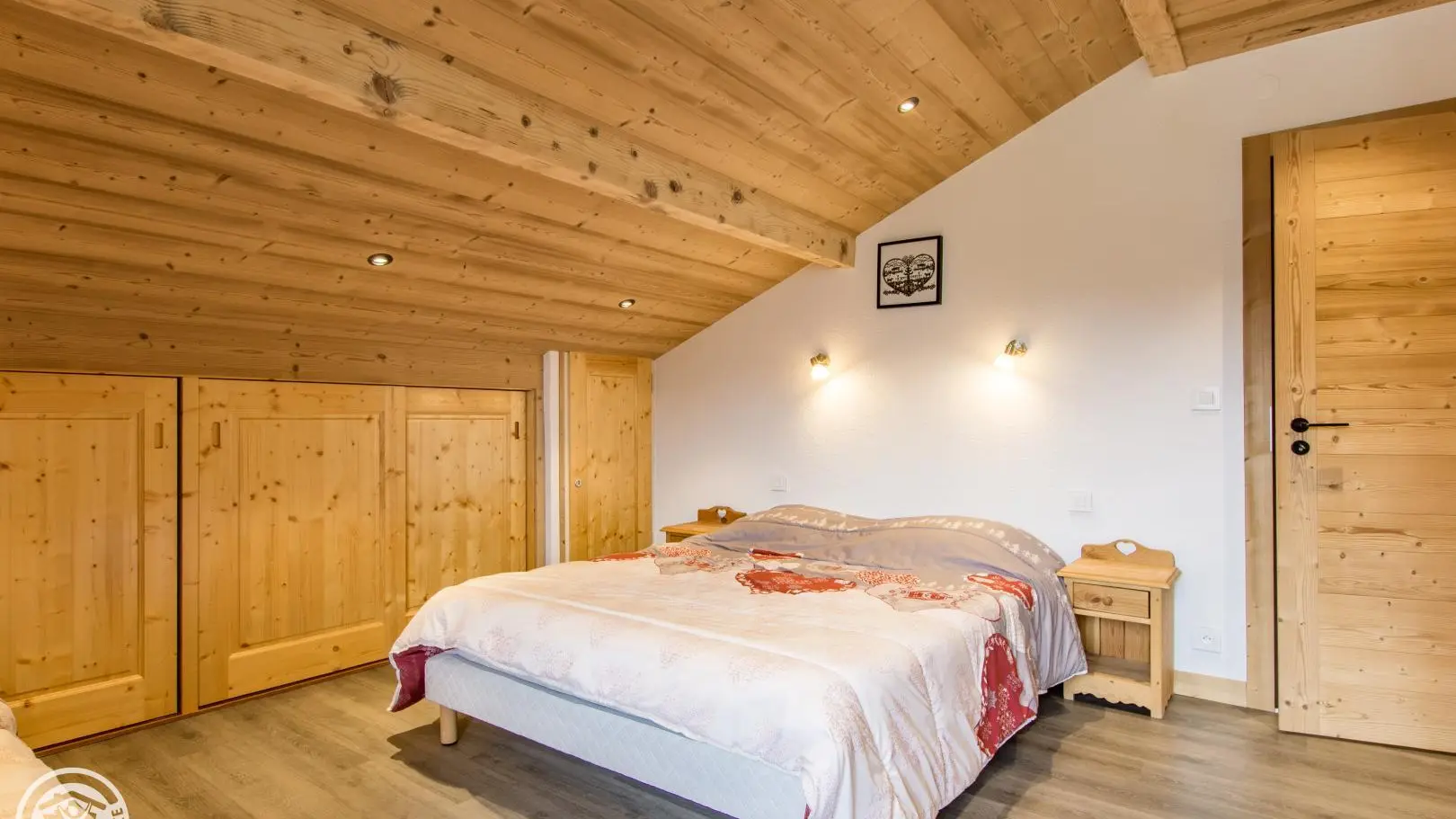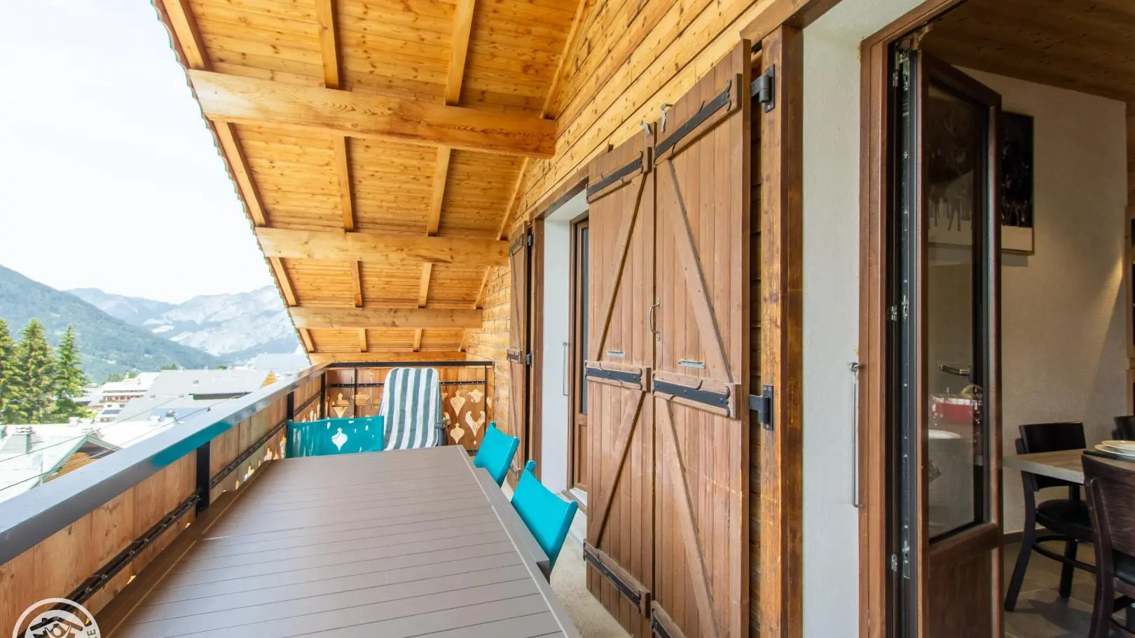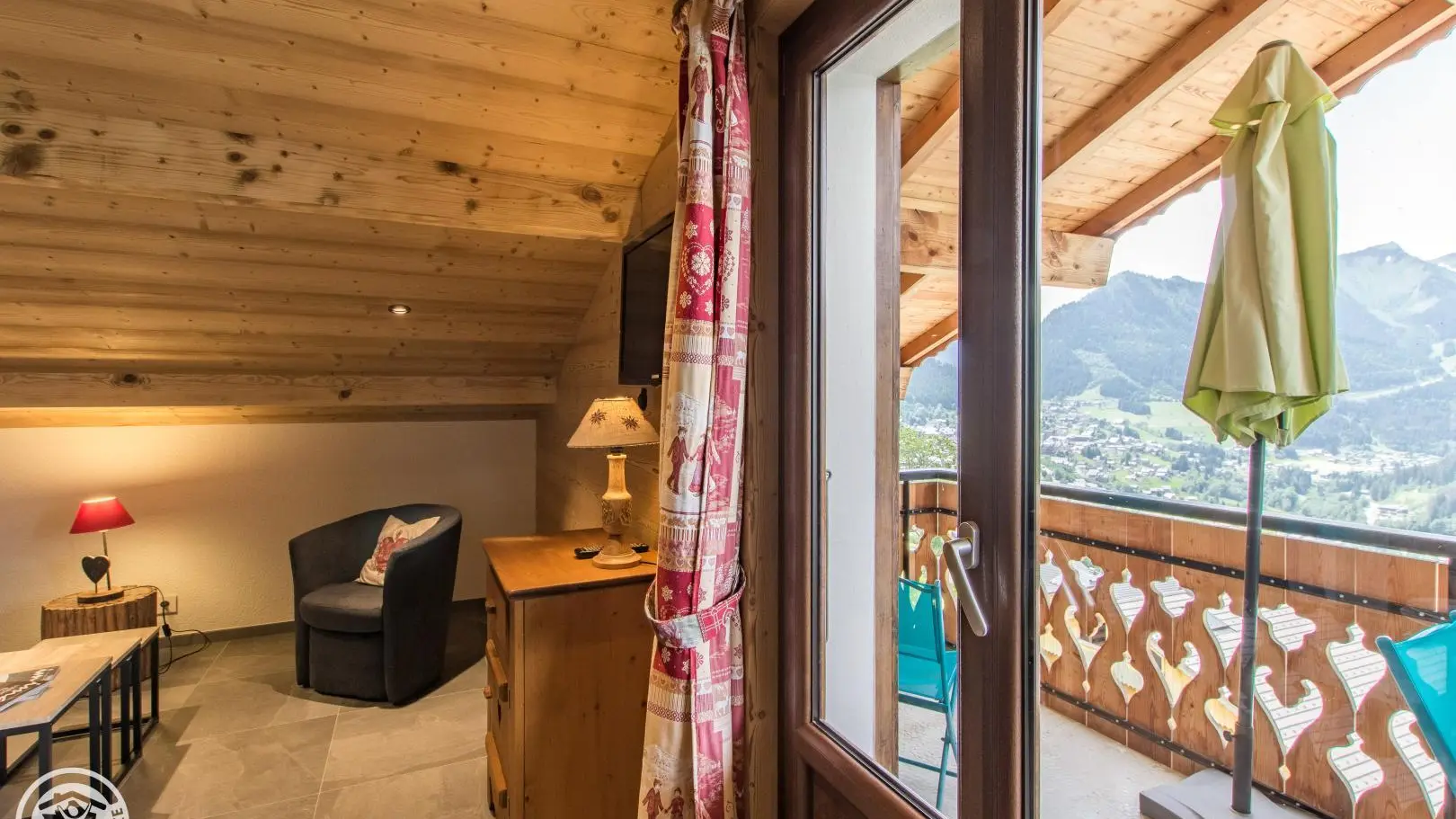 Dans un grand chalet comprenant 3 gîtes, gîte mansardé de 45m² (+18m² mansardés) aménagé au dernier étage (3ème). Entrée commune. Vue sur les montagnes et le village.