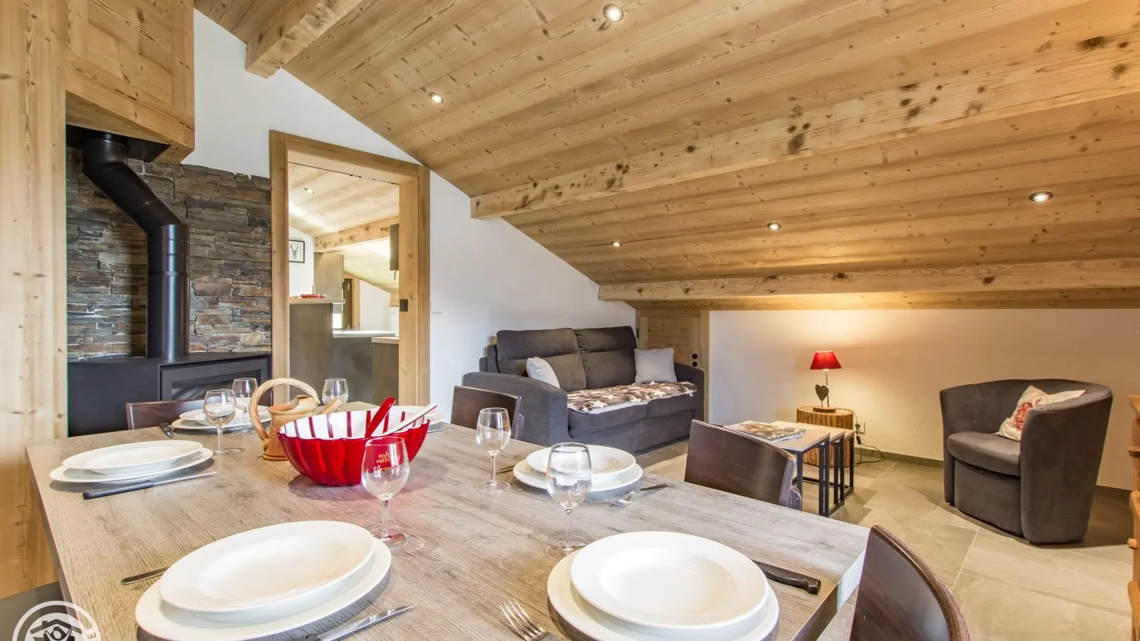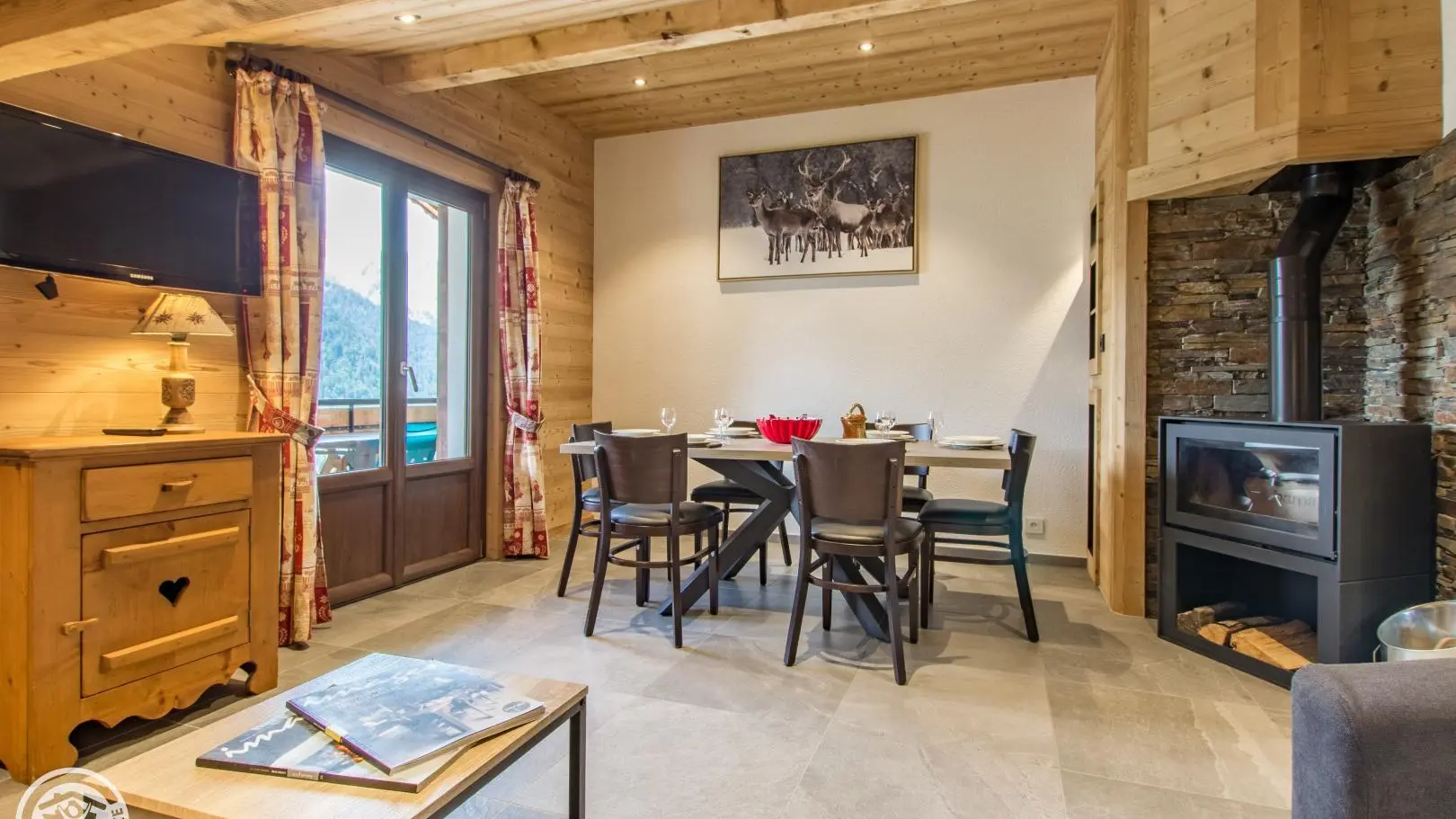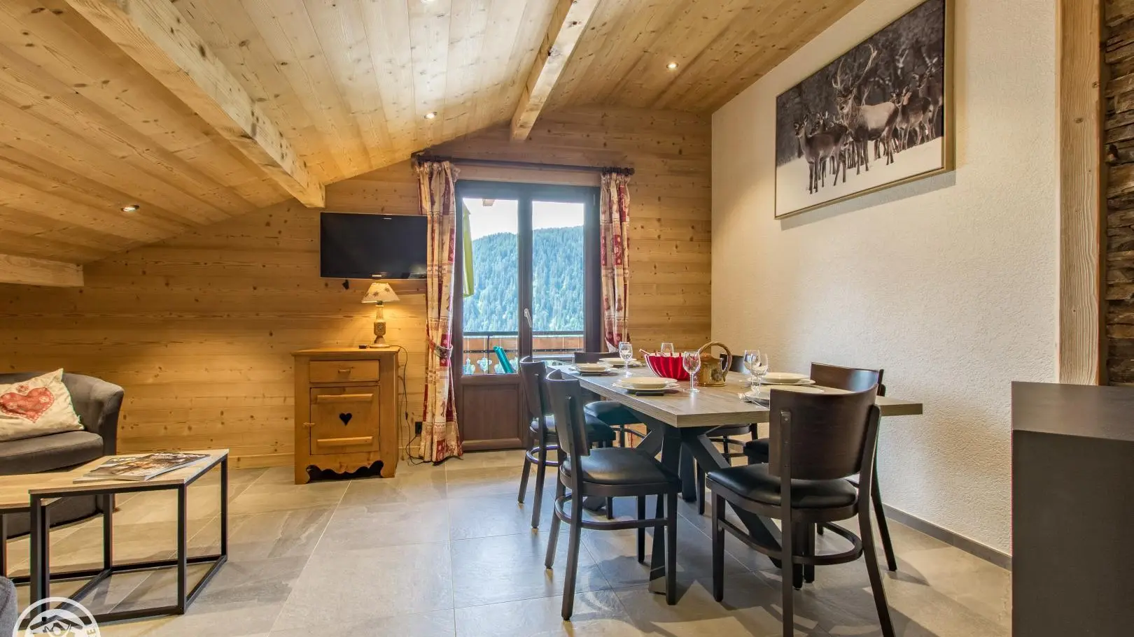 Cuisine, séjour (canapé convertible type rapido, télévision 80cm, poêle à bois, table repas), accès au balcon orienté Sud. 2 chambres : chambre 1 (1 lit 160x200cm + 1 lit 90x190cm, accès balcon), chambre 2 mansardée (2 lits 90x190cm rapprochables). 2 salles d'eau avec douche à l'italienne dont une avec WC. Accès internet wifi. Lave-linge commun aux 3 gîtes. Casier à skis privatif. En option : draps, linge de toilette, ménage de fin de séjour. 1 place de parking privatif dans garage commun + parking à côté du chalet. Balcon avec mobilier de jardin, vue sur les montagnes et Chatel.