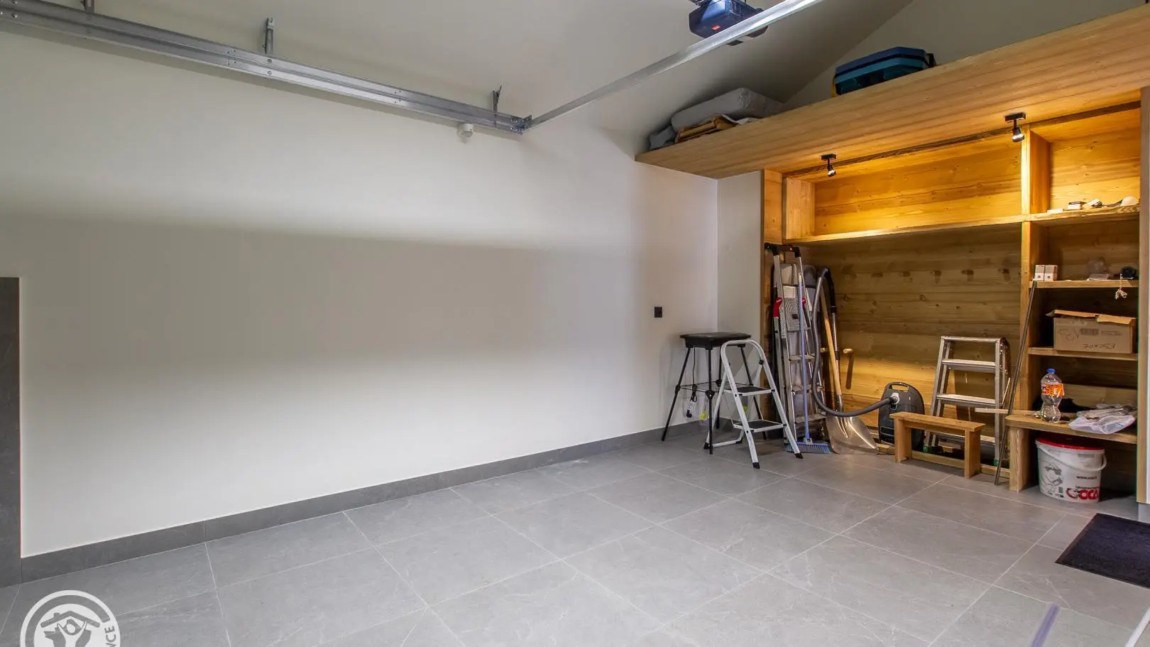 Garage chauffé de 17m2 avec espace de rangement pour les skis, et prise renforcée . Cour privée (3 places possibles).