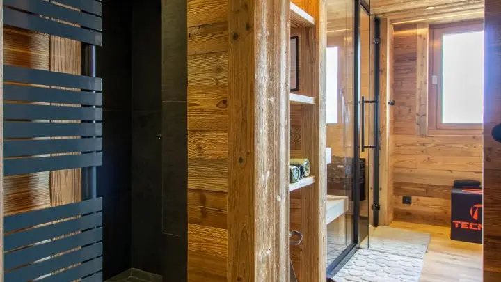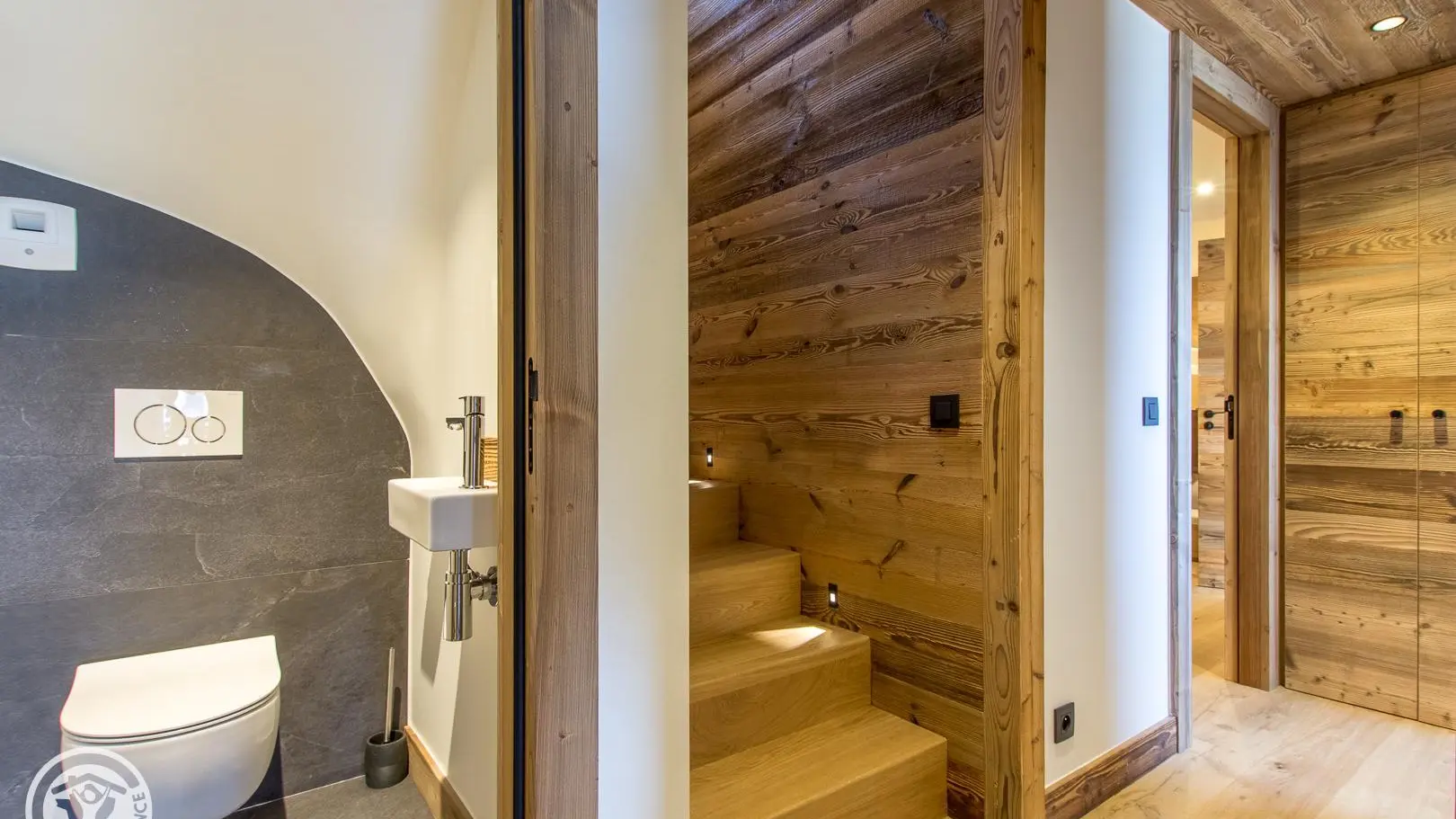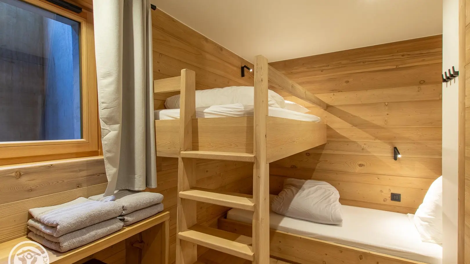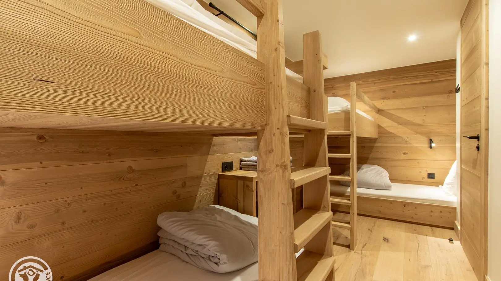 Au niveau inférieur du chalet : chambre 1 (1 lit 160x200cm, salle d'eau semi-ouverte avec douche), chambre 2 (2 lits 90x200cm regroupables, Tv, salle de bains privative avec baignoire), chambre 3 (4 lits 90x200cm dont 2 en hauteur), salle bien-être/fitness (sauna, vélo), salle d'eau avec douche, buanderie, wc indépendant.