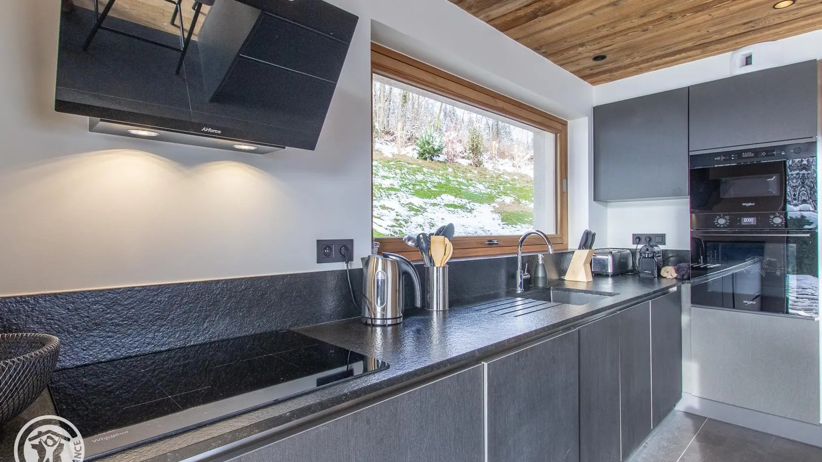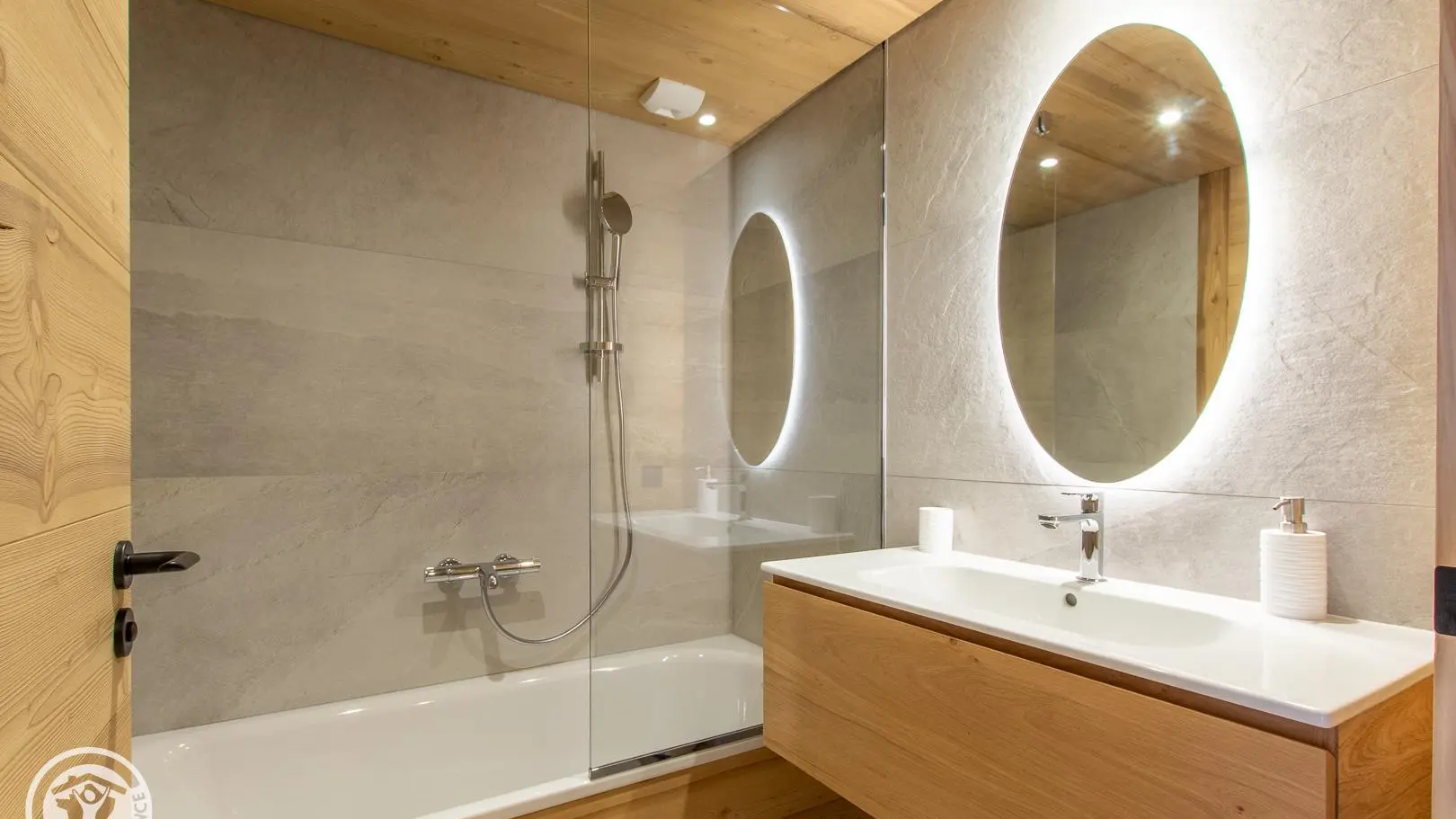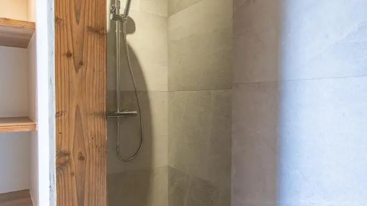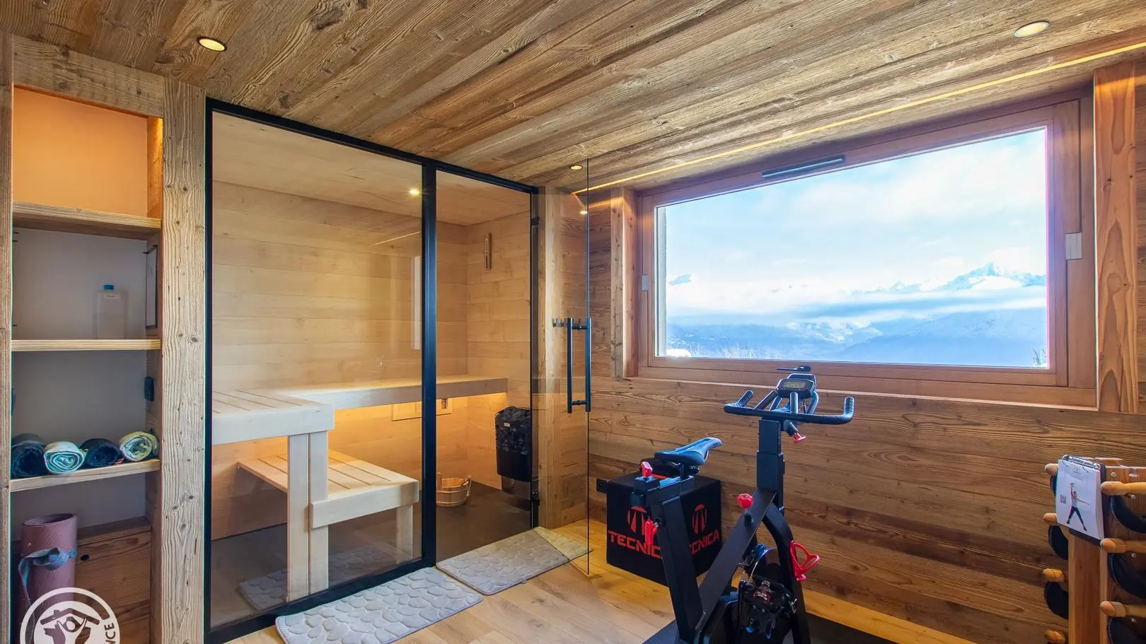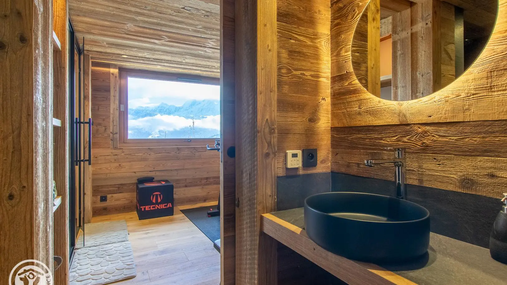 Au niveau inférieur du chalet : chambre 1 (1 lit 160x200cm, salle d'eau semi-ouverte avec douche), chambre 2 (2 lits 90x200cm regroupables, Tv, salle de bains privative avec baignoire), chambre 3 (4 lits 90x200cm dont 2 en hauteur), salle bien-être/fitness (sauna, vélo), salle d'eau avec douche, buanderie, wc indépendant.