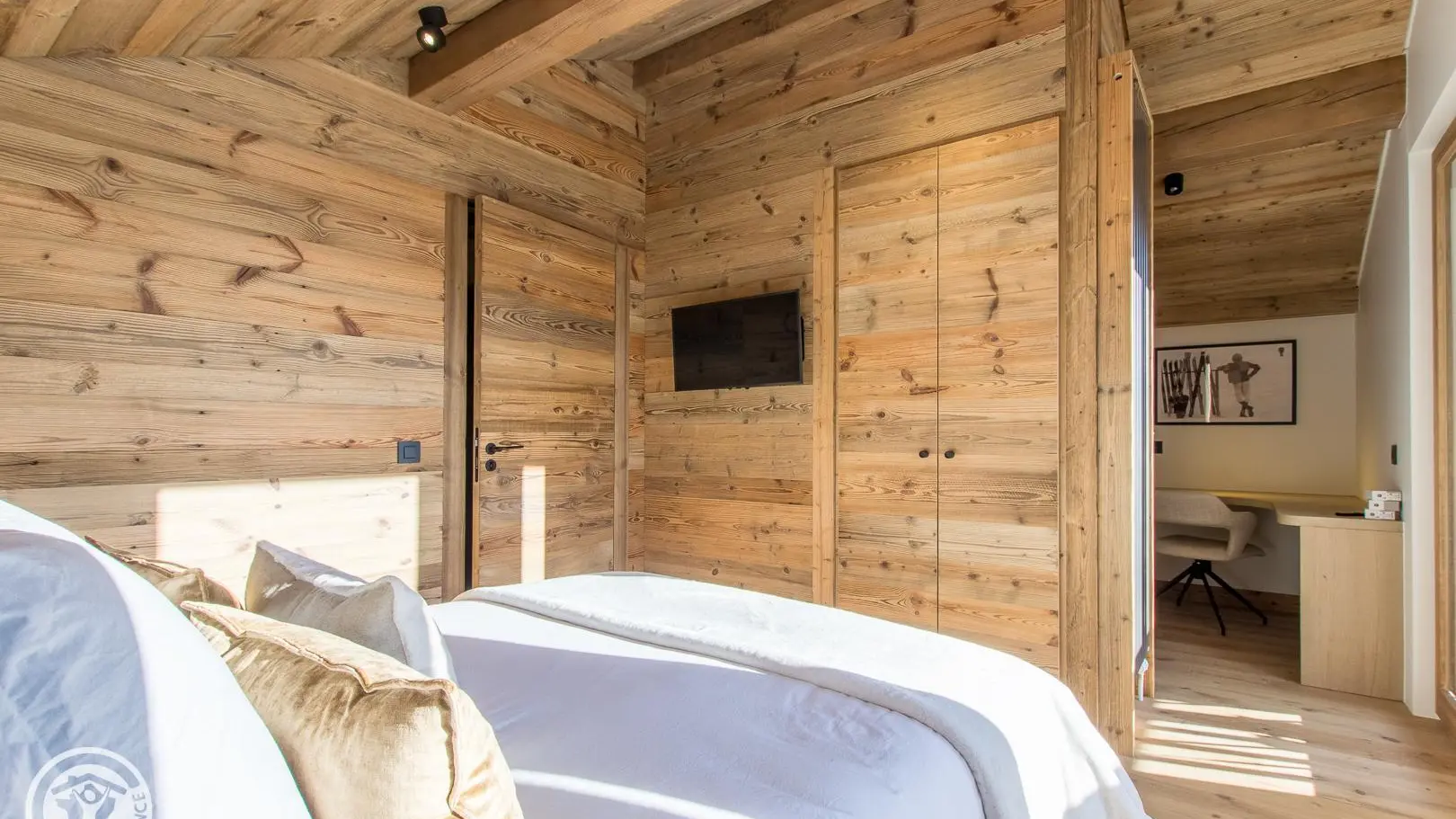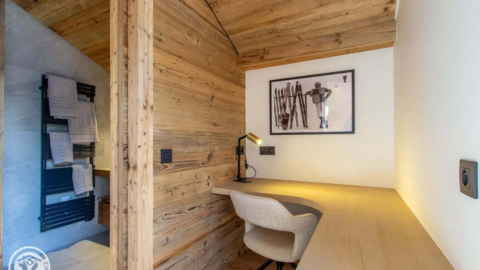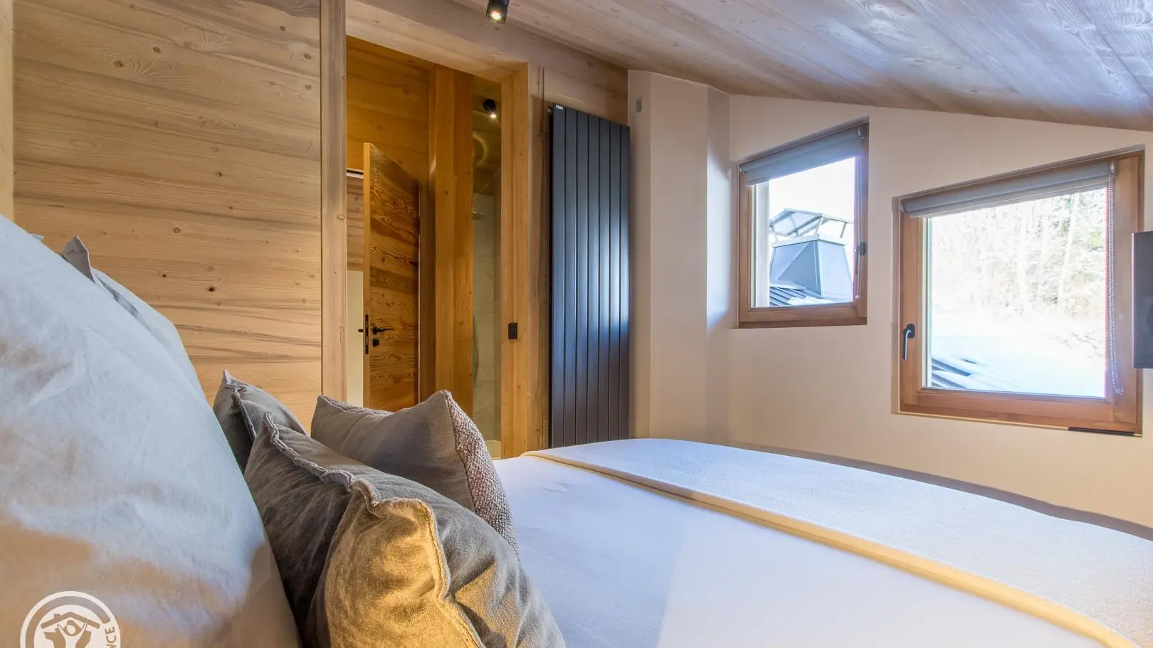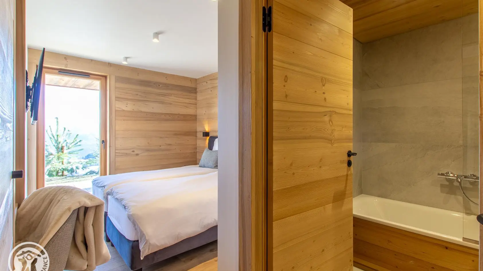 A l'étage du chalet : chambre 4 (1 lit 160x200cm, Tv, coin bureau, salle d'eau avec douche), chambre 5 (1 lit 160x200cm, Tv, salle d'eau semi-ouverte avec douche).