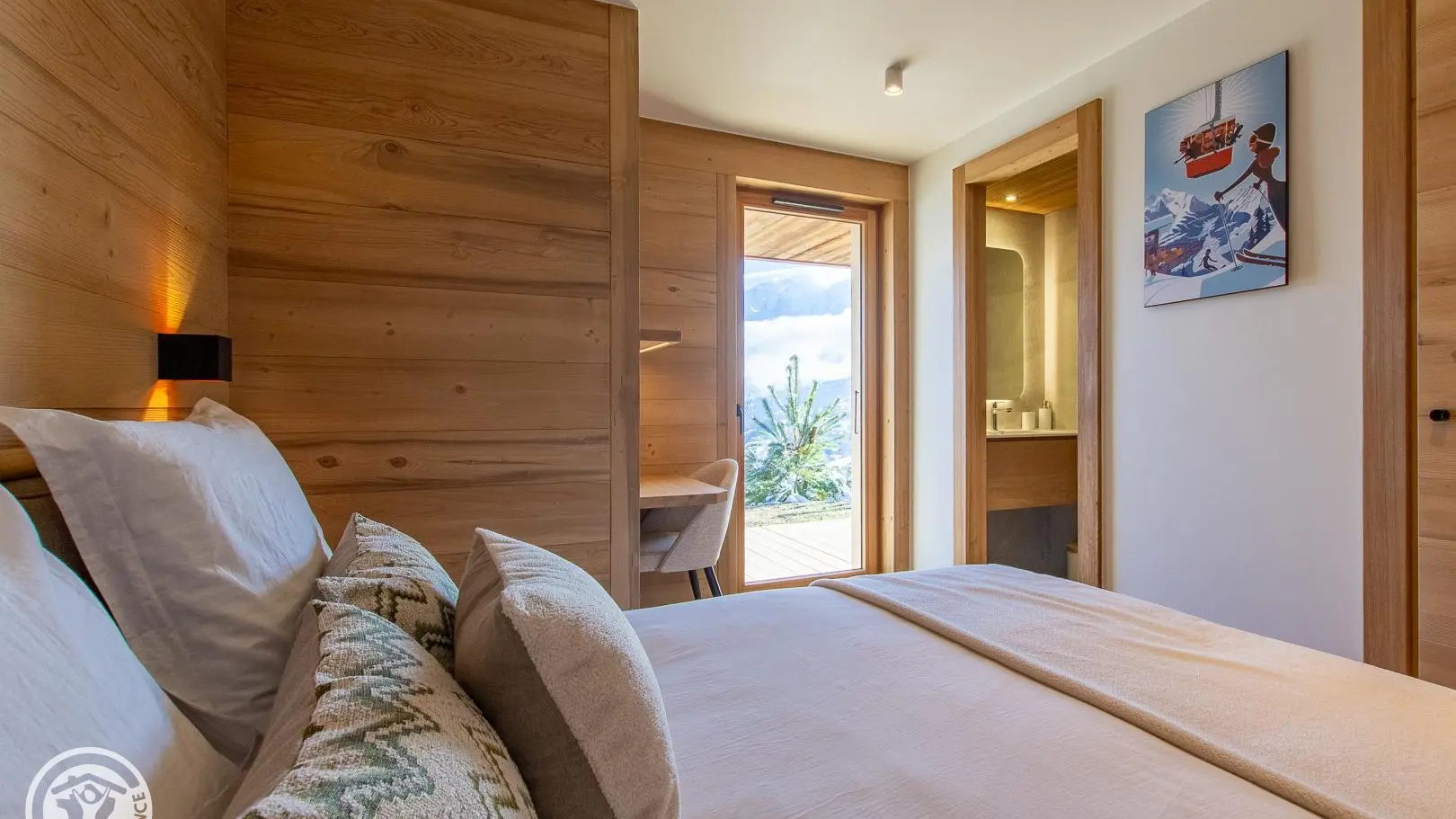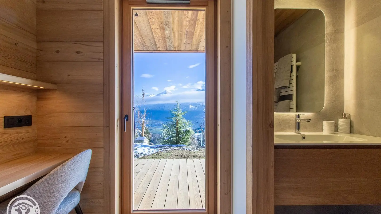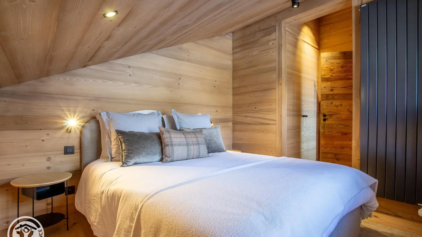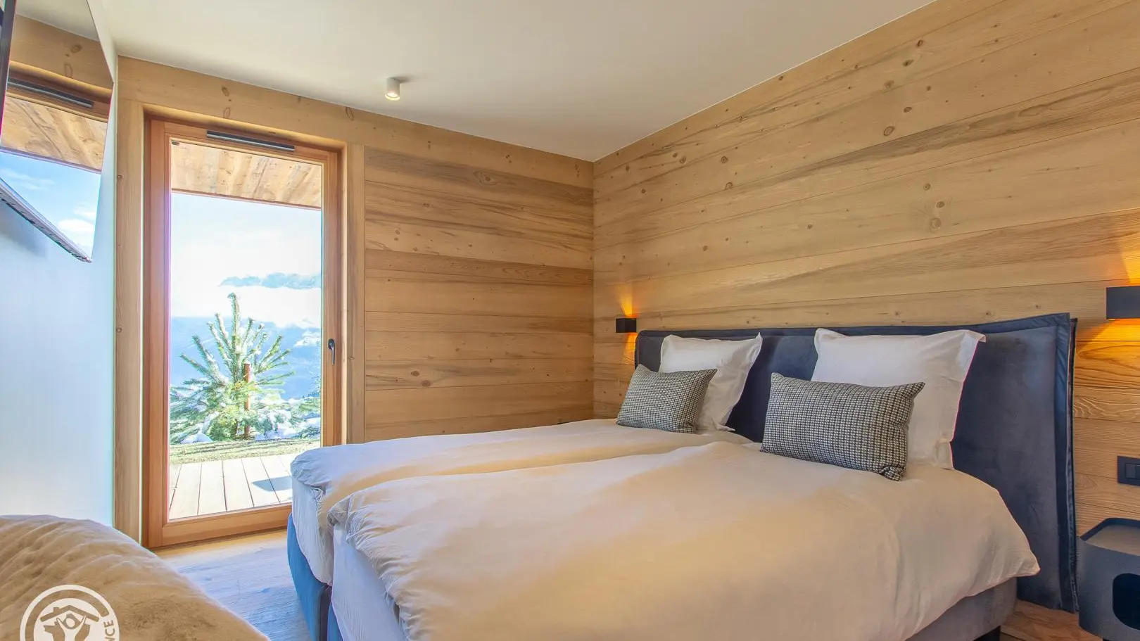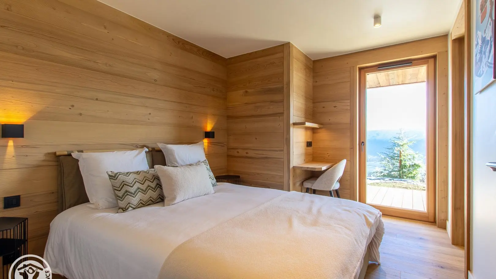 A l'étage du chalet : chambre 4 (1 lit 160x200cm, Tv, coin bureau, salle d'eau avec douche), chambre 5 (1 lit 160x200cm, Tv, salle d'eau semi-ouverte avec douche).