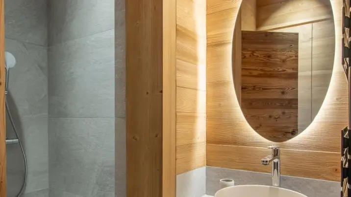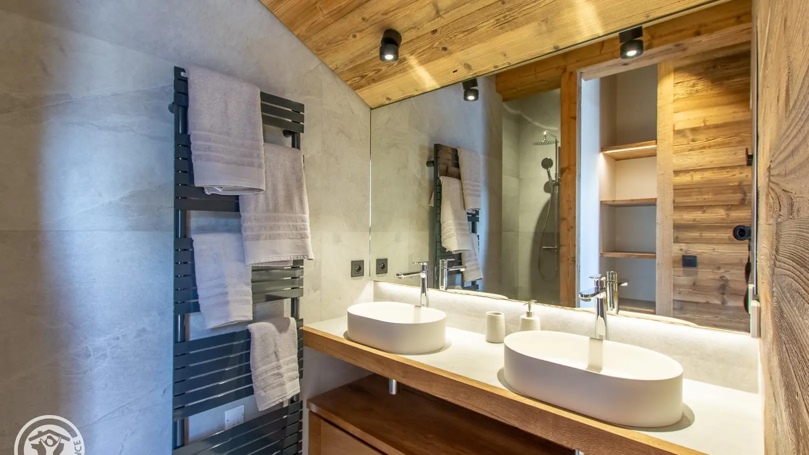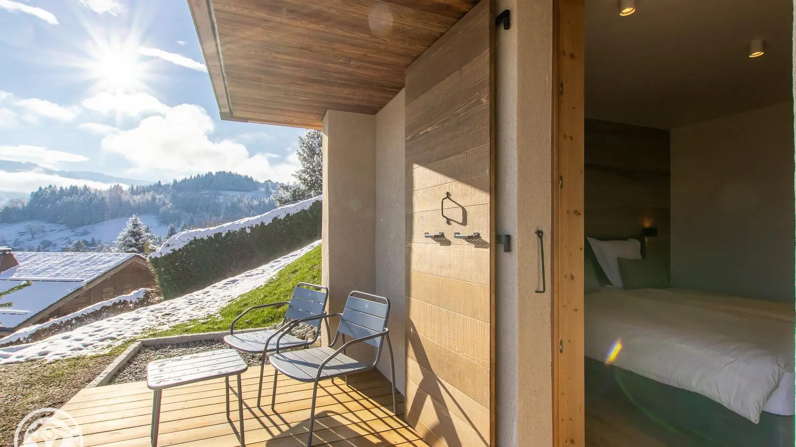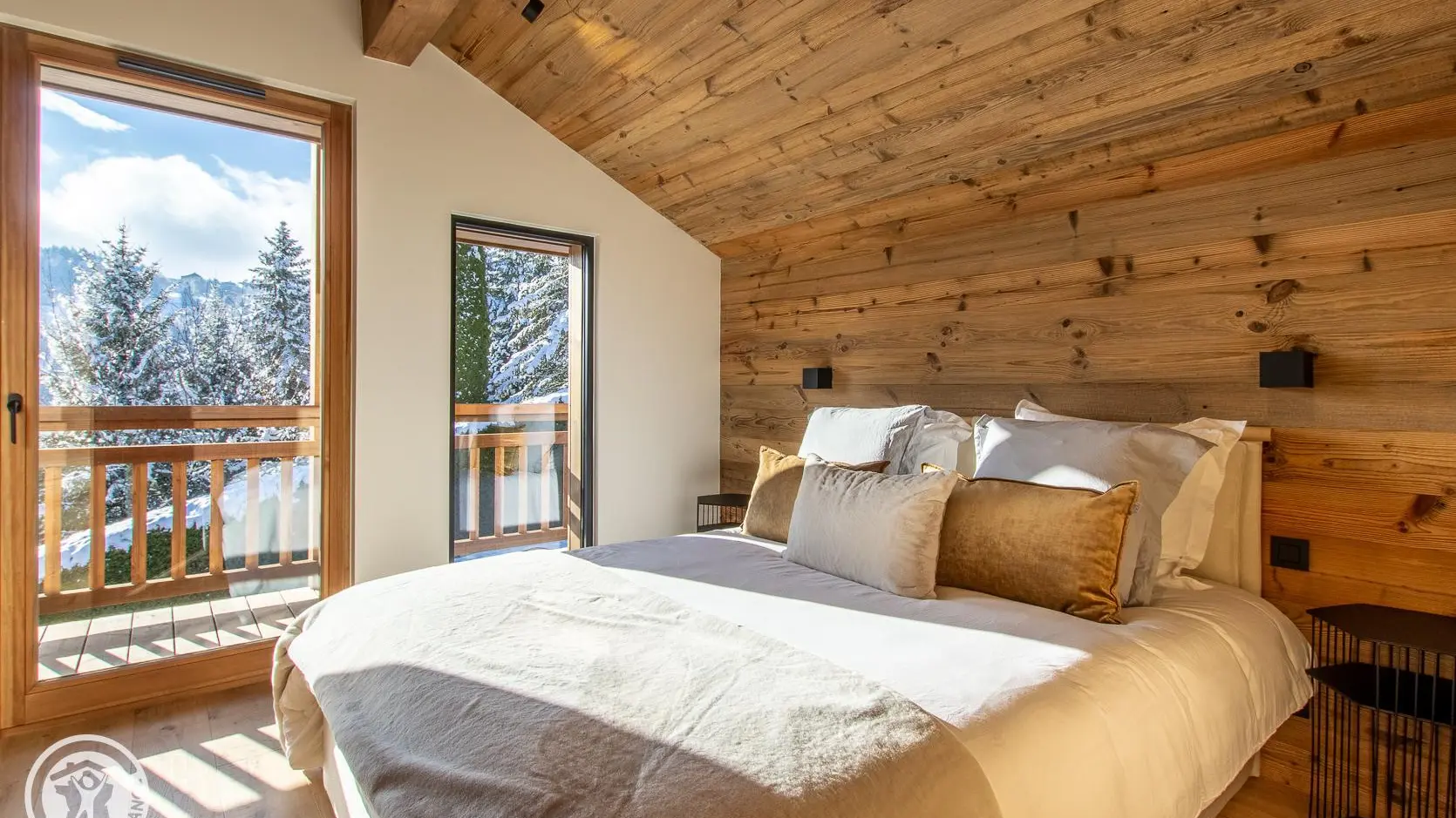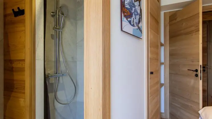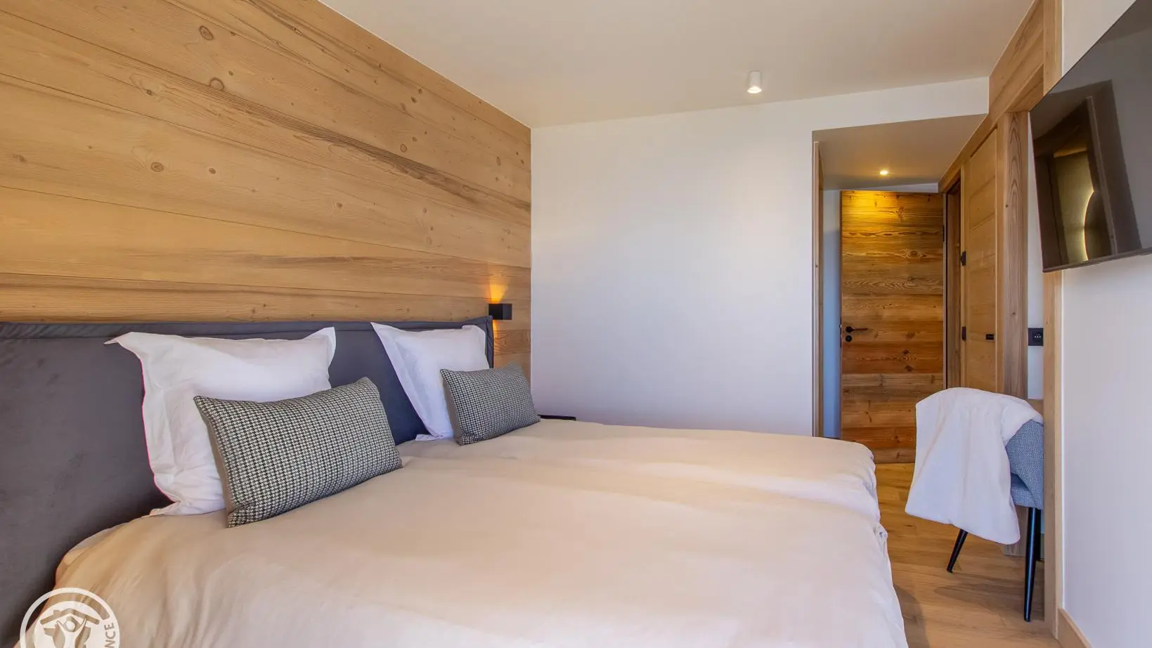 A l'étage du chalet : chambre 4 (1 lit 160x200cm, Tv, coin bureau, salle d'eau avec douche), chambre 5 (1 lit 160x200cm, Tv, salle d'eau semi-ouverte avec douche).