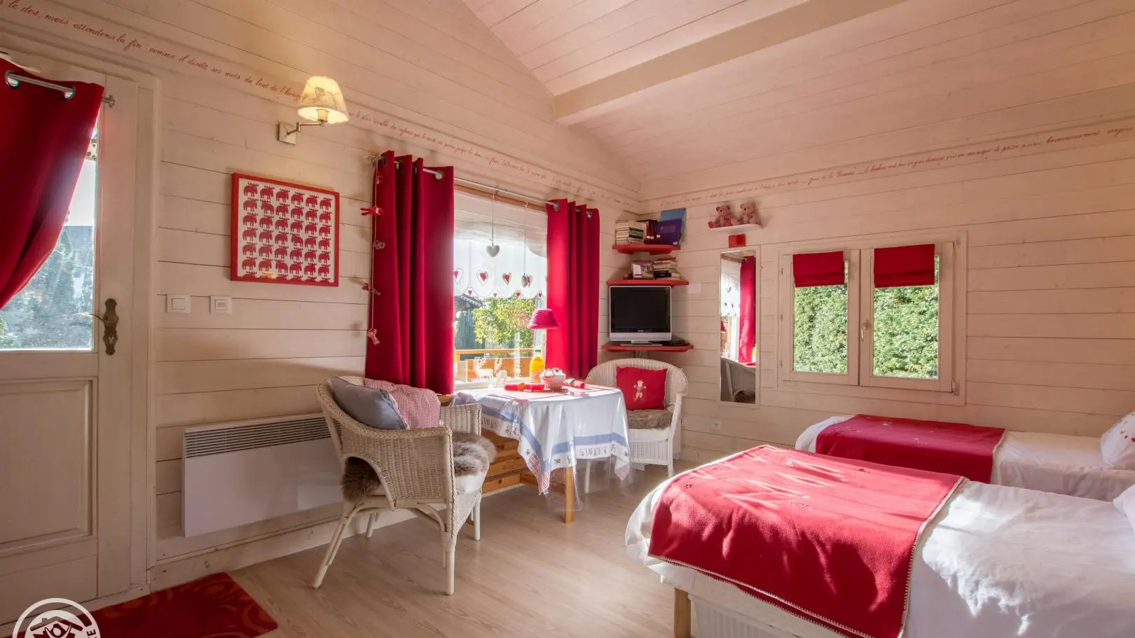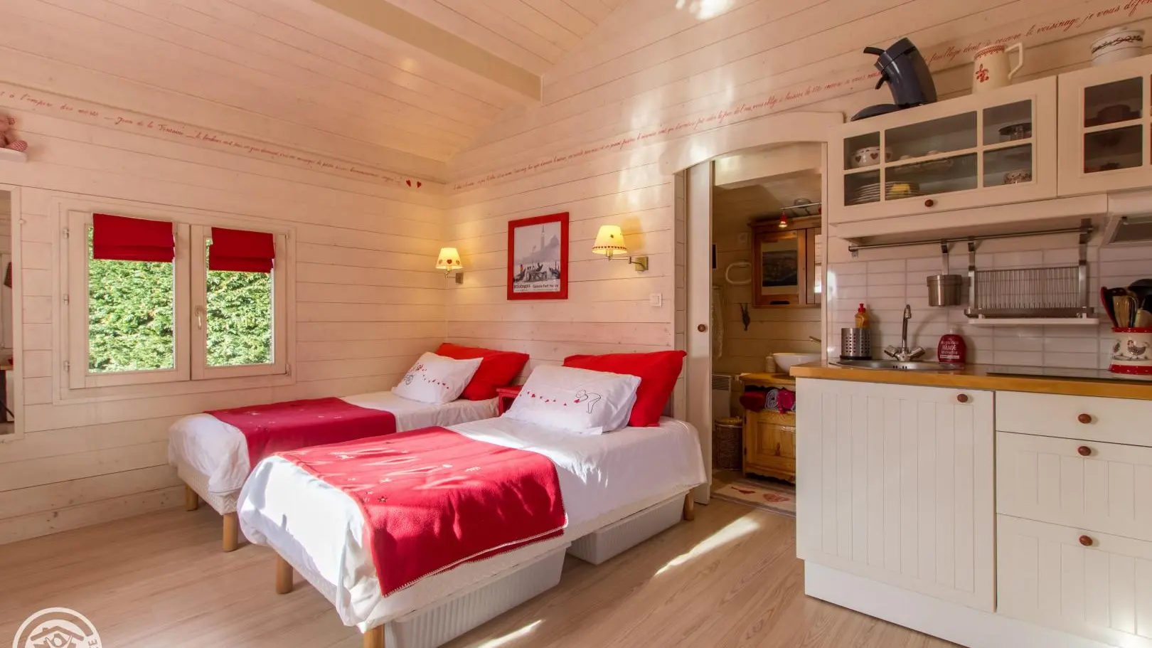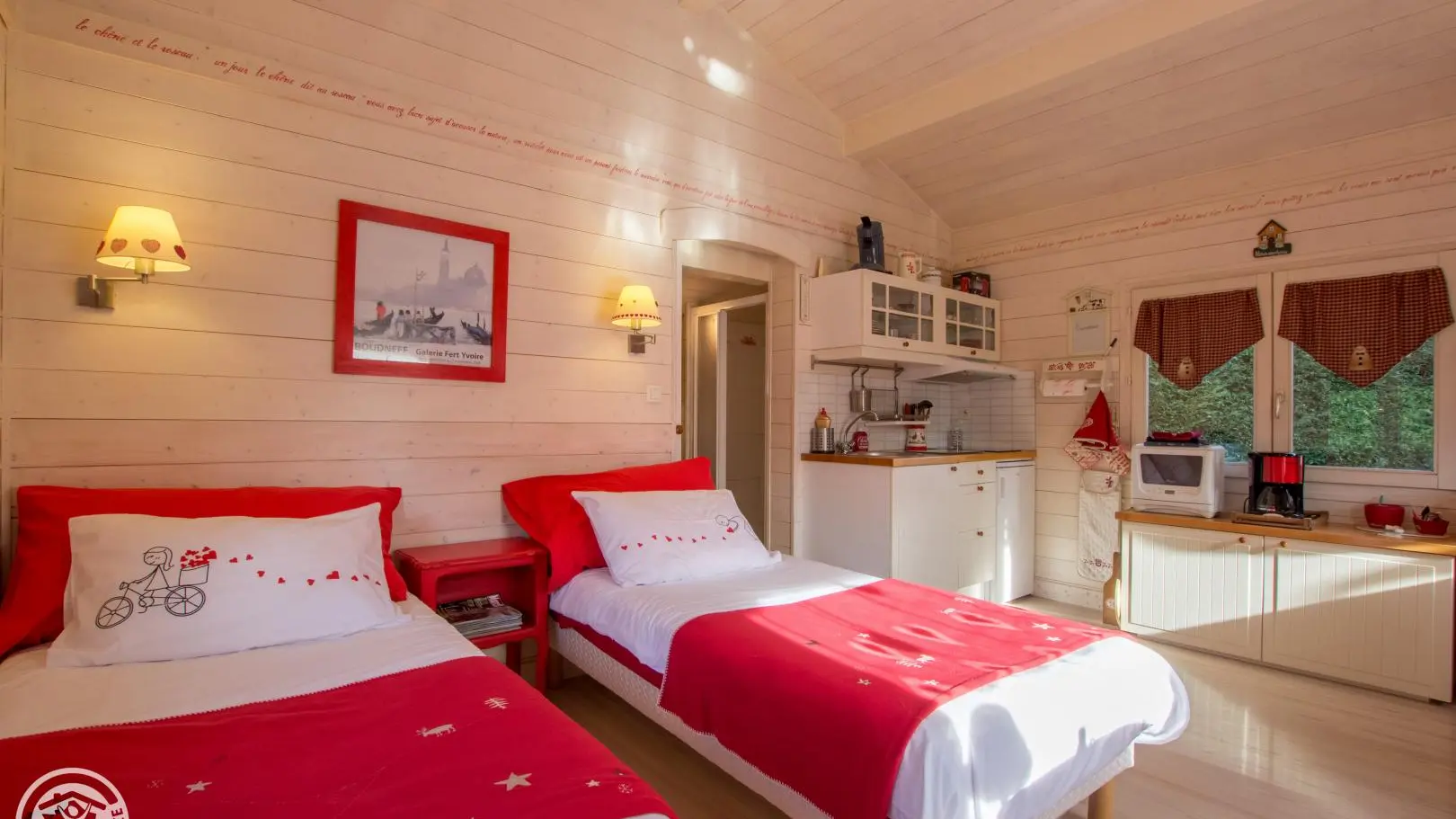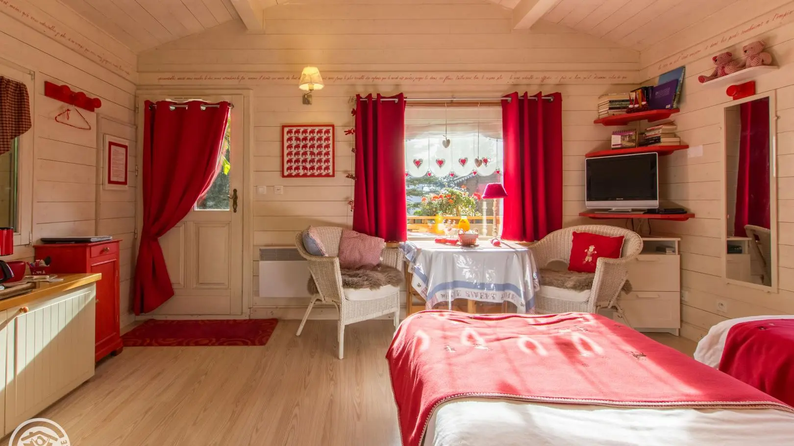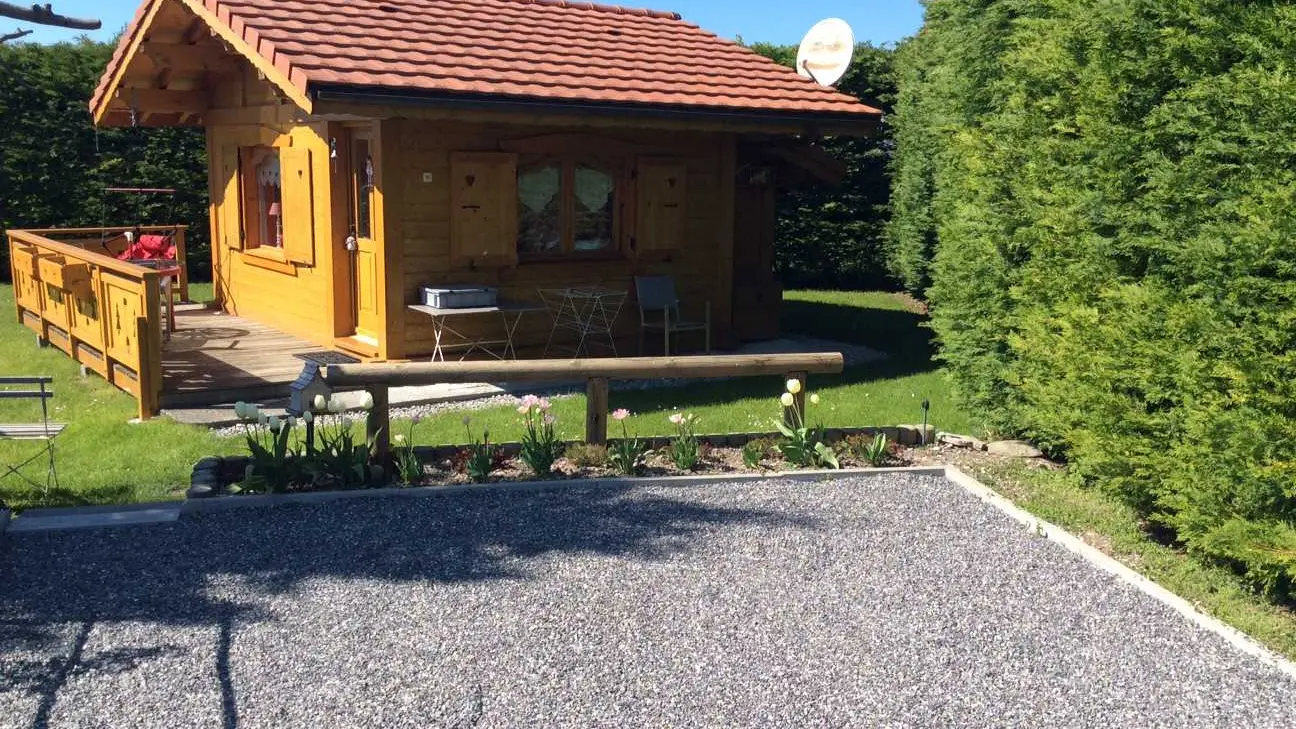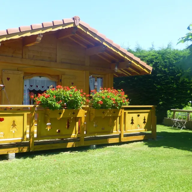D'une surface de 20 m2, ce petit chalet à l'intérieur cosy et chaleureux est un havre de paix , implanté sur un terrain engazonné , arboré et ombragé , doté d'une terrasse orientée sud ouest (table et chaises de jardin, transats ,parasol, grill plancha).