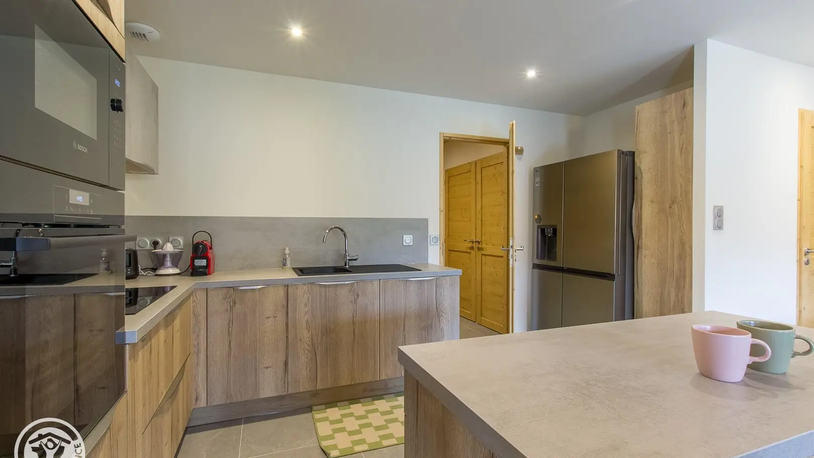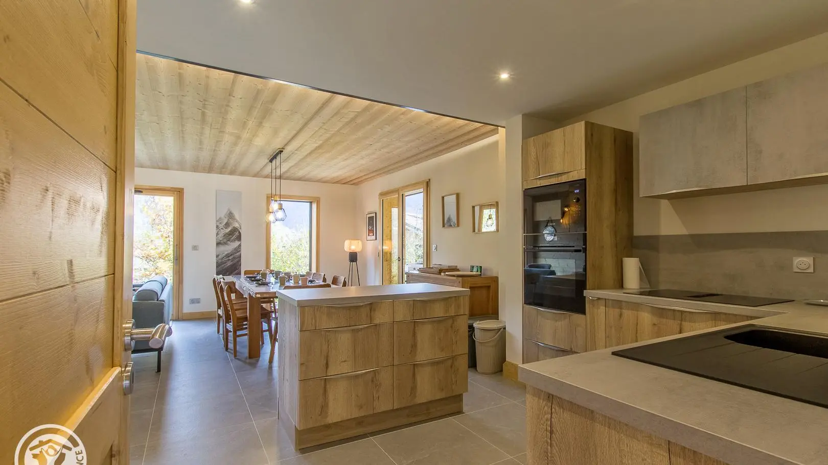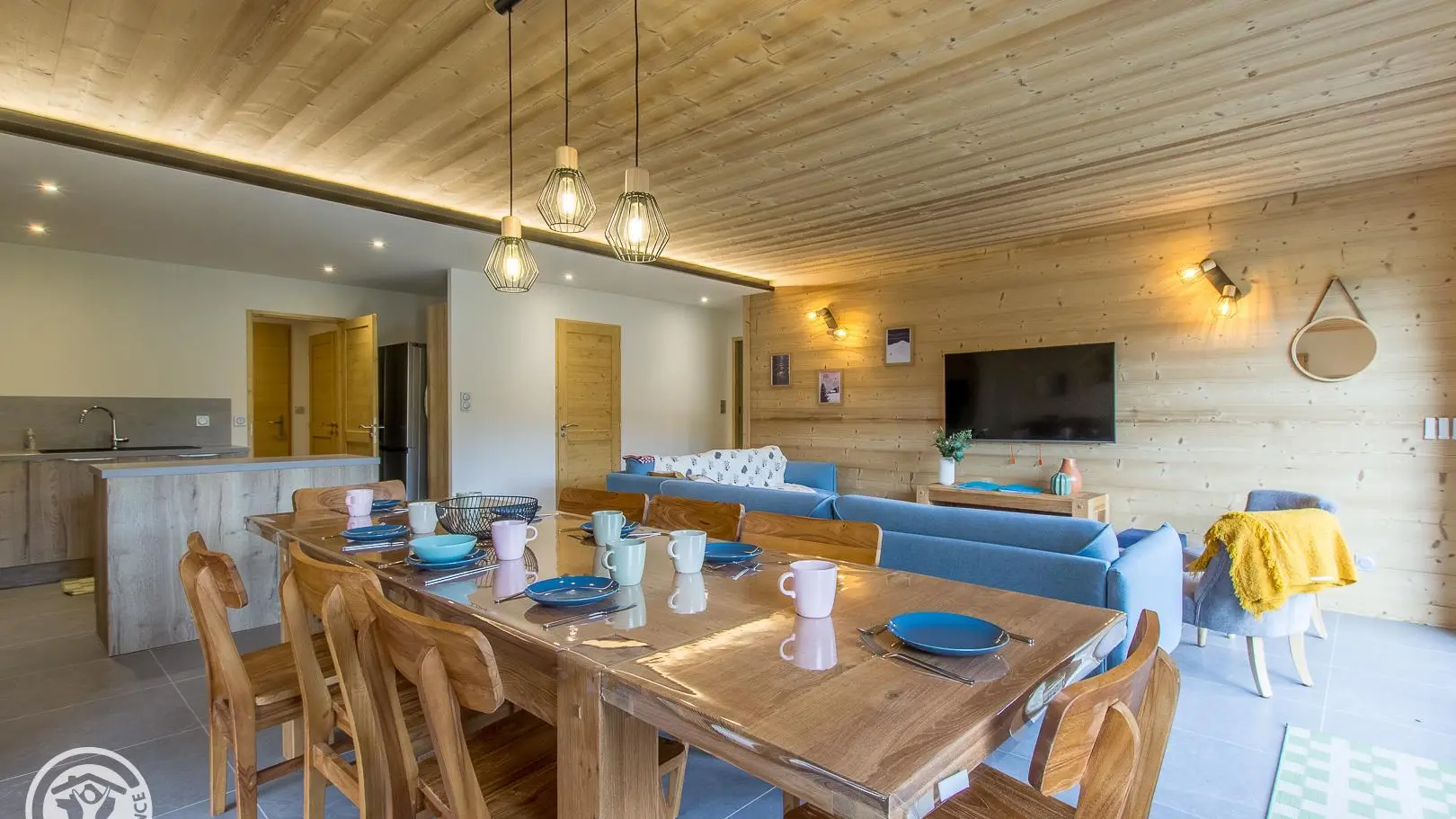 - Cuisine intégrée ouverte sur une grande pièce de vie (espace repas, coin salon avec Tv, enceinte connectée).