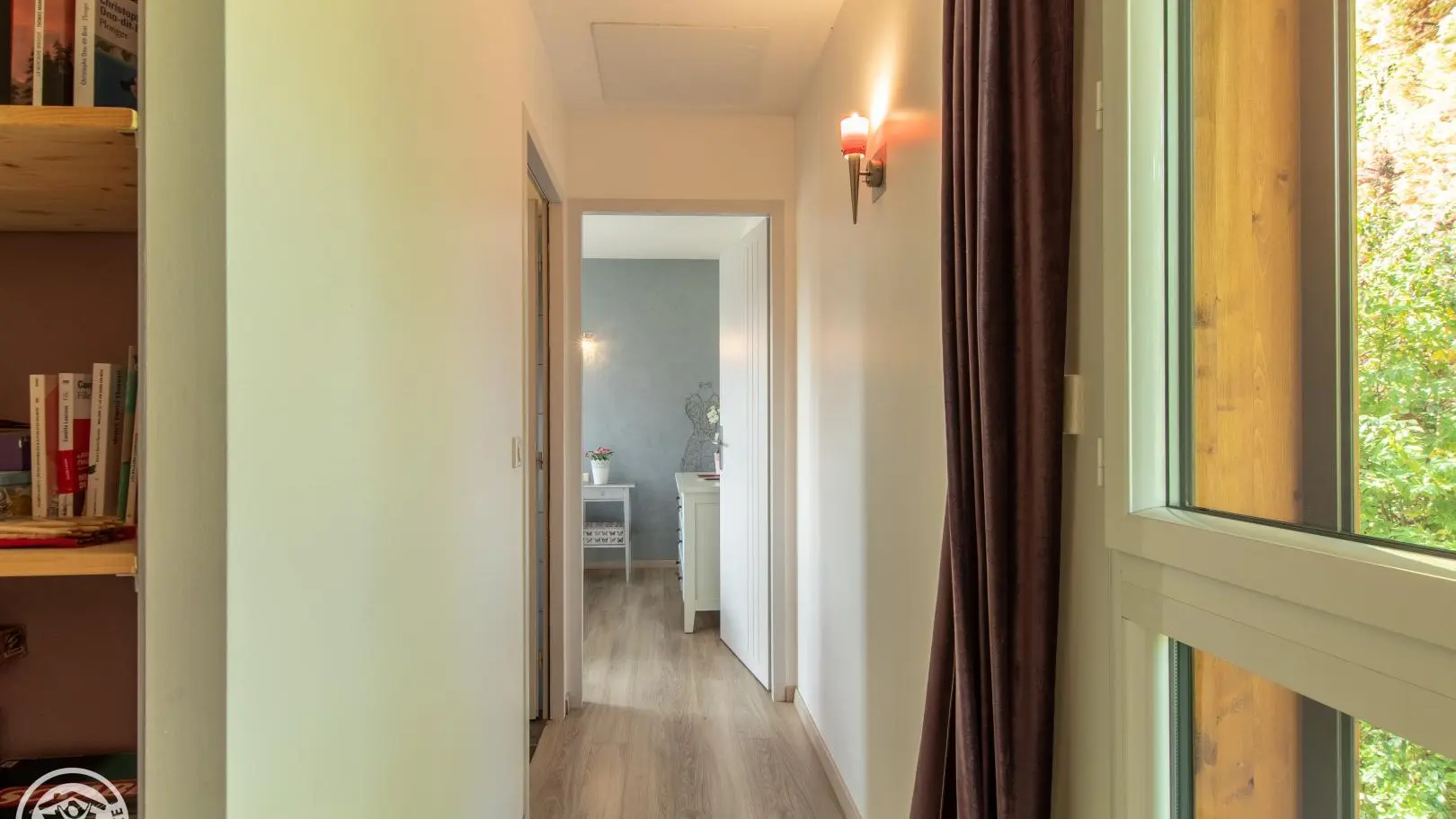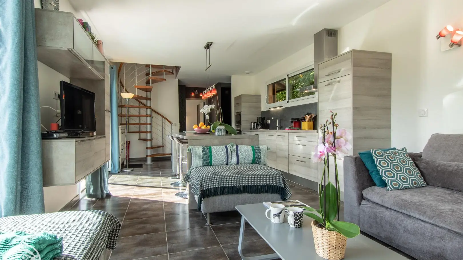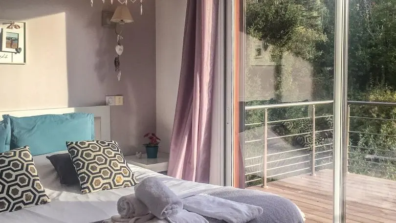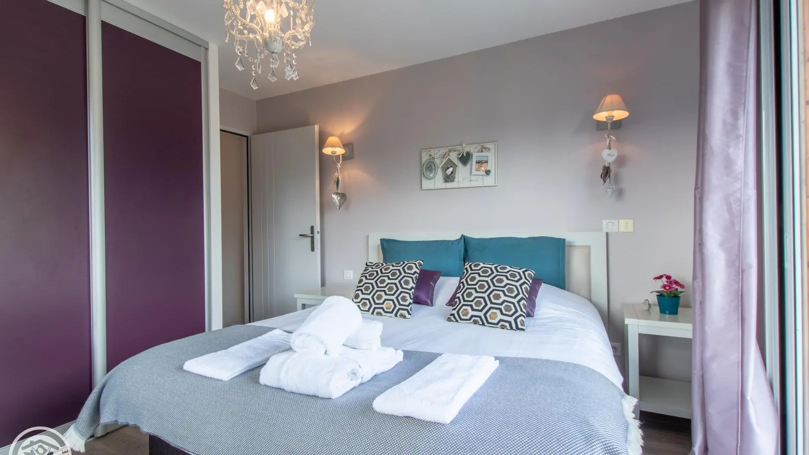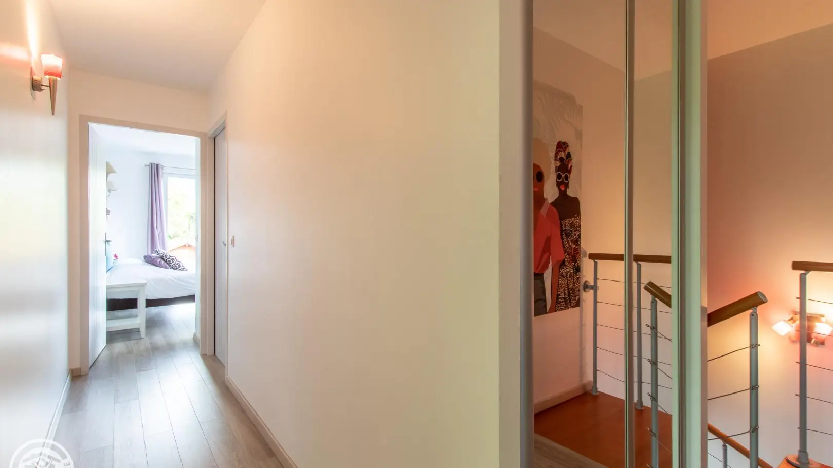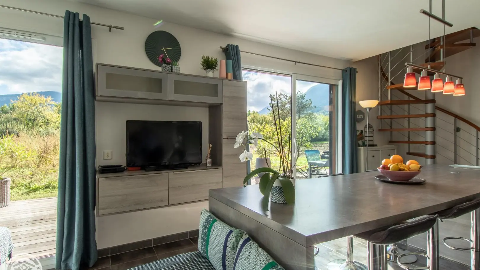 Gîte sur 2 niveaux dans une maison indépendante. Au rez-de-chaussée, ch1 (lit 160x200, accès terrasse sud, salle d'eau privative). WC indépendants. Vaste séjour comprenant une cuisine ouverte et table/ilot central, TV sur meuble et salon composé d'un canapé 2/3 places et banquettes. Poêle à bois (bois fournis) et accès terrasses sud et est. Escalier à colimaçons : accès ch2 (lit 160x200, balcon/terrasse est), ch3 (lit 140x190) et salle d'eau avec douche italienne + double vasque et WC.