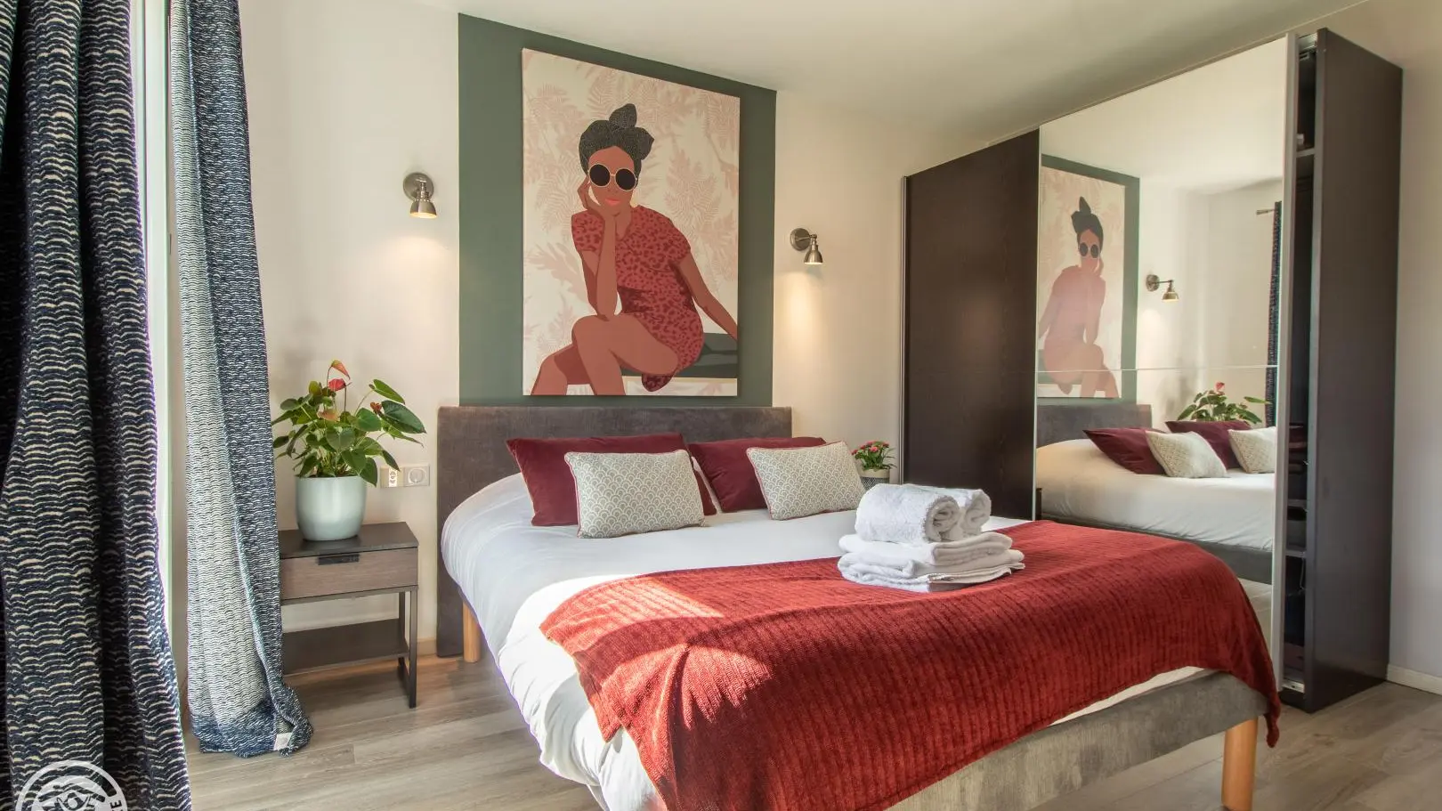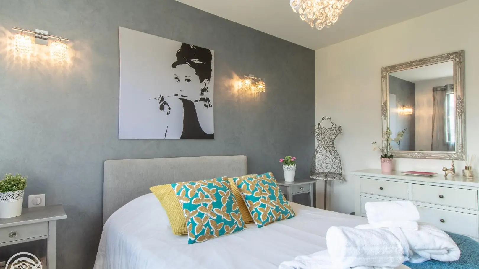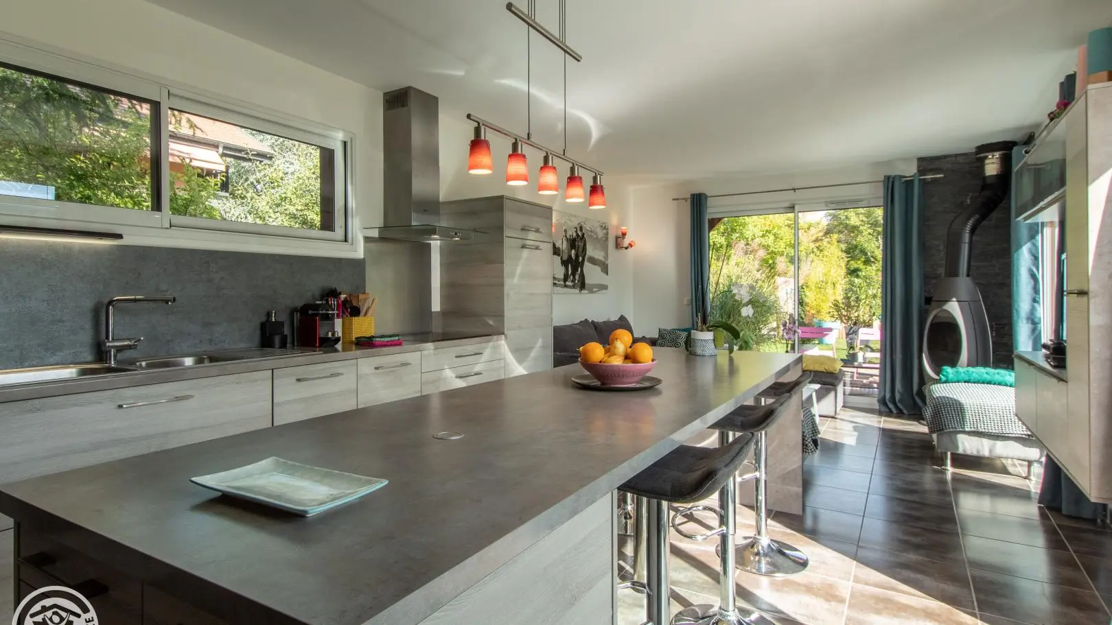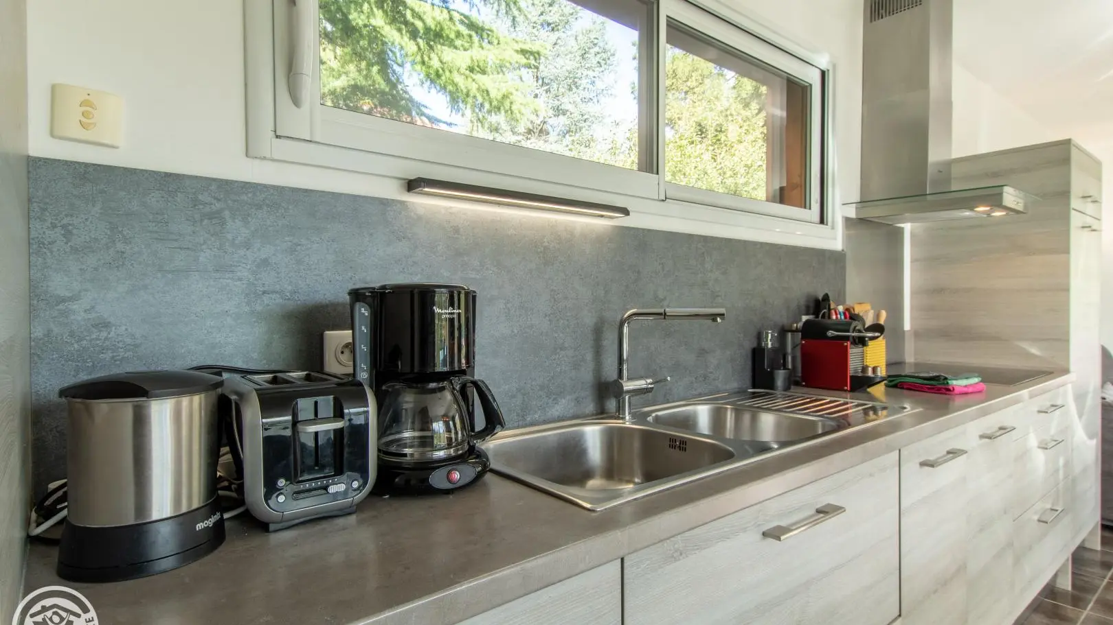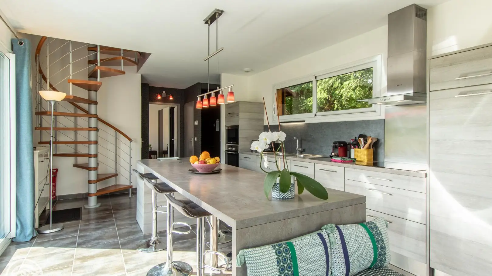 Gîte sur 2 niveaux dans une maison indépendante. Au rez-de-chaussée, ch1 (lit 160x200, accès terrasse sud, salle d'eau privative). WC indépendants. Vaste séjour comprenant une cuisine ouverte et table/ilot central, TV sur meuble et salon composé d'un canapé 2/3 places et banquettes. Poêle à bois (bois fournis) et accès terrasses sud et est. Escalier à colimaçons : accès ch2 (lit 160x200, balcon/terrasse est), ch3 (lit 140x190) et salle d'eau avec douche italienne + double vasque et WC.