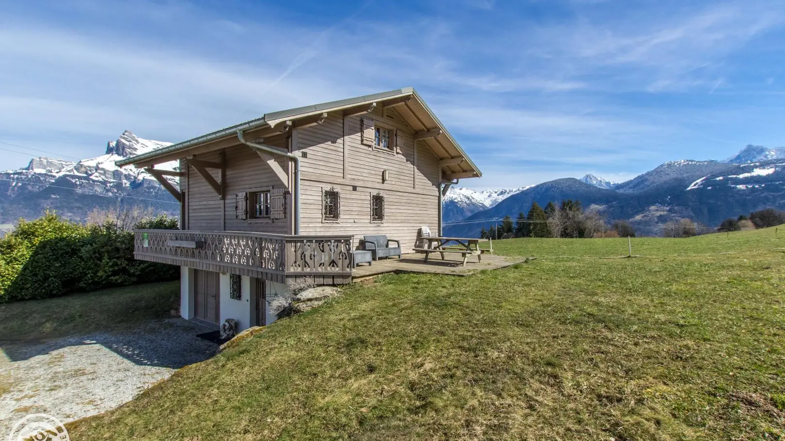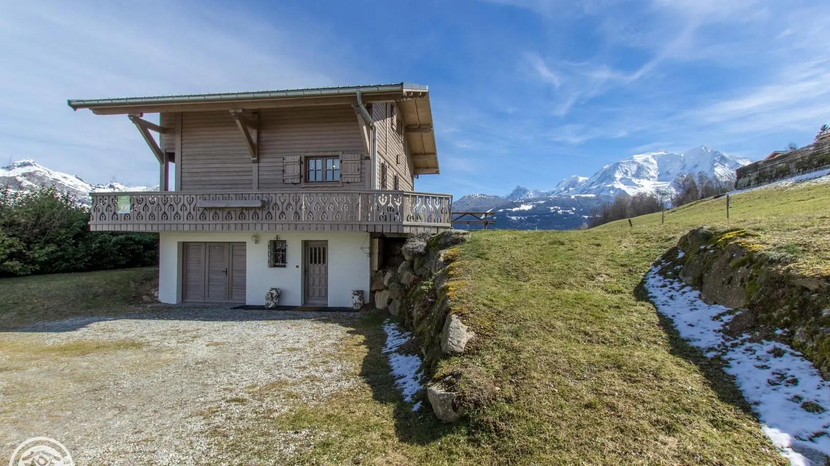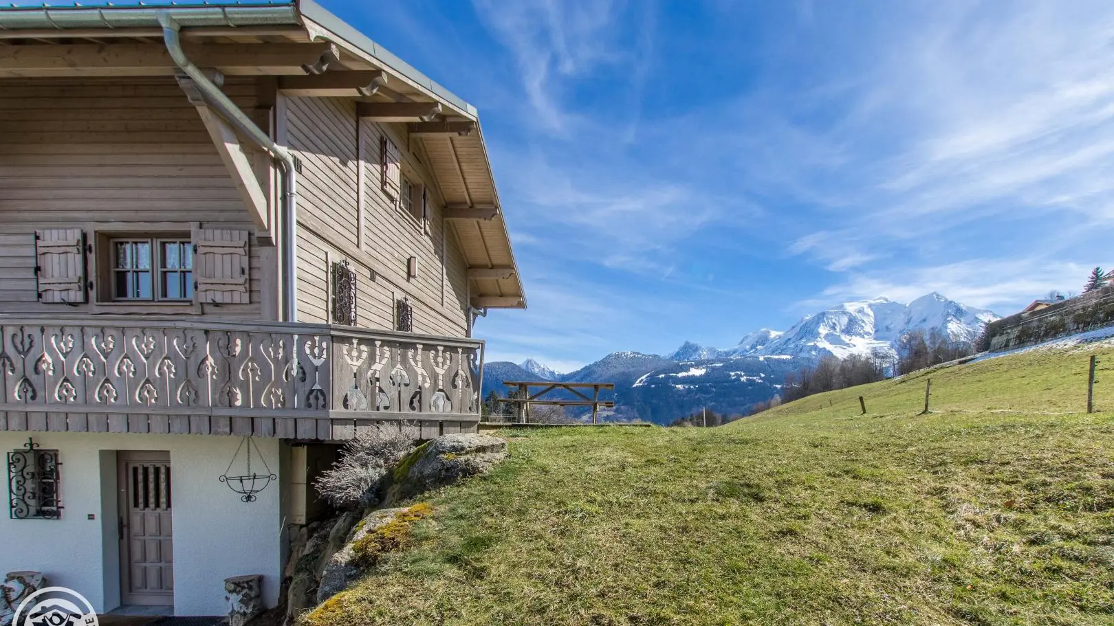 Dans un cadre exceptionnel, au milieu des prés : chalet individuel de 102m2 aménagé sur 3 niveaux, et offrant une vue à 360° sur les massifs environnants (Mont-Blanc, Aravis, Aiguilles de Warens, ainsi que sur le village de Combloux