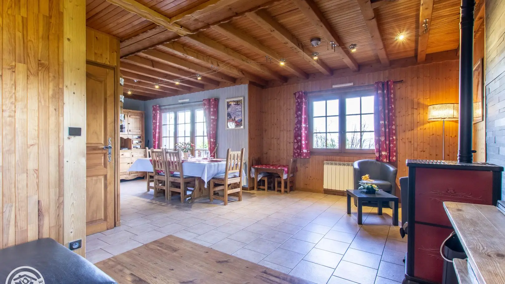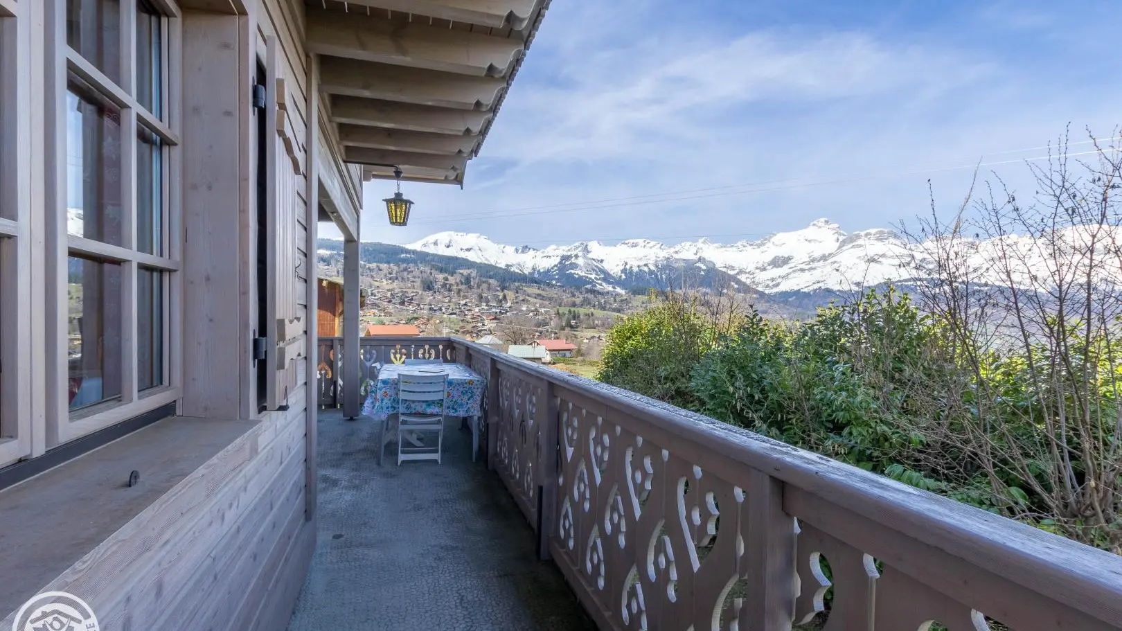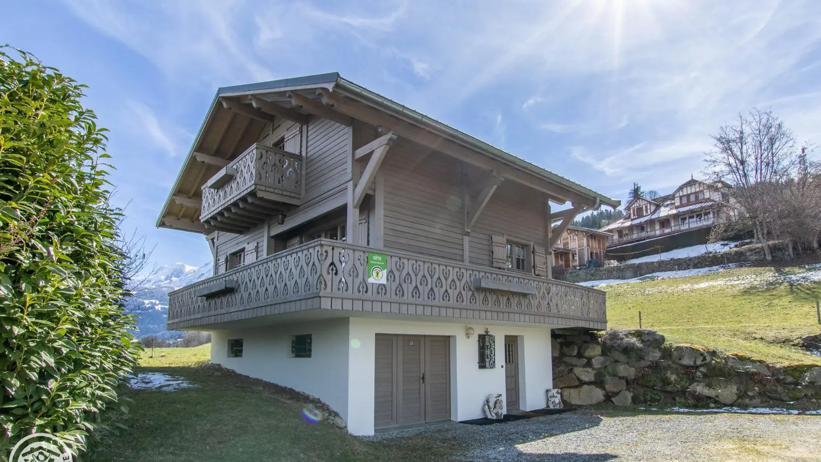Dans un cadre exceptionnel, au milieu des prés : chalet individuel de 102m2 aménagé sur 3 niveaux, et offrant une vue à 360° sur les massifs environnants (Mont-Blanc, Aravis, Aiguilles de Warens, ainsi que sur le village de Combloux