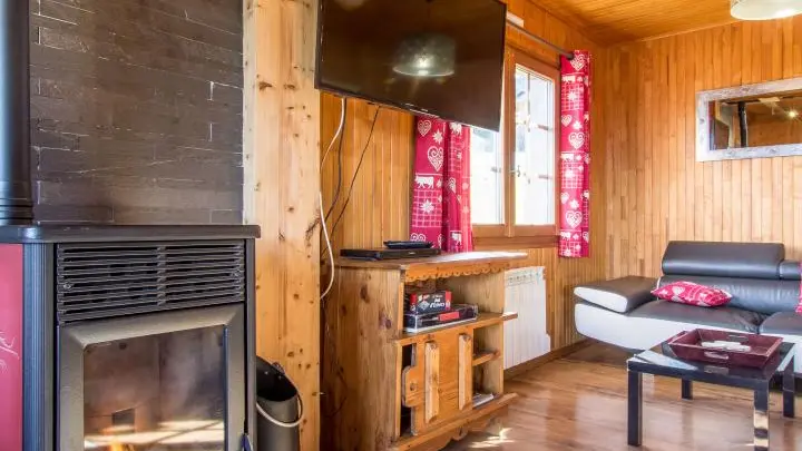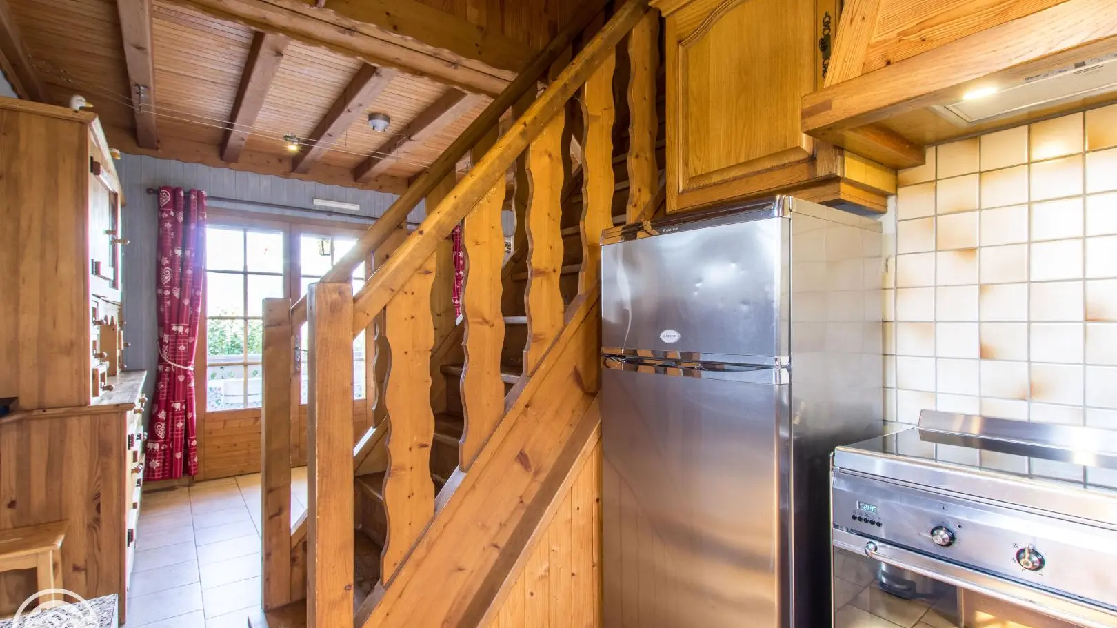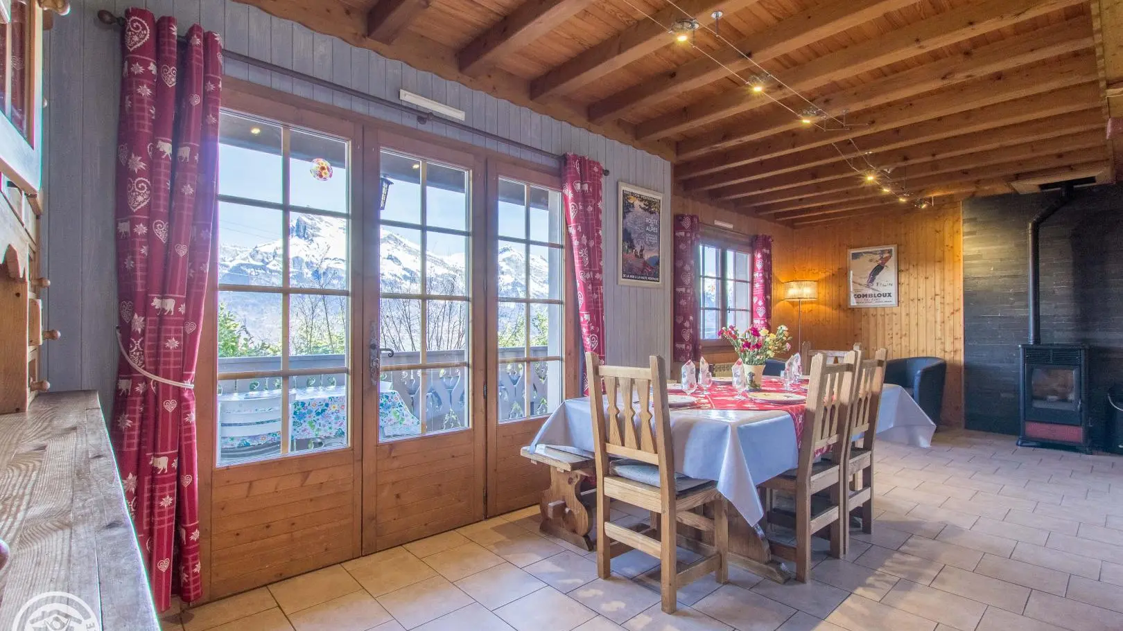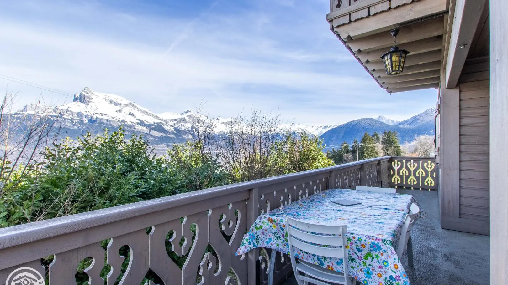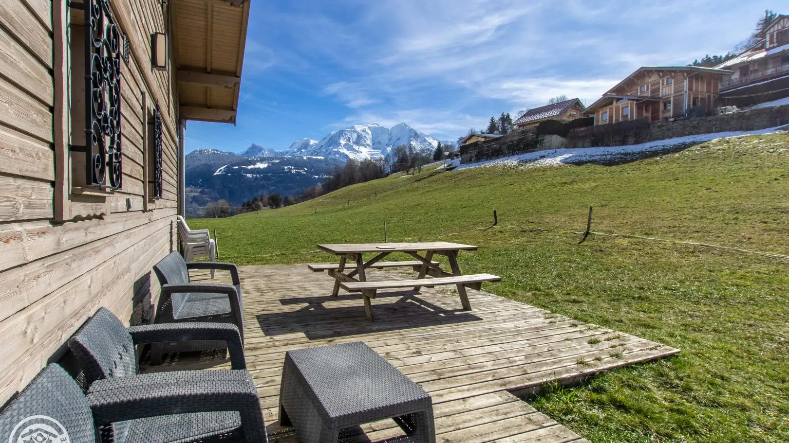 Au 1er : cuisine intégrée, séjour avec coin salon (Tv, canapé, poêle à granulés), salle de bains (baignoire), wc indépendant, balcon, terrasse face Mont-Blanc (parasol, table forestière, plancha).
