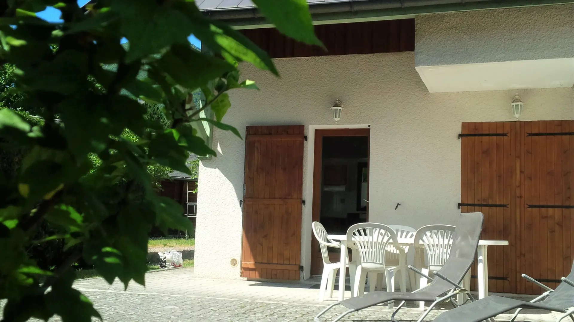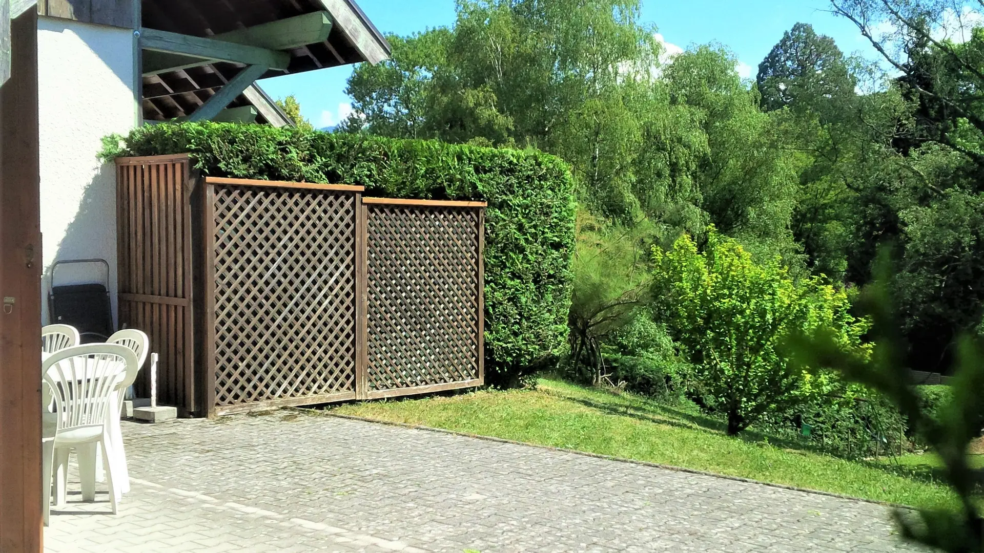 Grande terrasse avec salon de jardin, bains de soleil, parasol, barbecue (bois) privé