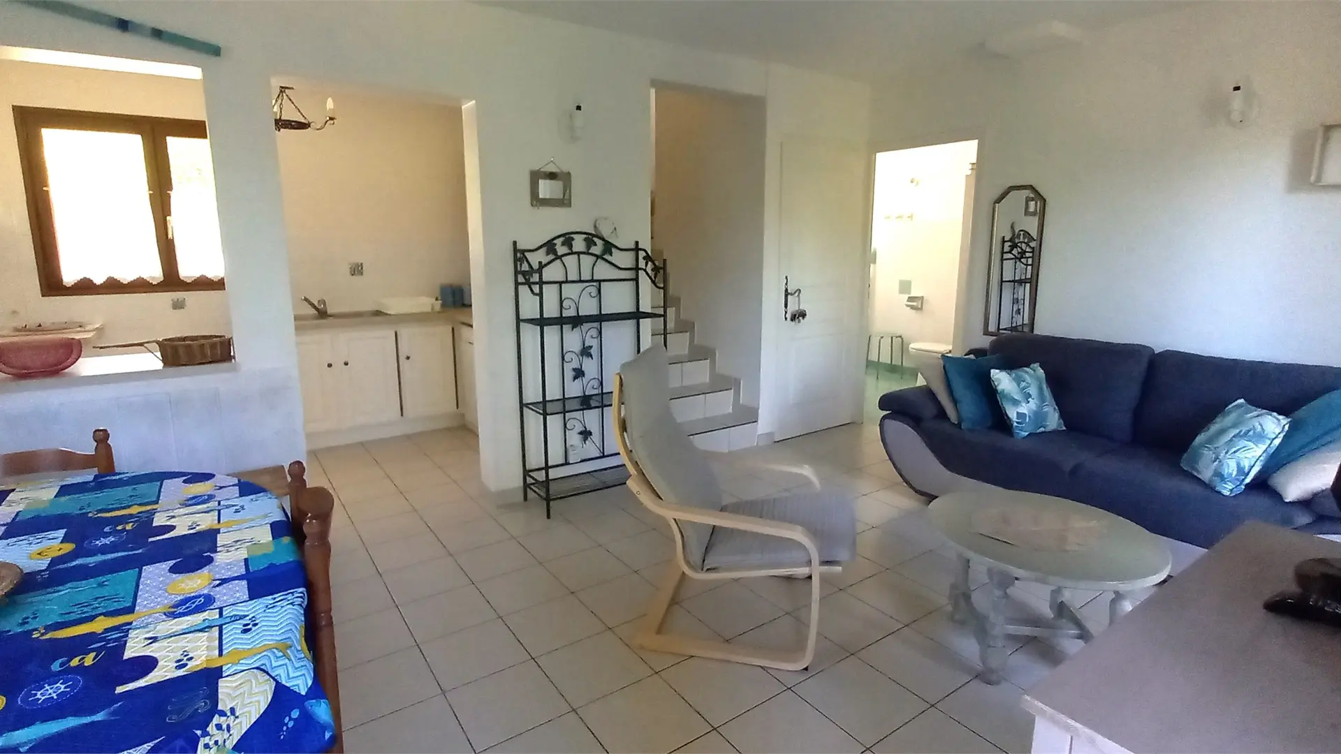 Séjour avec coin salon canapé, fauteuil, TV et coin salle à manger, cuisine américaine (Cafetière, bouilloire, grille-pain, micro-ondes, Réfrigérateur, cuisinière avec four et hotte, vaisselle), lave-vaisselle.
